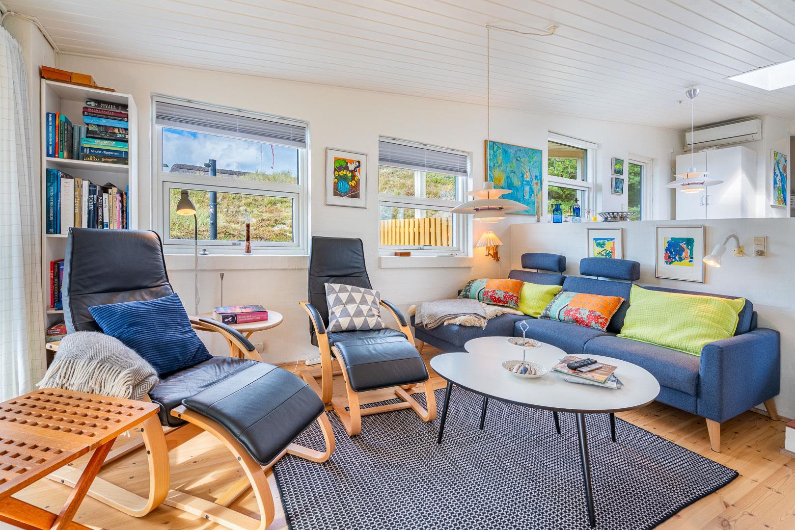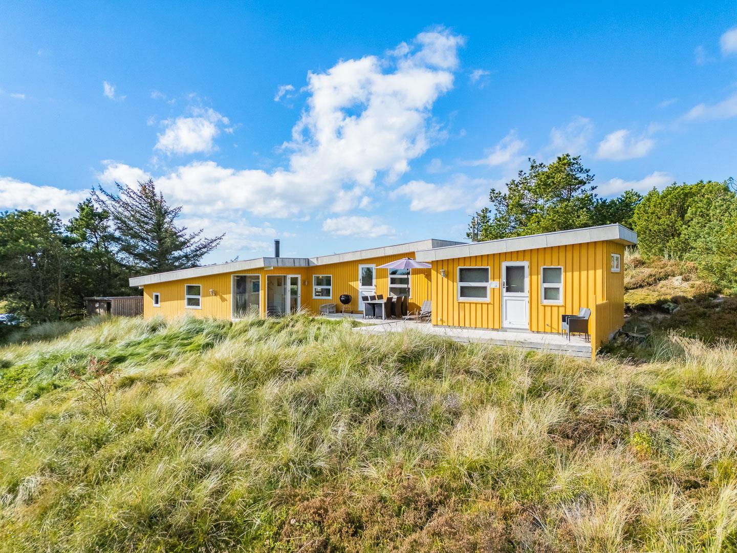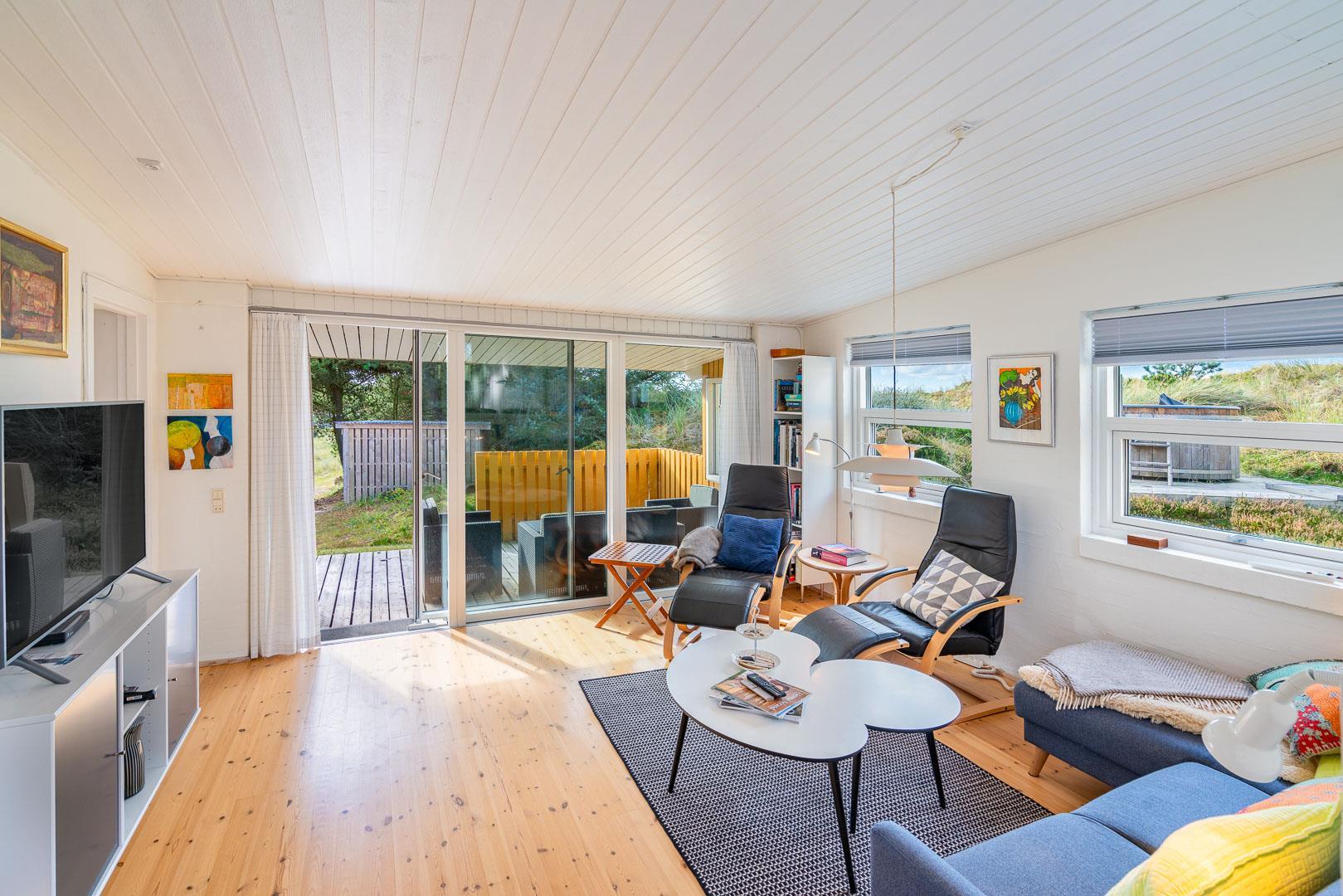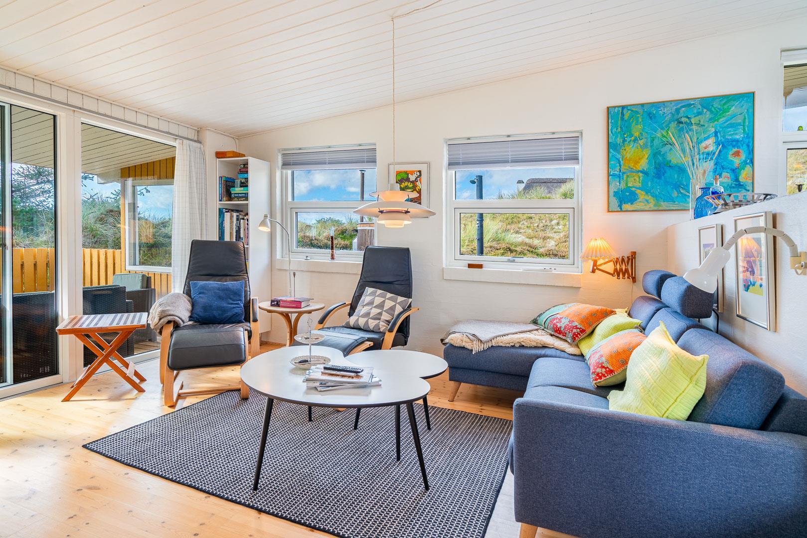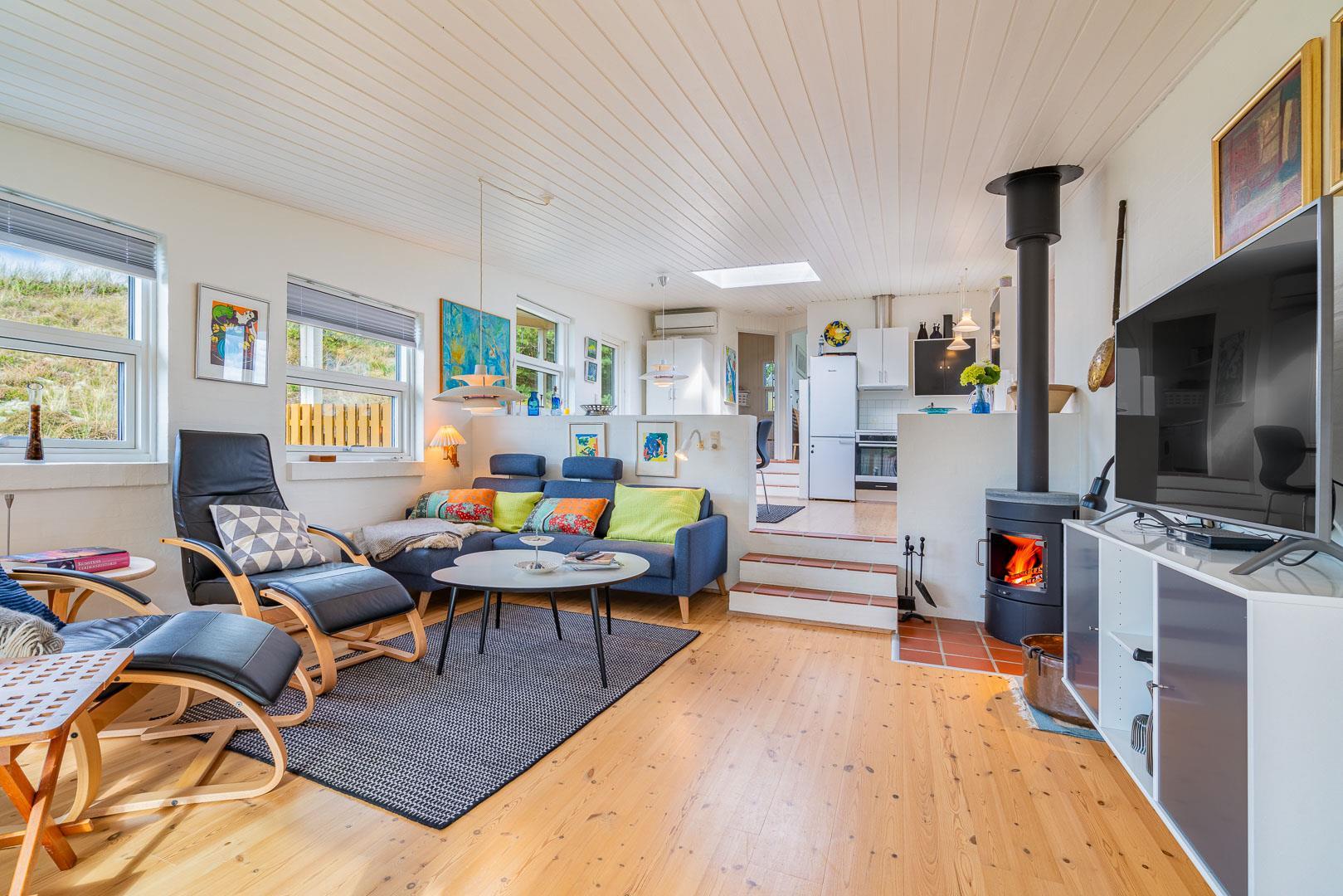 Naturskønt beliggende i hjertet af Henne Strand finder du dette indbydende sommerhus til 6 personer, kun 700 meter fra den smukke Vesterhavskyst. Sommerhuset er stilfuldt indrettet med friske farver og en hyggelig atmosfære. De forskellige niveauer i sommerhuset skaber en spændende og charmerende dynamik – blandt andet med tre trin, der leder dig fra det fine køkken og spisestue ned til en hyggelig stue. Her kan du nyde varmen fra brændeovnen, læse en god bog eller blot slappe af med udsigten til den omkringliggende natur. Fra stuen er der direkte udgang til en af de dejlige terrasser, der indbyder til afslapning i solens stråler.