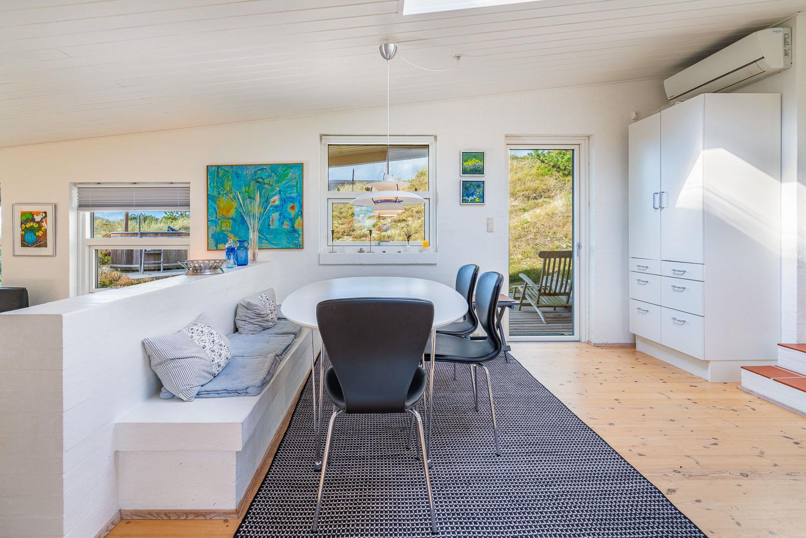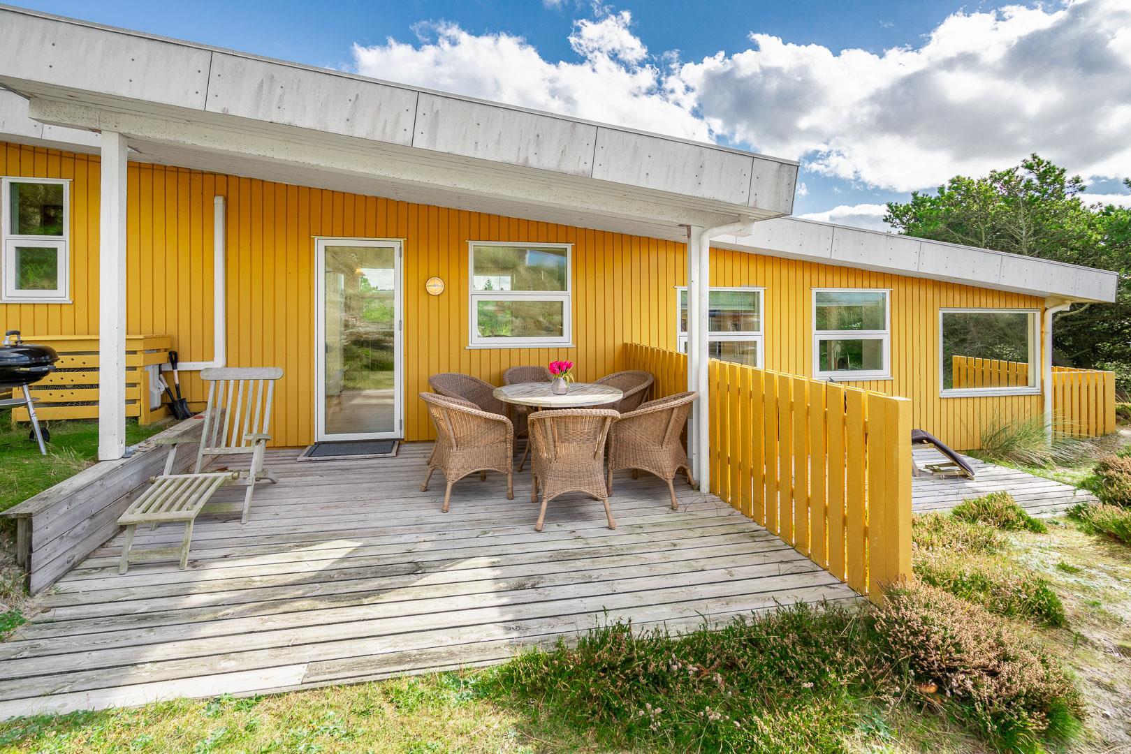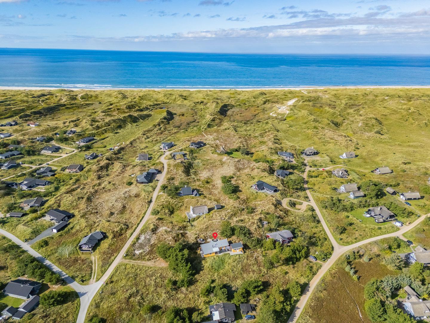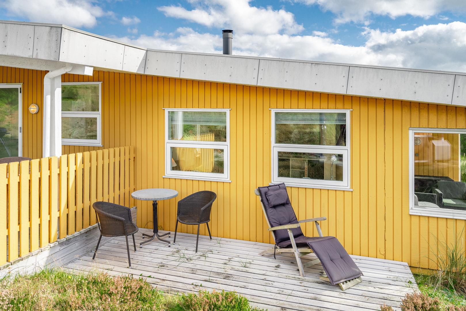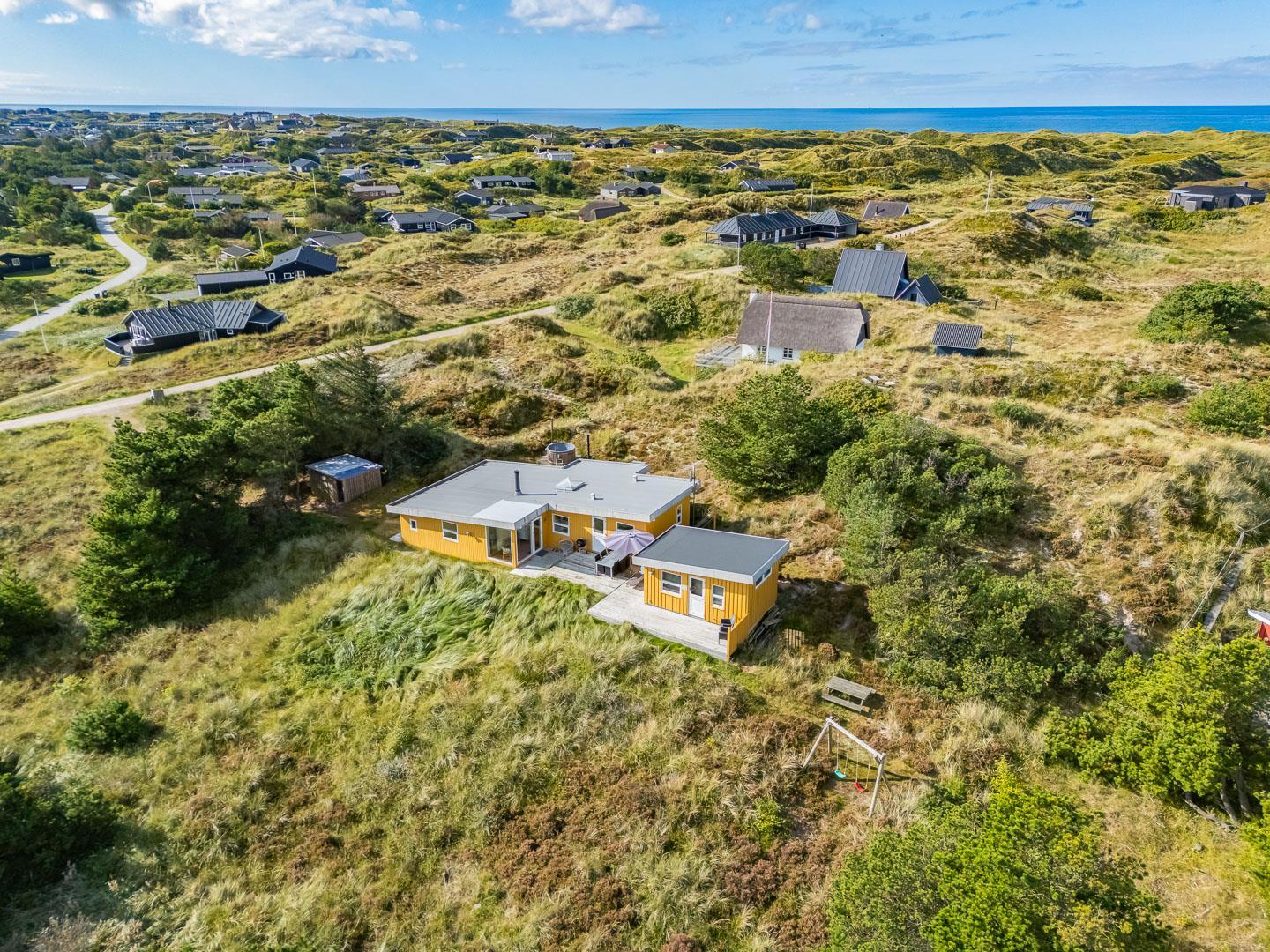 Naturskønt beliggende i hjertet af Henne Strand finder du dette indbydende sommerhus til 6 personer, kun 700 meter fra den smukke Vesterhavskyst. Sommerhuset er stilfuldt indrettet med friske farver og en hyggelig atmosfære. De forskellige niveauer i sommerhuset skaber en spændende og charmerende dynamik – blandt andet med tre trin, der leder dig fra det fine køkken og spisestue ned til en hyggelig stue. Her kan du nyde varmen fra brændeovnen, læse en god bog eller blot slappe af med udsigten til den omkringliggende natur. Fra stuen er der direkte udgang til en af de dejlige terrasser, der indbyder til afslapning i solens stråler.