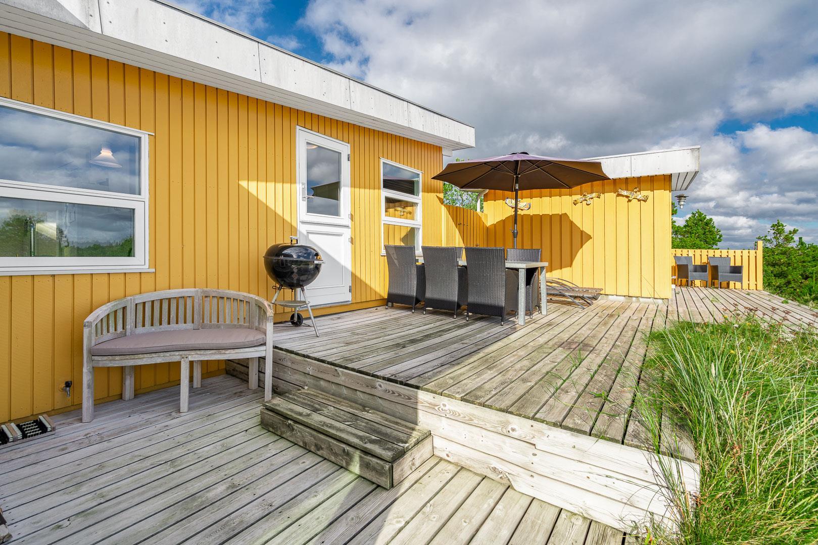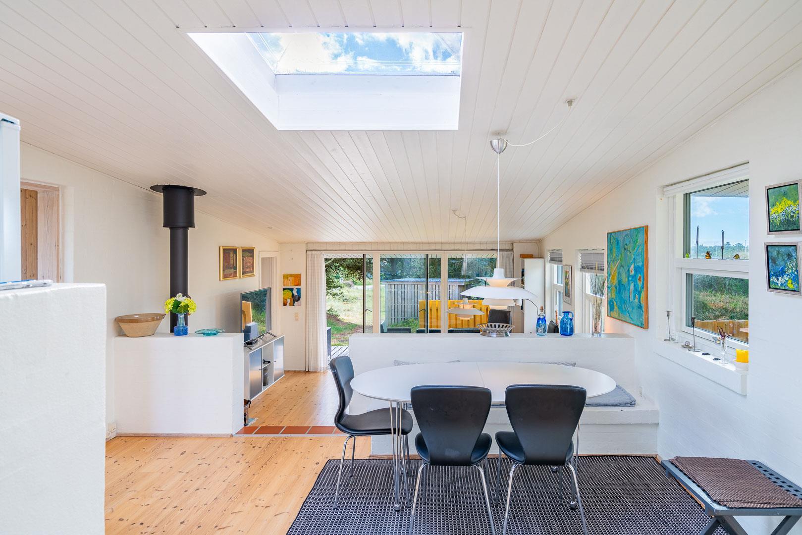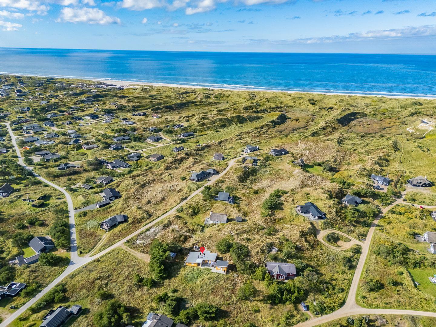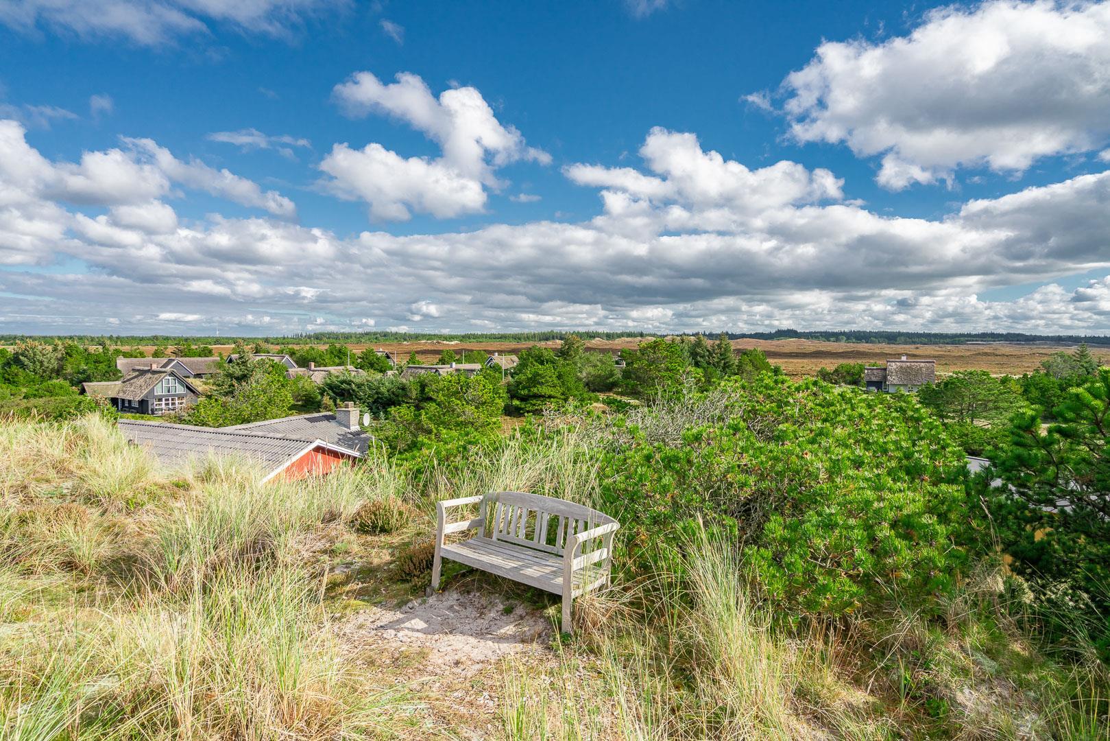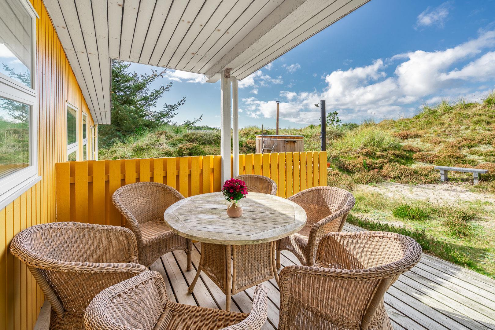 Naturskønt beliggende i hjertet af Henne Strand finder du dette indbydende sommerhus til 6 personer, kun 700 meter fra den smukke Vesterhavskyst. Sommerhuset er stilfuldt indrettet med friske farver og en hyggelig atmosfære. De forskellige niveauer i sommerhuset skaber en spændende og charmerende dynamik – blandt andet med tre trin, der leder dig fra det fine køkken og spisestue ned til en hyggelig stue. Her kan du nyde varmen fra brændeovnen, læse en god bog eller blot slappe af med udsigten til den omkringliggende natur. Fra stuen er der direkte udgang til en af de dejlige terrasser, der indbyder til afslapning i solens stråler.