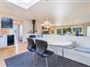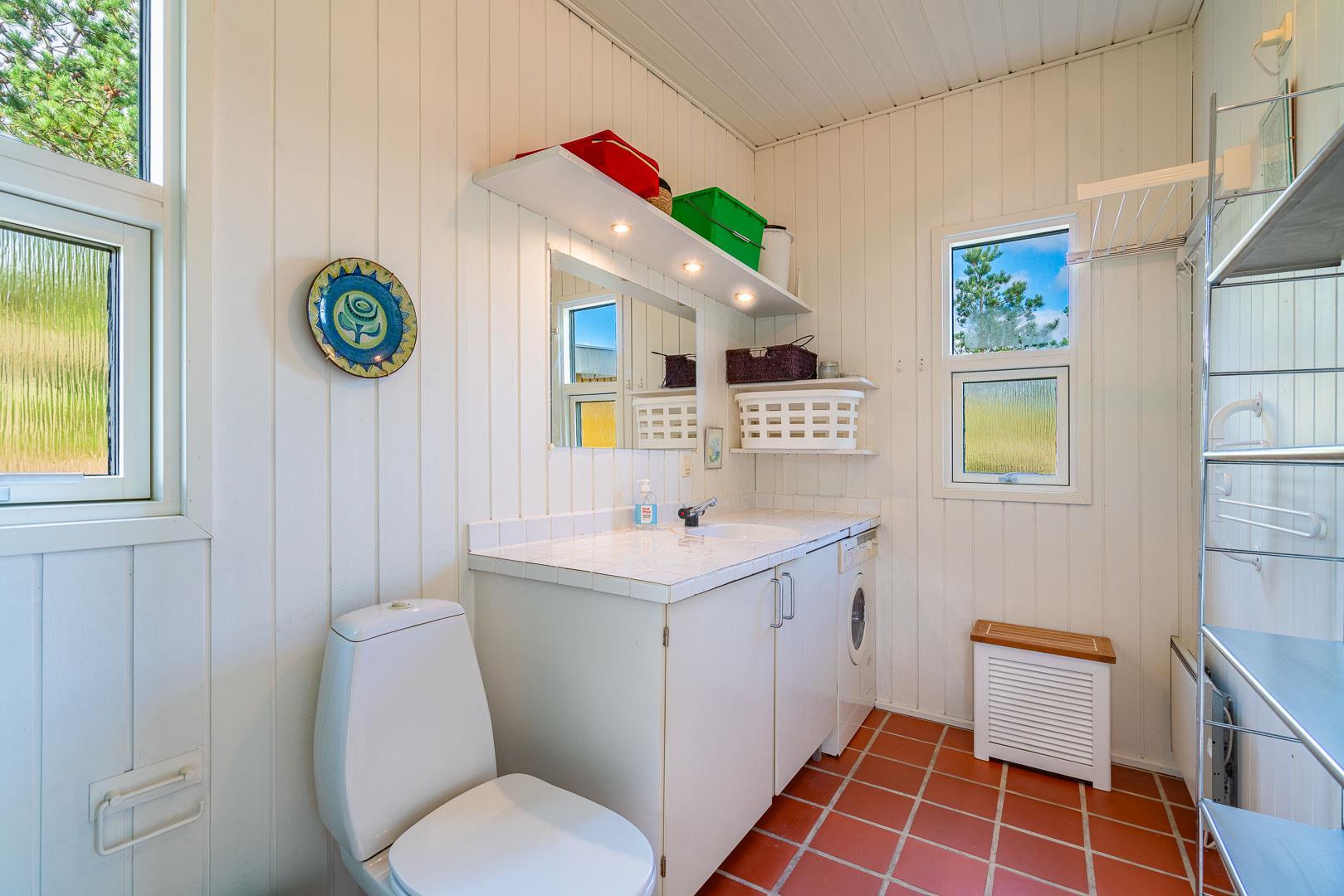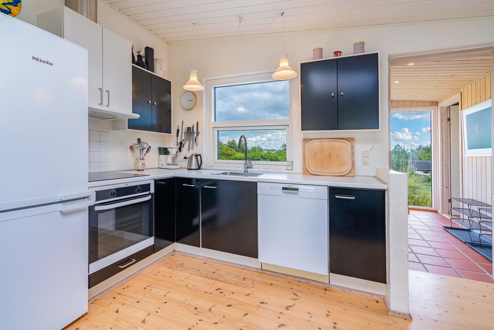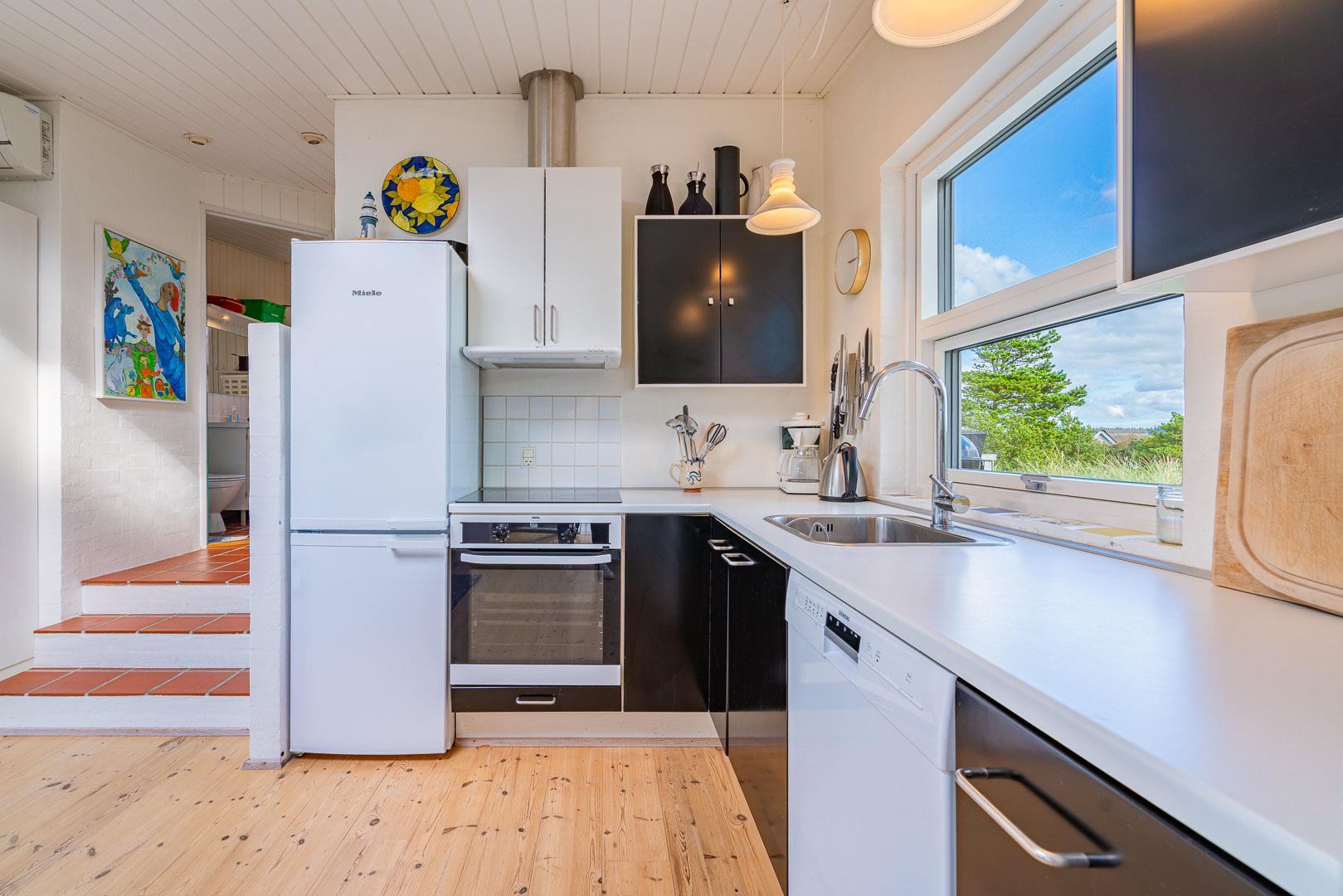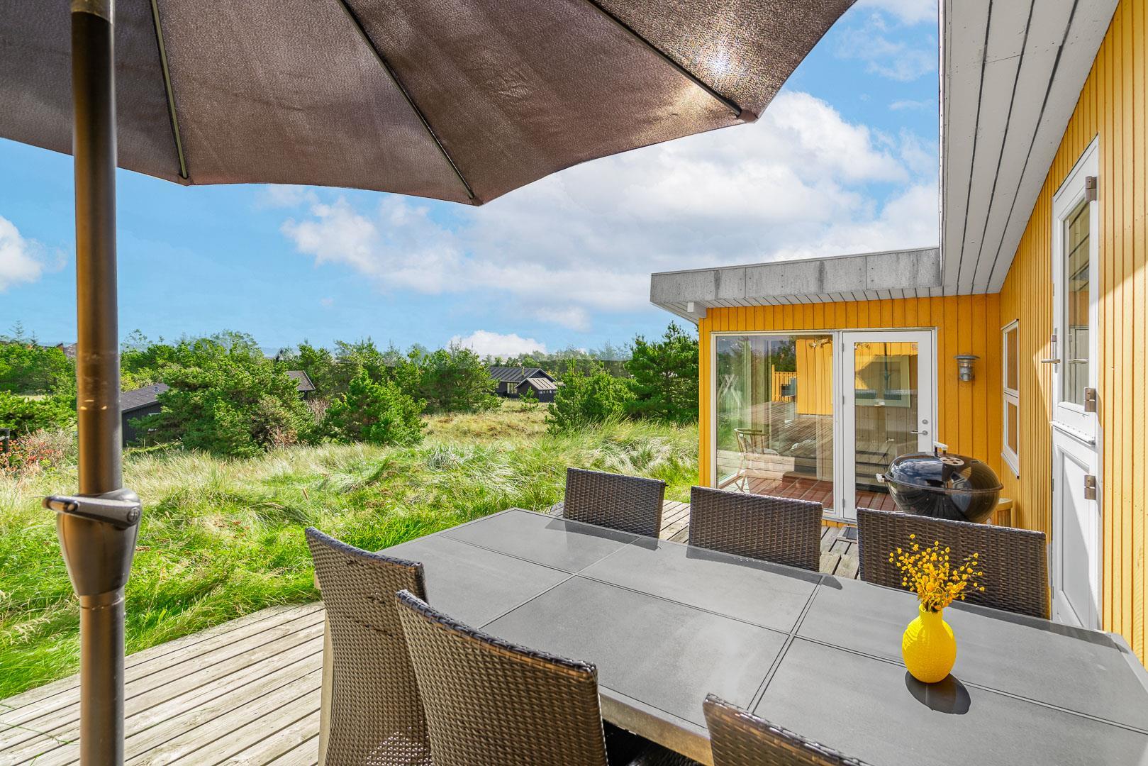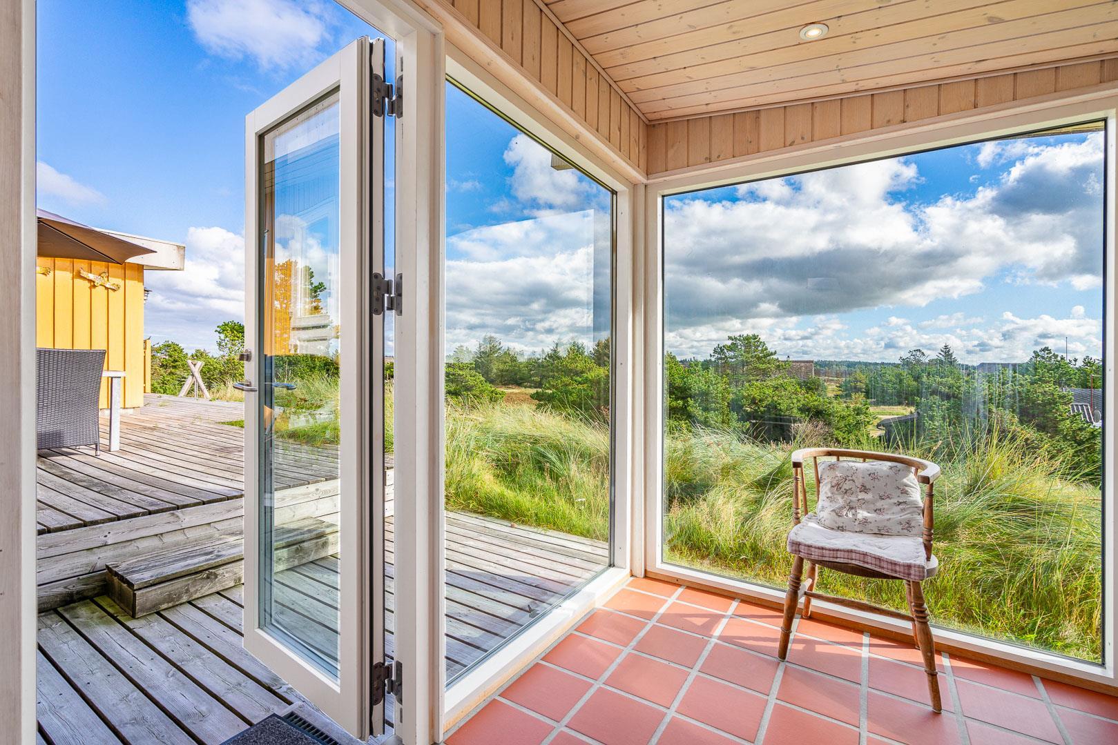 Naturskønt beliggende i hjertet af Henne Strand finder du dette indbydende sommerhus til 6 personer, kun 700 meter fra den smukke Vesterhavskyst. Sommerhuset er stilfuldt indrettet med friske farver og en hyggelig atmosfære. De forskellige niveauer i sommerhuset skaber en spændende og charmerende dynamik – blandt andet med tre trin, der leder dig fra det fine køkken og spisestue ned til en hyggelig stue. Her kan du nyde varmen fra brændeovnen, læse en god bog eller blot slappe af med udsigten til den omkringliggende natur. Fra stuen er der direkte udgang til en af de dejlige terrasser, der indbyder til afslapning i solens stråler.