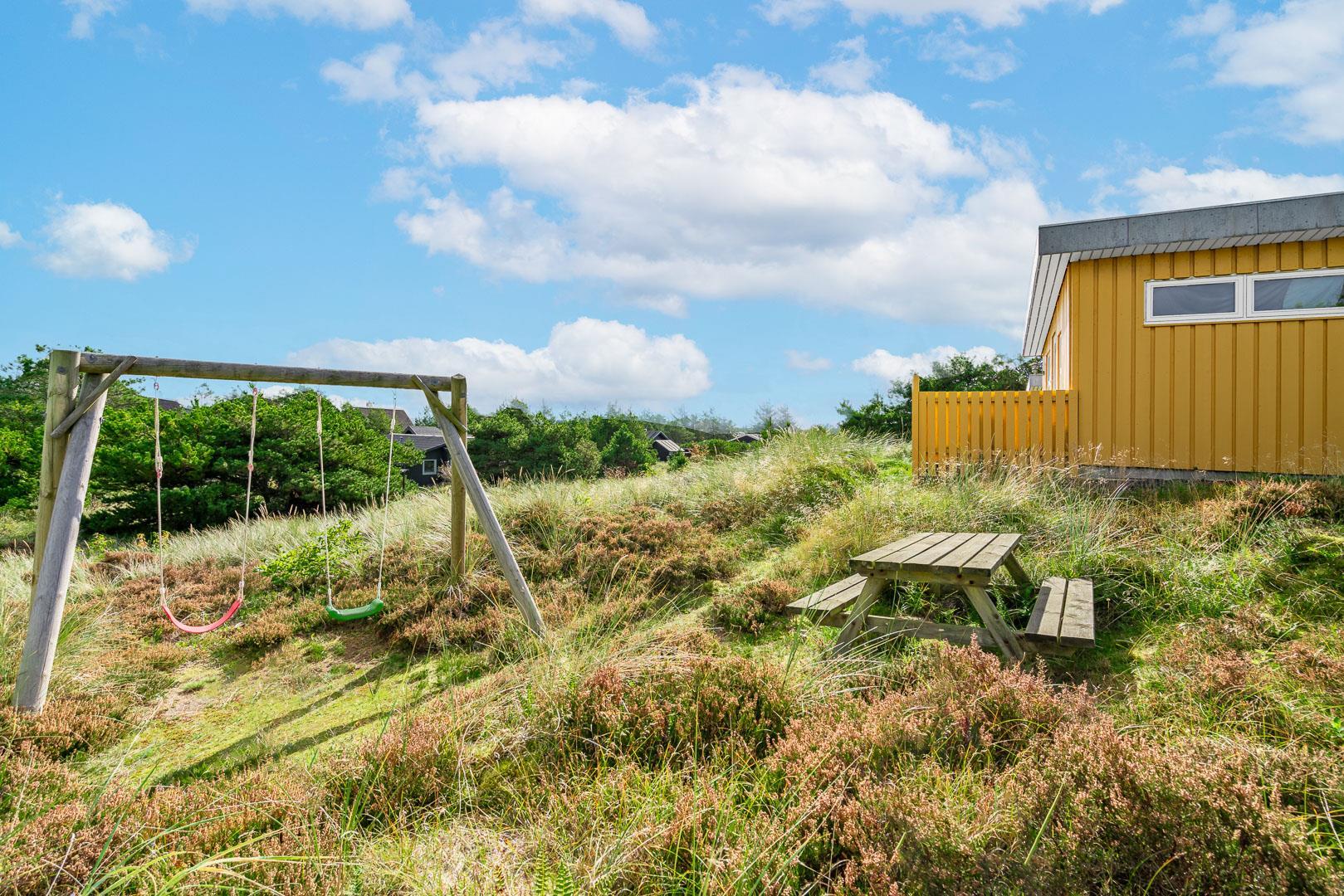 Grunden byder på flere skønne terrasser, så der er rig mulighed for at finde læ eller følge solen hele dagen. Om du foretrækker at nyde morgenkaffen i ro og mag, samles om frokosten under åben himmel eller tilbringe aftenen med et glas vin i hånden, så finder du det perfekte spot her. For familiens yngste er der også tænkt på sjov og leg – på grunden står et gyngestativ klar til timers underholdning.