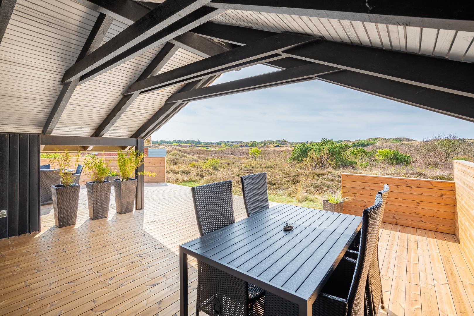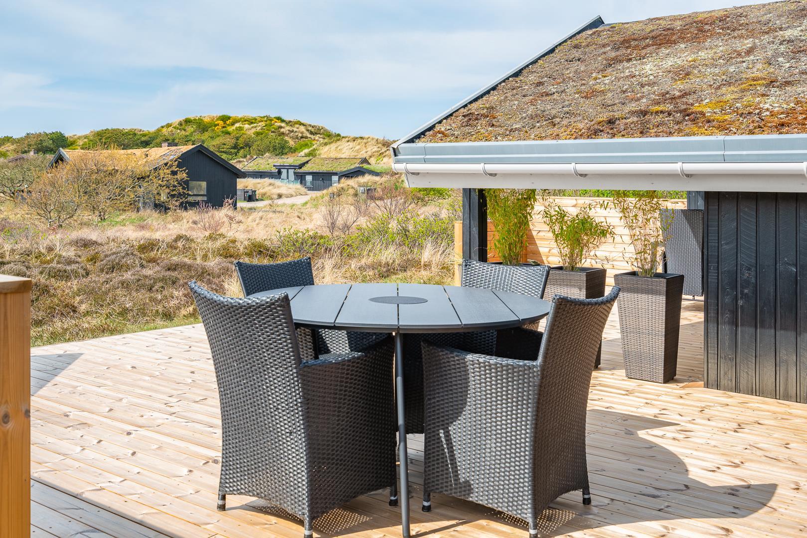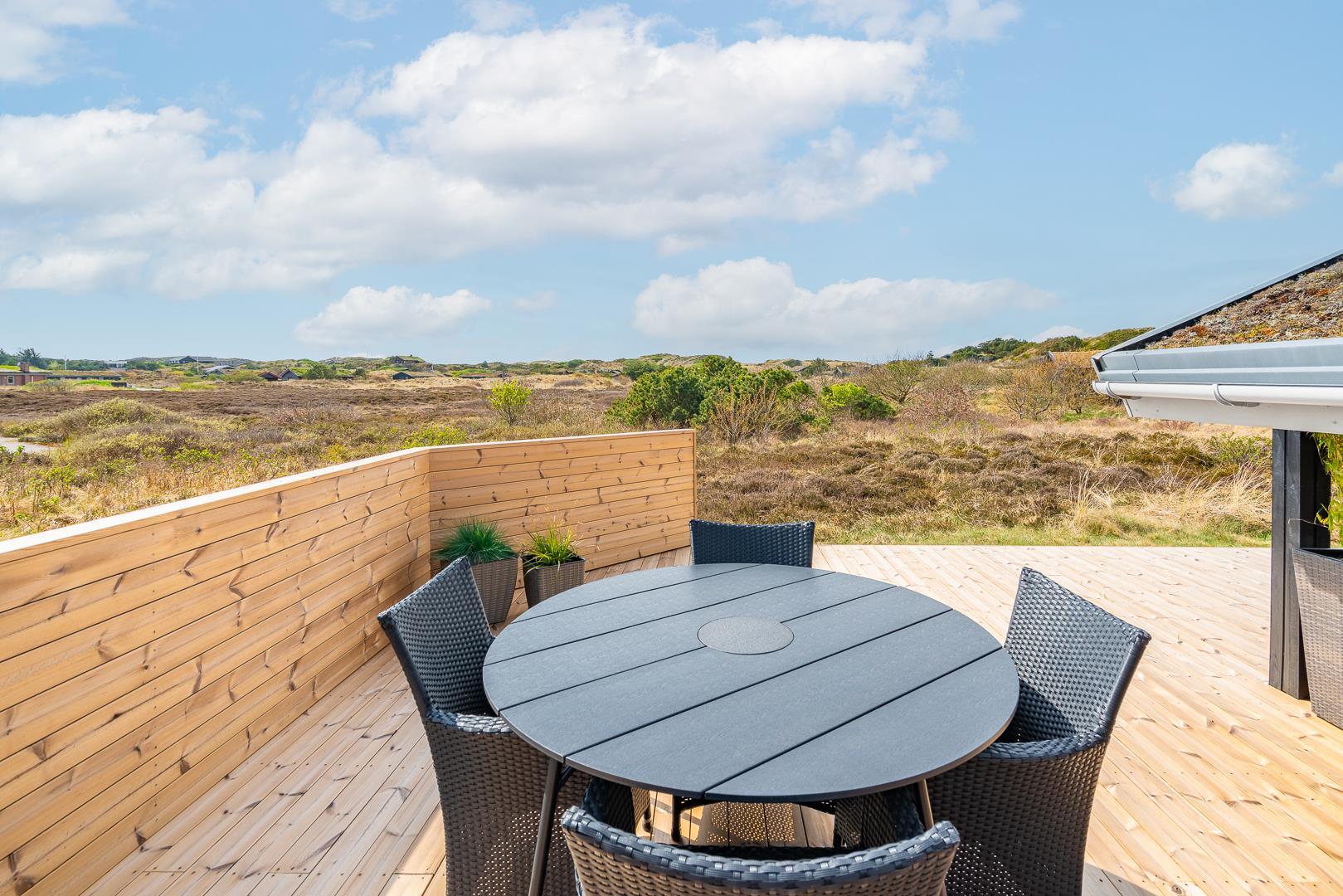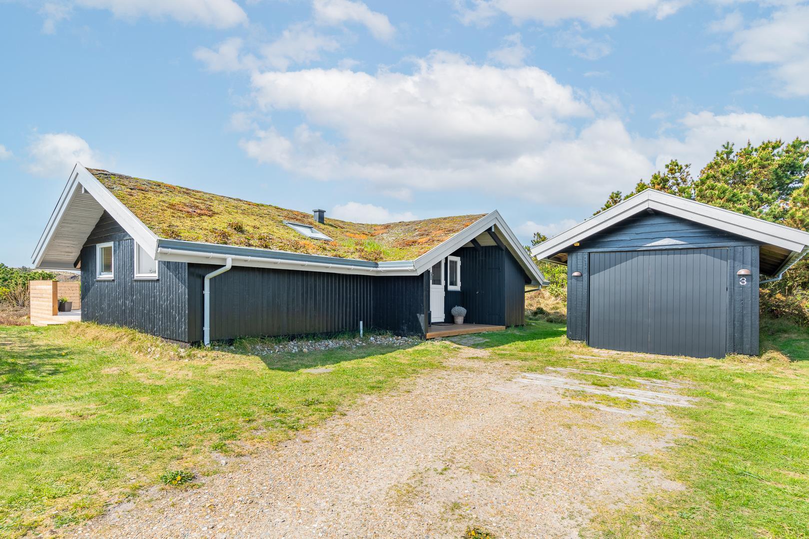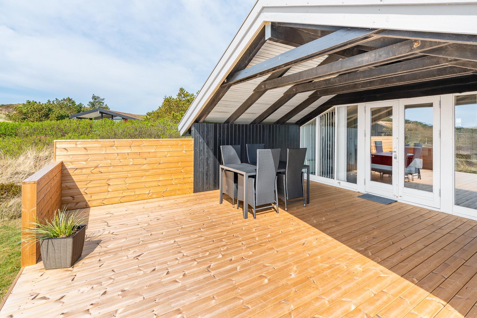 Udendørs venter en delvist overdækket træterrasse, der byder på en fortryllende udsigt over klitterne og den omkringliggende natur, perfekt til at nyde solnedgangen eller en kop morgenkaffe. På grunden finder du også en praktisk garage, der giver mulighed for sikker parkering og opbevaring af cykler, så du kan udforske området og nyde skønne cykelture i det naturskønne landskab omkring sommerhuset.