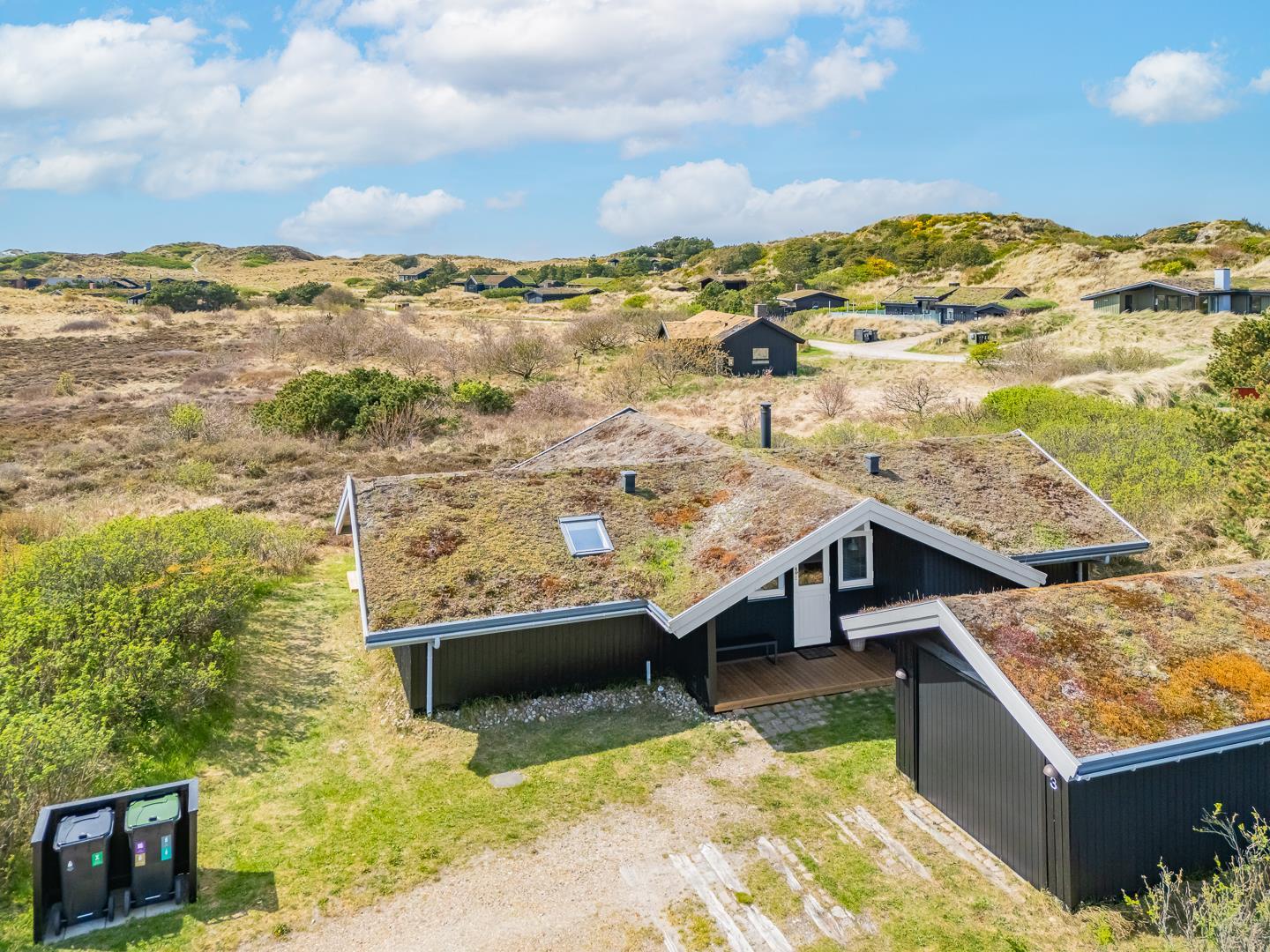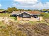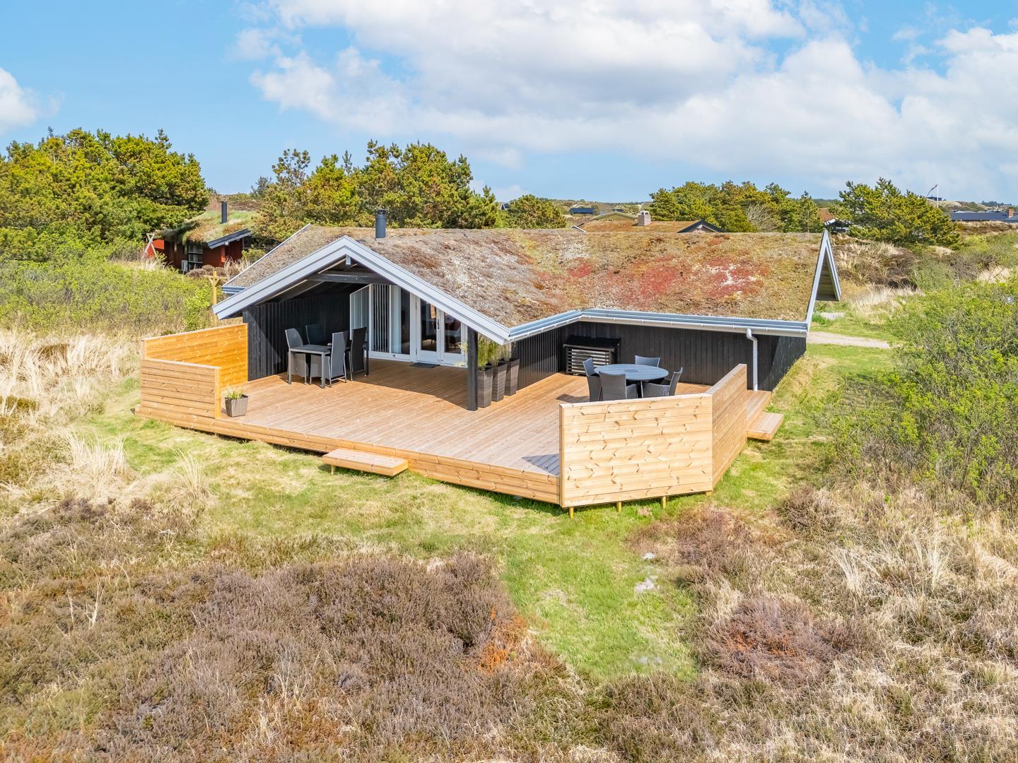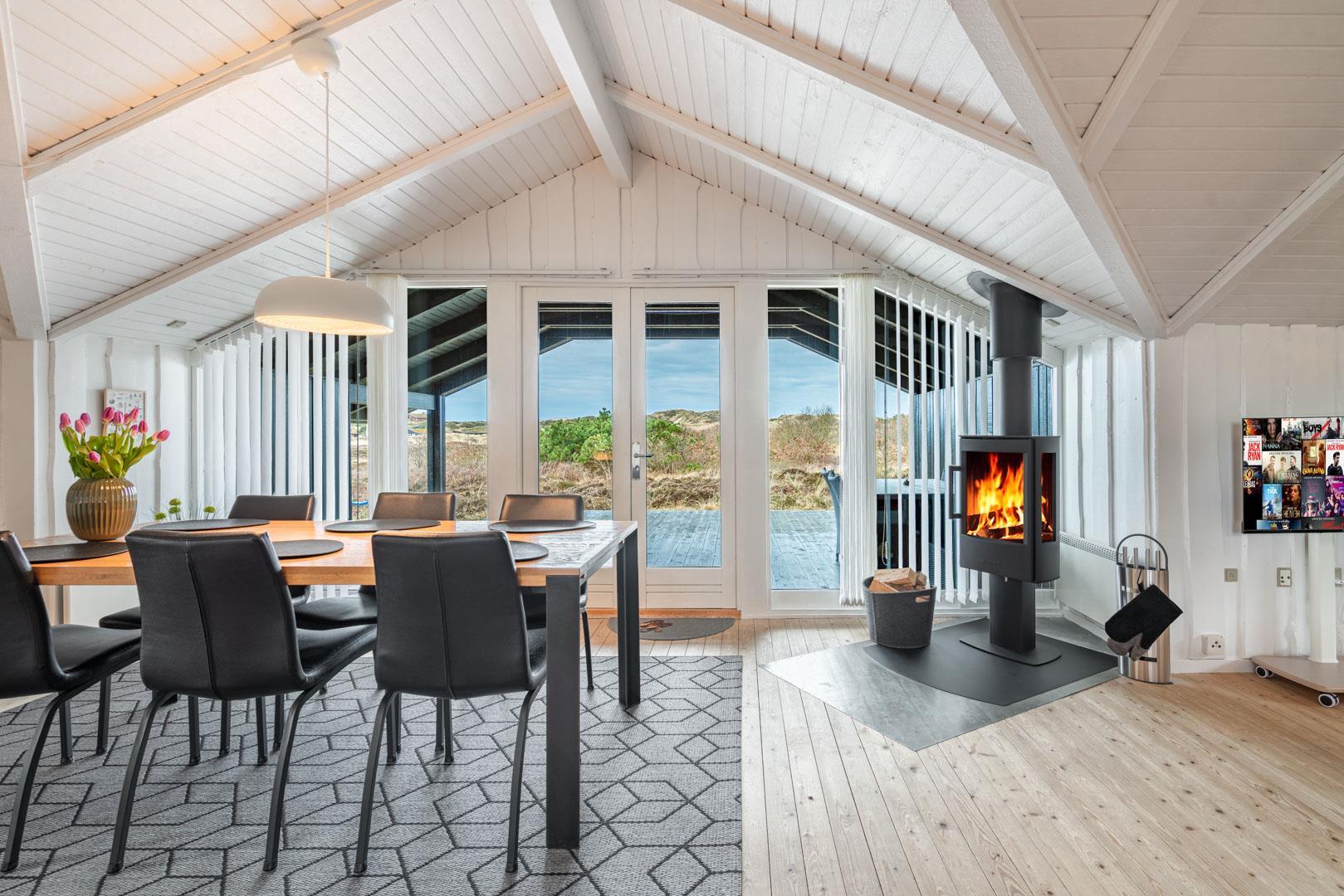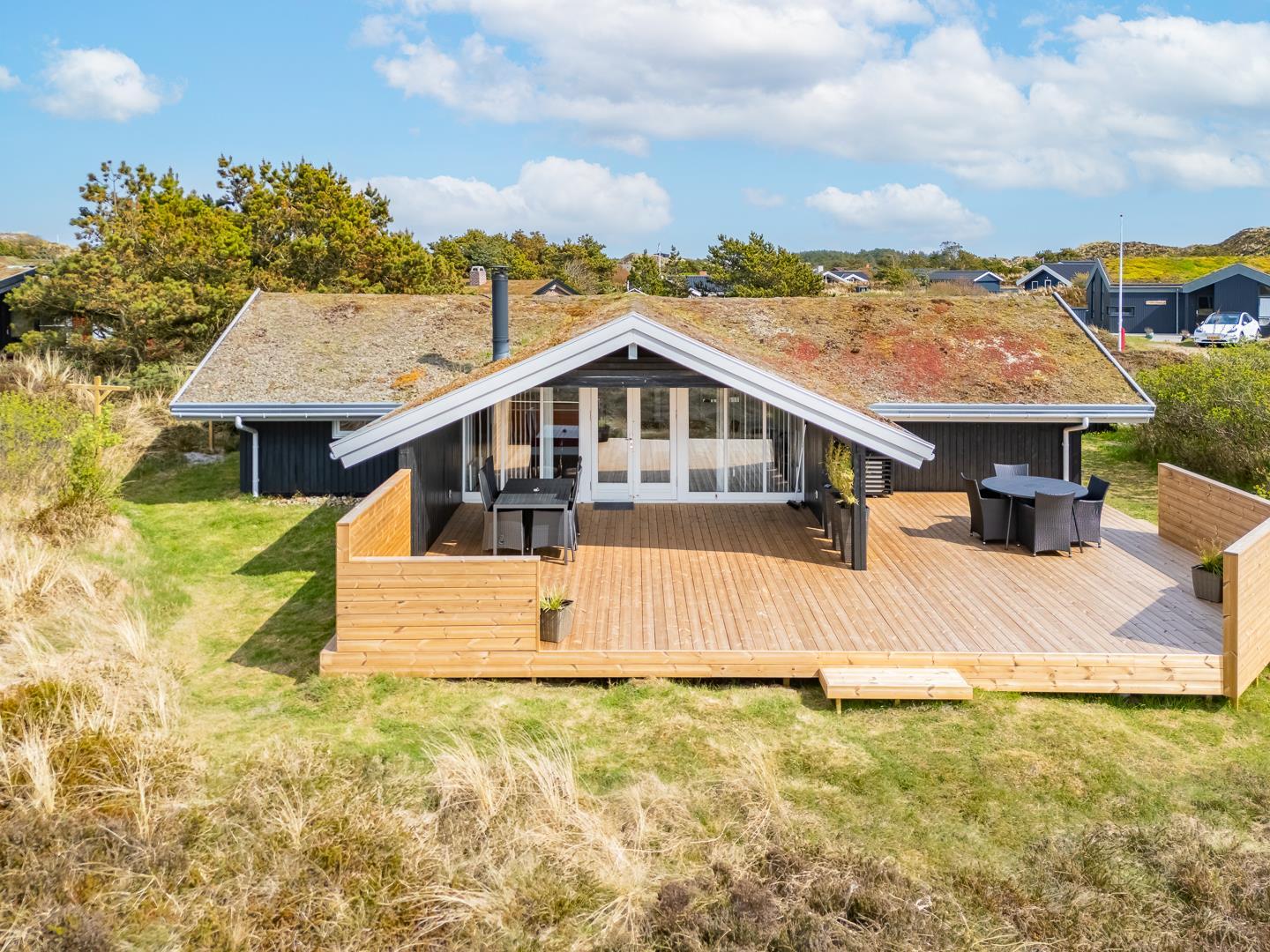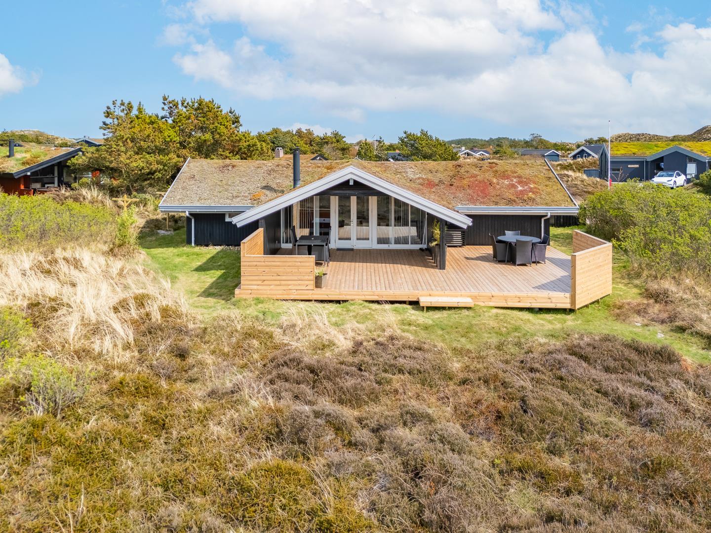 Udendørs venter en delvist overdækket træterrasse, der byder på en fortryllende udsigt over klitterne og den omkringliggende natur, perfekt til at nyde solnedgangen eller en kop morgenkaffe. På grunden finder du også en praktisk garage, der giver mulighed for sikker parkering og opbevaring af cykler, så du kan udforske området og nyde skønne cykelture i det naturskønne landskab omkring sommerhuset.