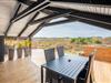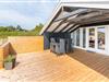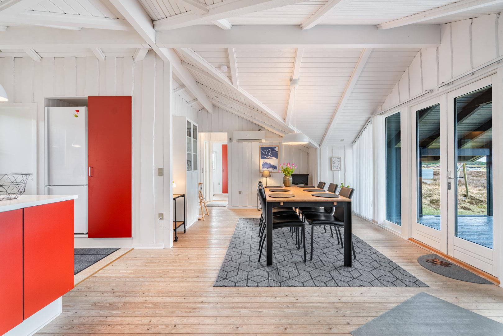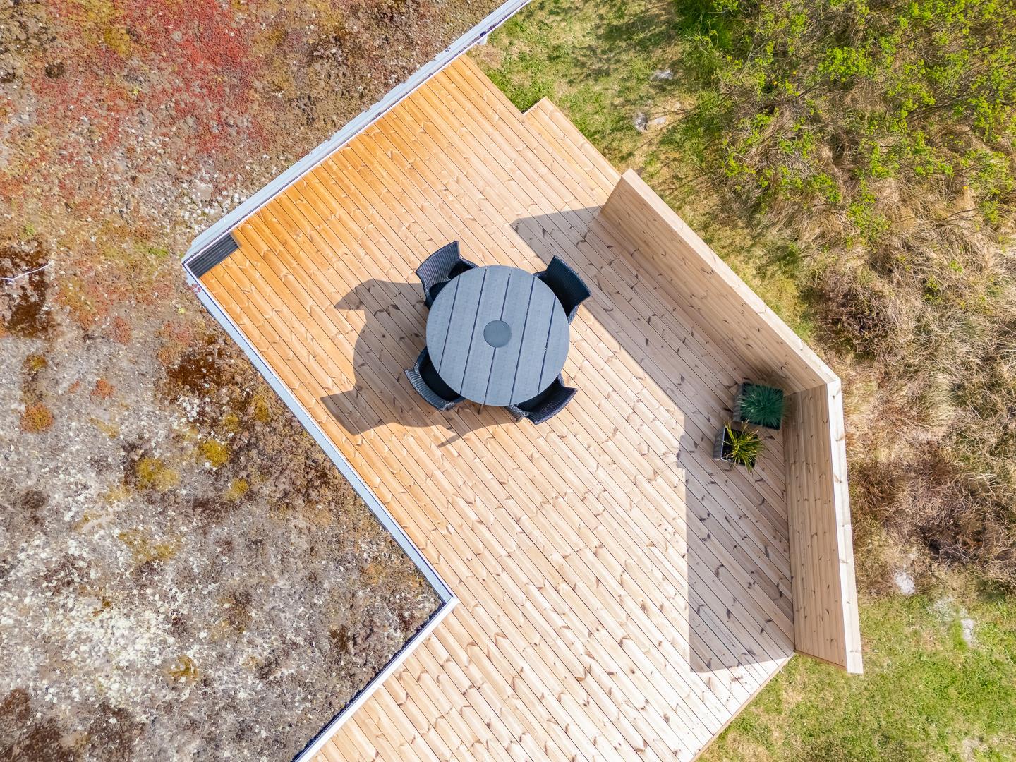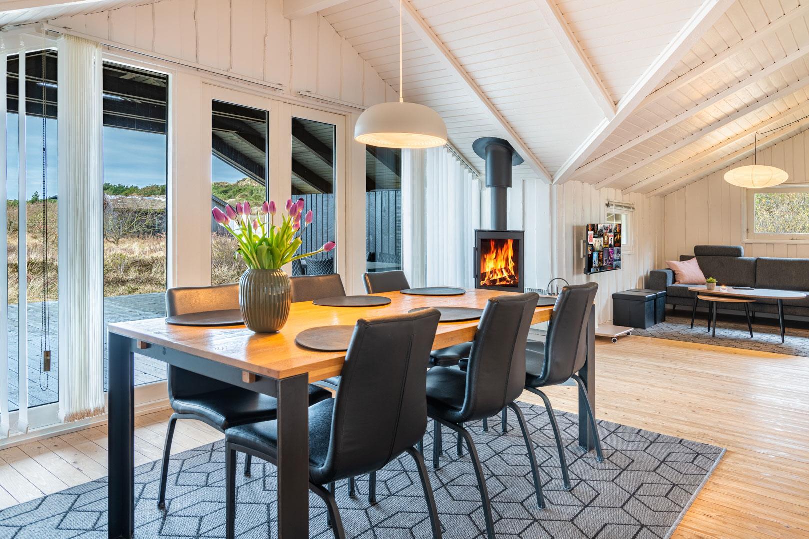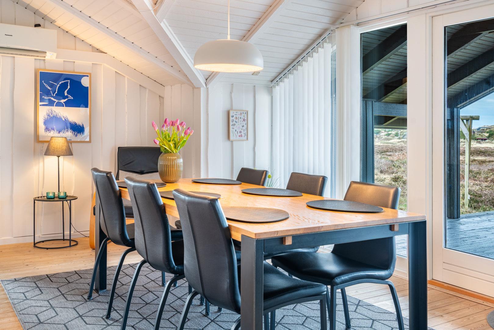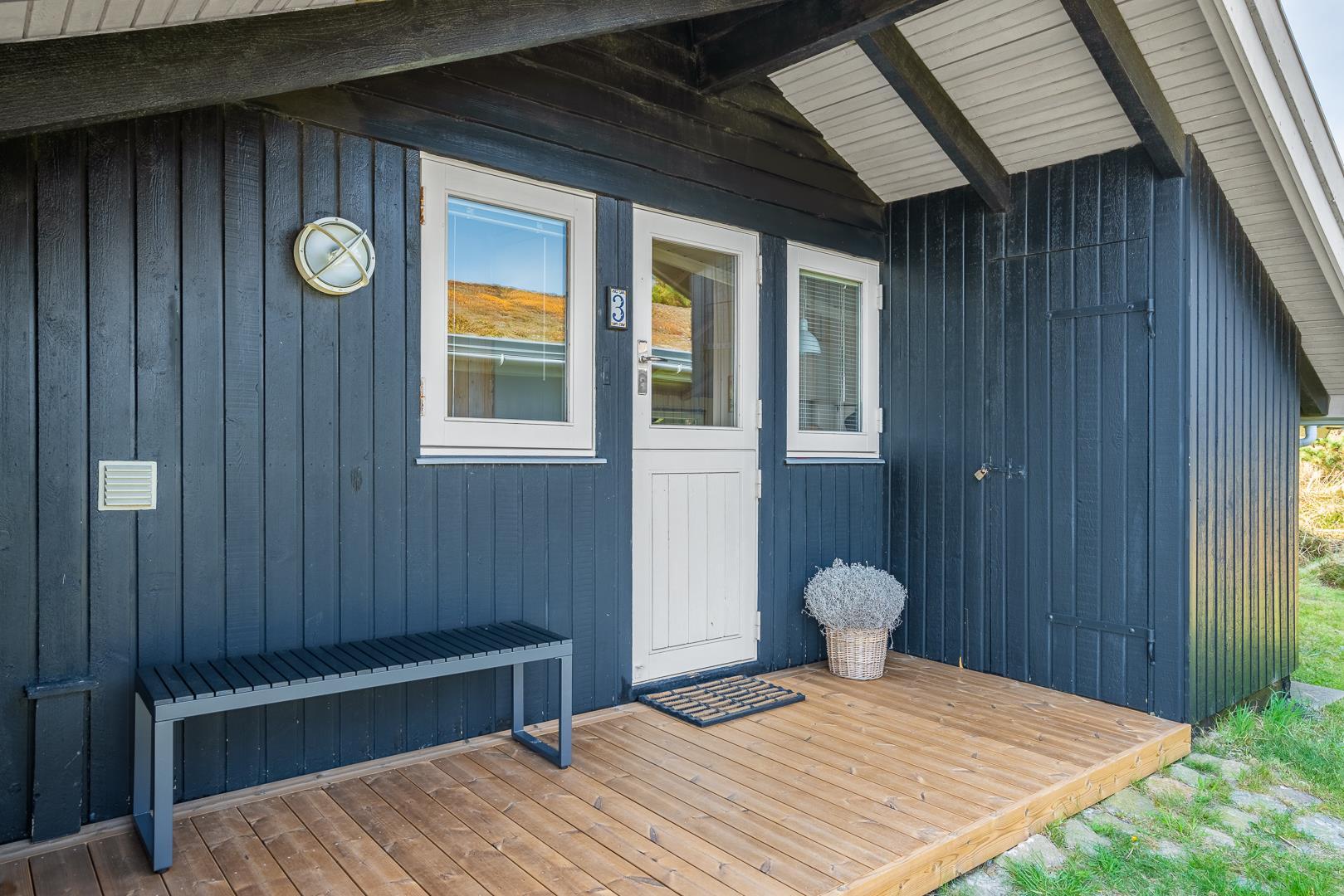 Udendørs venter en delvist overdækket træterrasse, der byder på en fortryllende udsigt over klitterne og den omkringliggende natur, perfekt til at nyde solnedgangen eller en kop morgenkaffe. På grunden finder du også en praktisk garage, der giver mulighed for sikker parkering og opbevaring af cykler, så du kan udforske området og nyde skønne cykelture i det naturskønne landskab omkring sommerhuset.