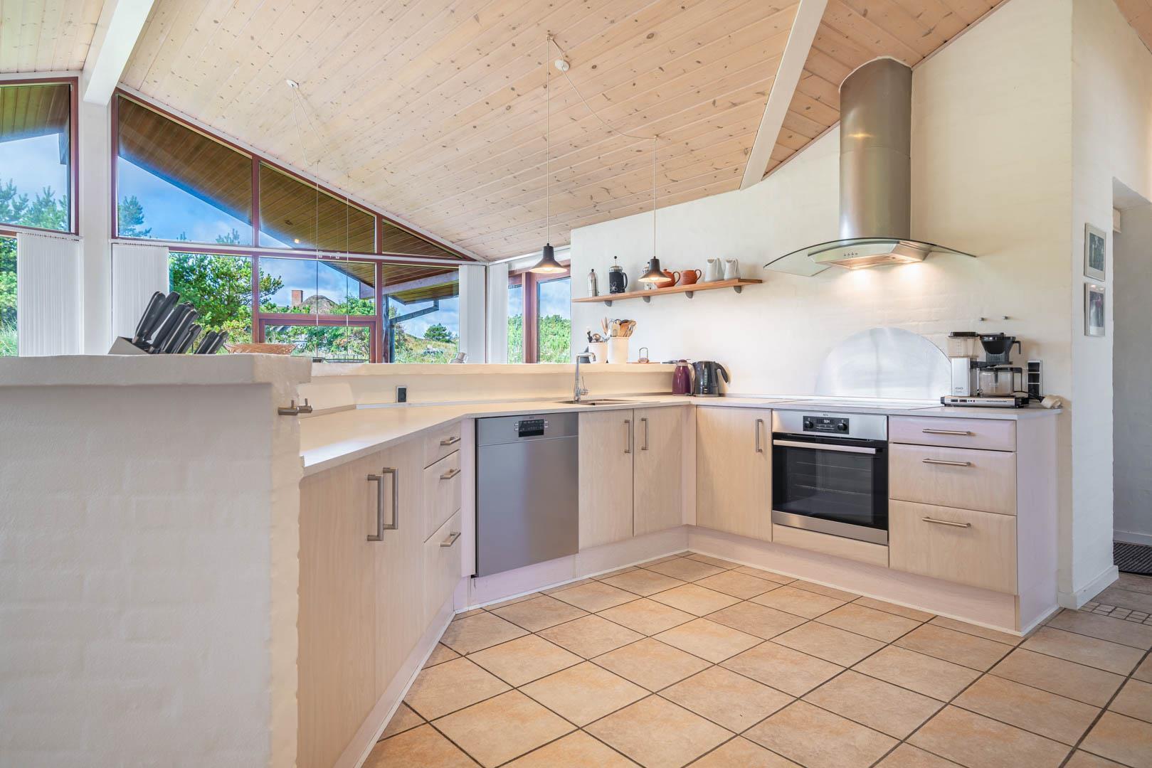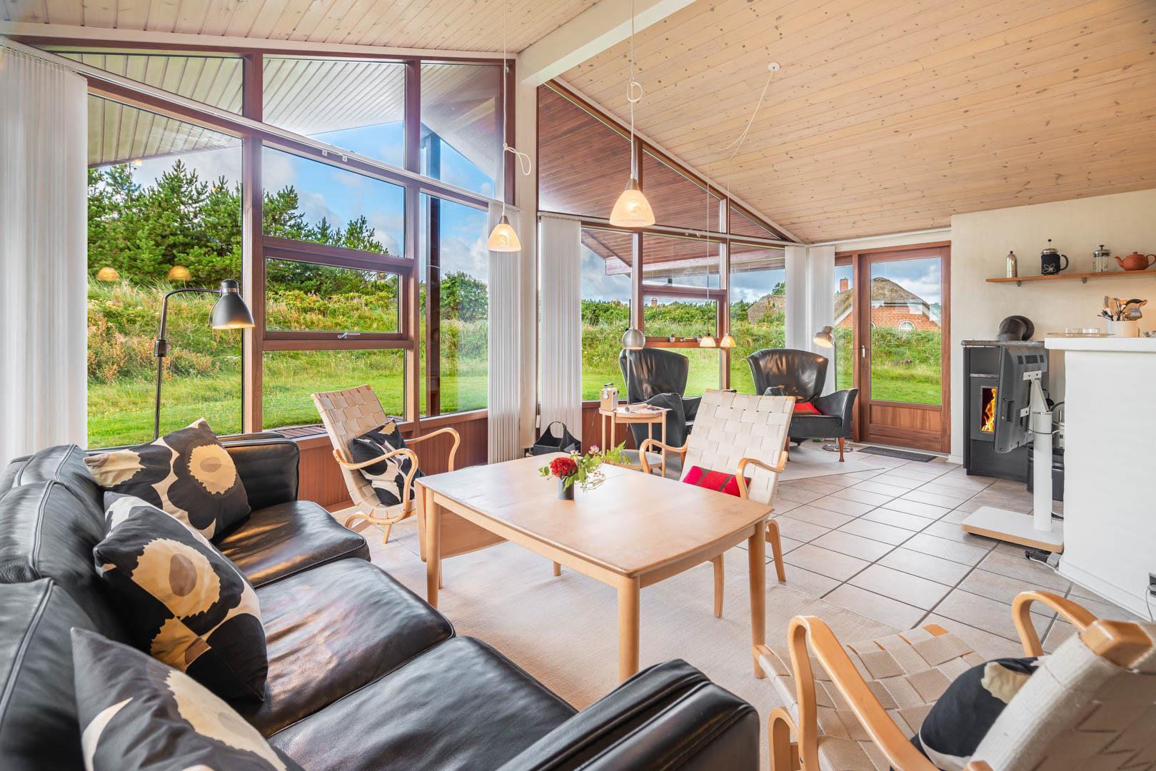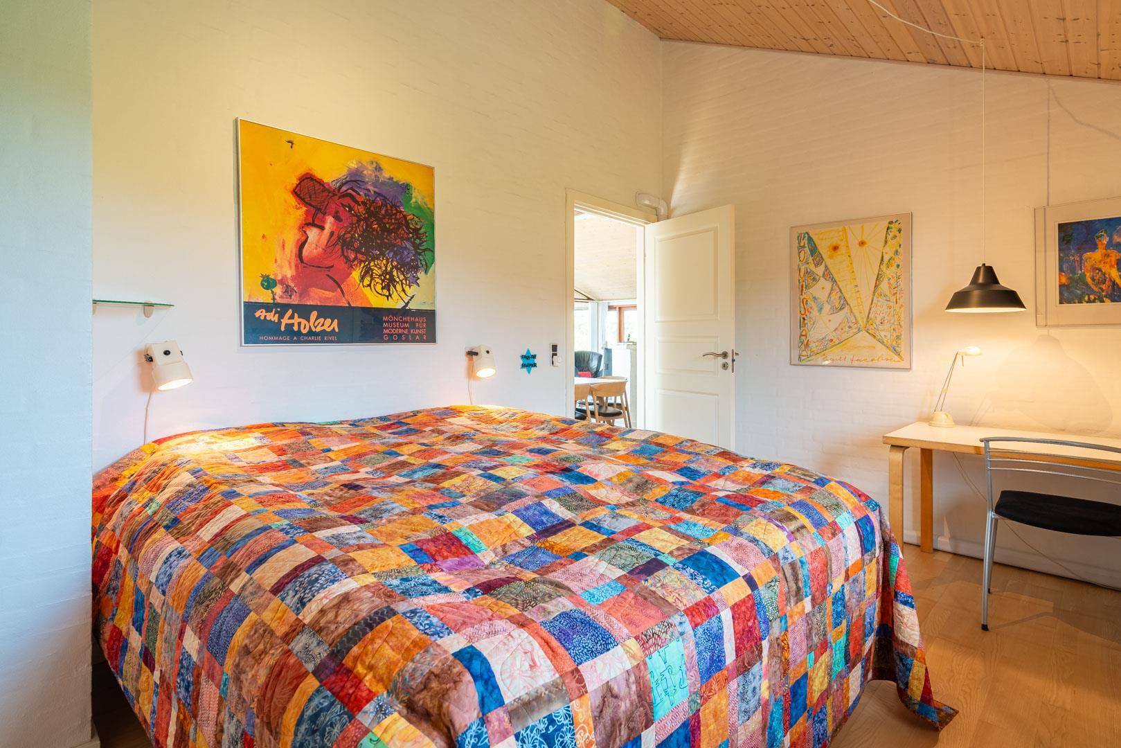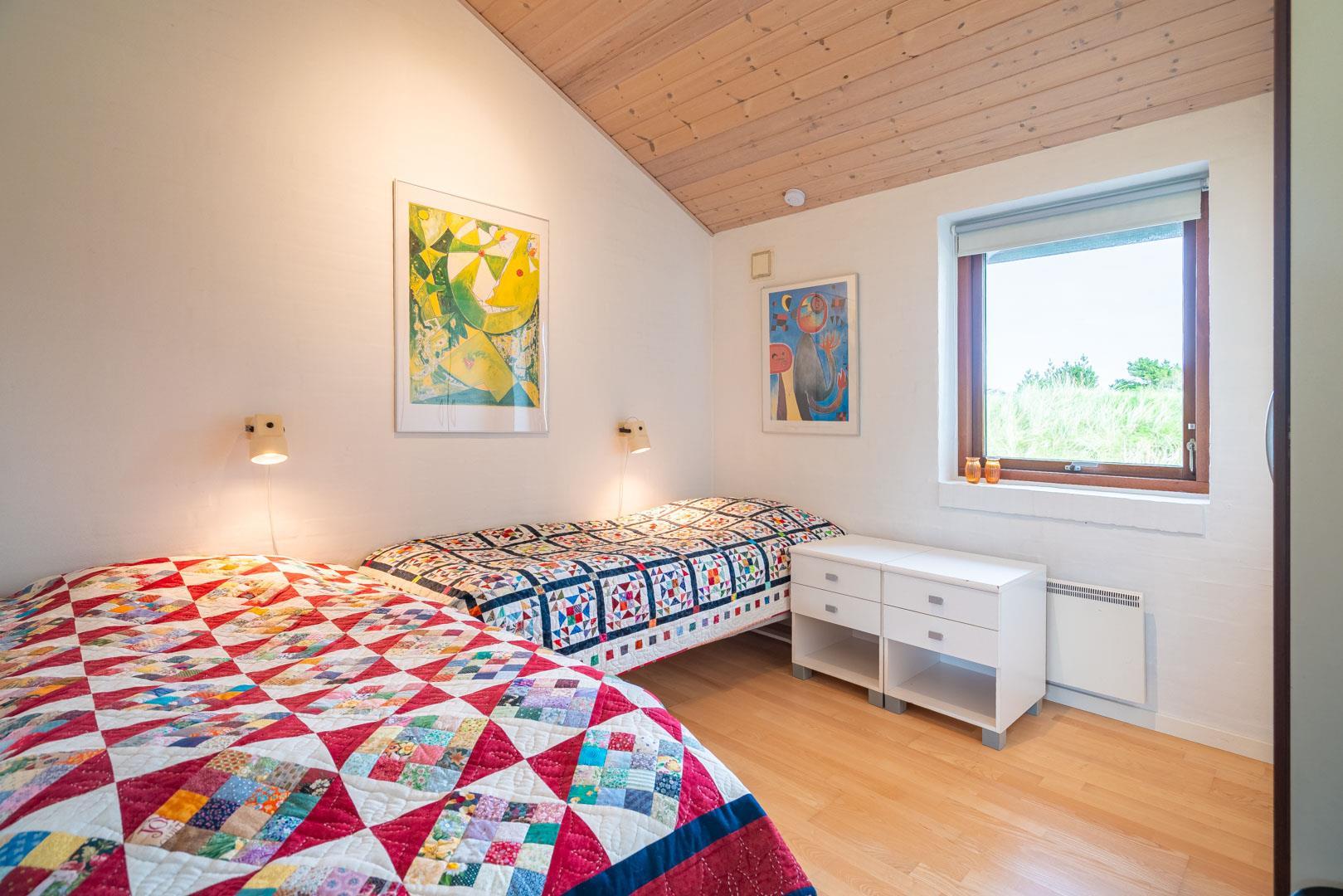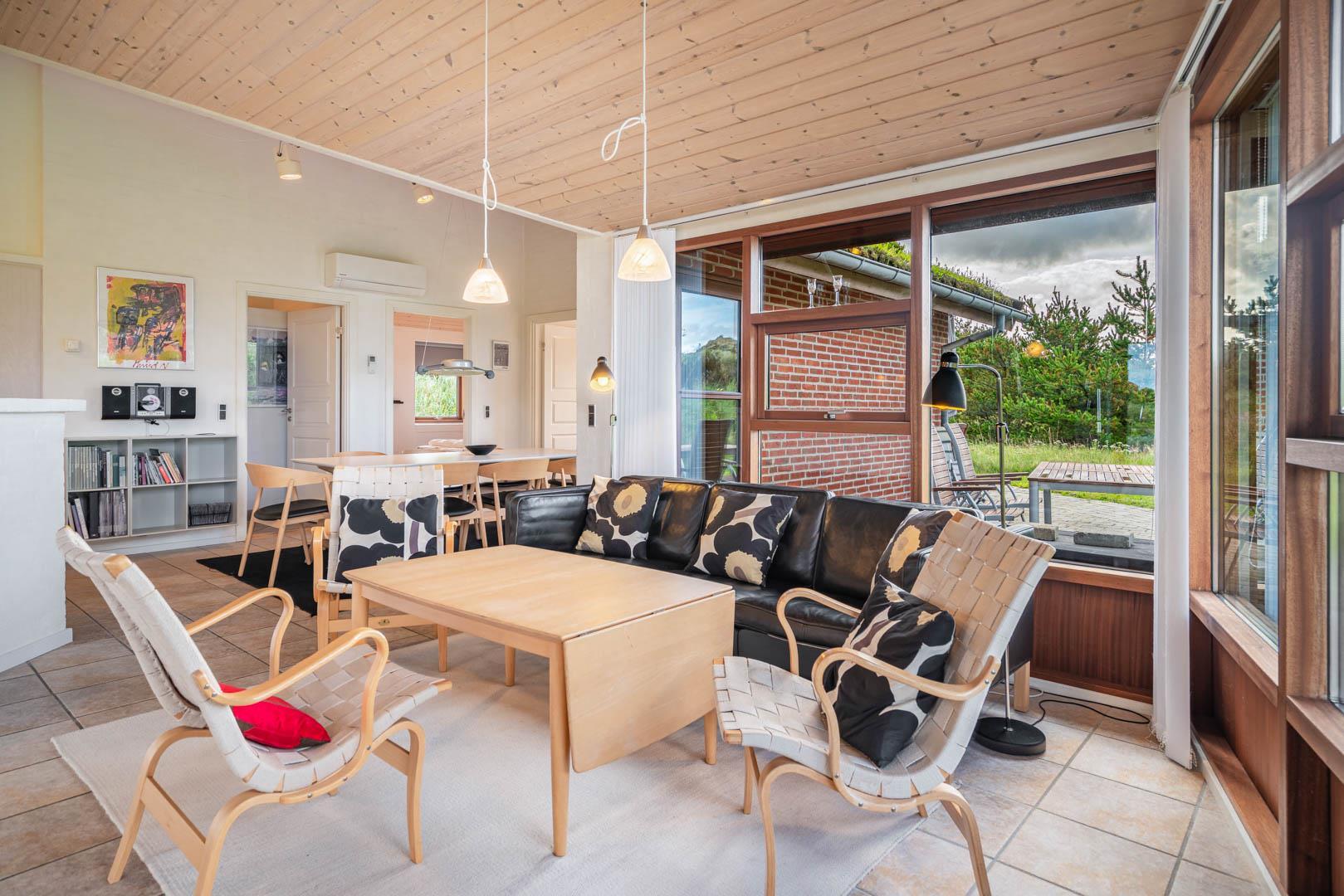 Opholdsstuen er lyst og venligt indrettet og har store vinduespartier, som giver et dejligt lysindfald. Køkkenet er praktisk indrettet og integreret i stuen, så hele familien kan være sammen – også når der bliver lavet mad. Sommerhuset har fire soveværelser: Tre med dobbeltsenge og ét med to enkeltsenge. Værelserne har trægulve og god opbevaringsplads, hvilket gør huset velegnet til både familier og mindre grupper.