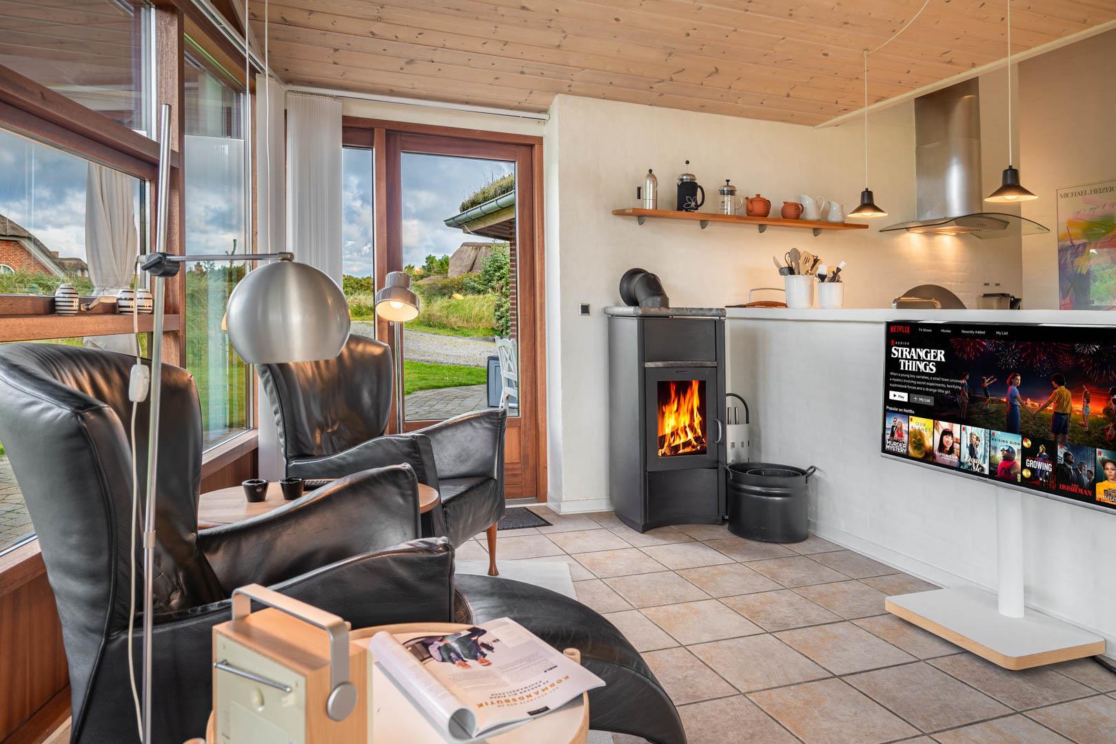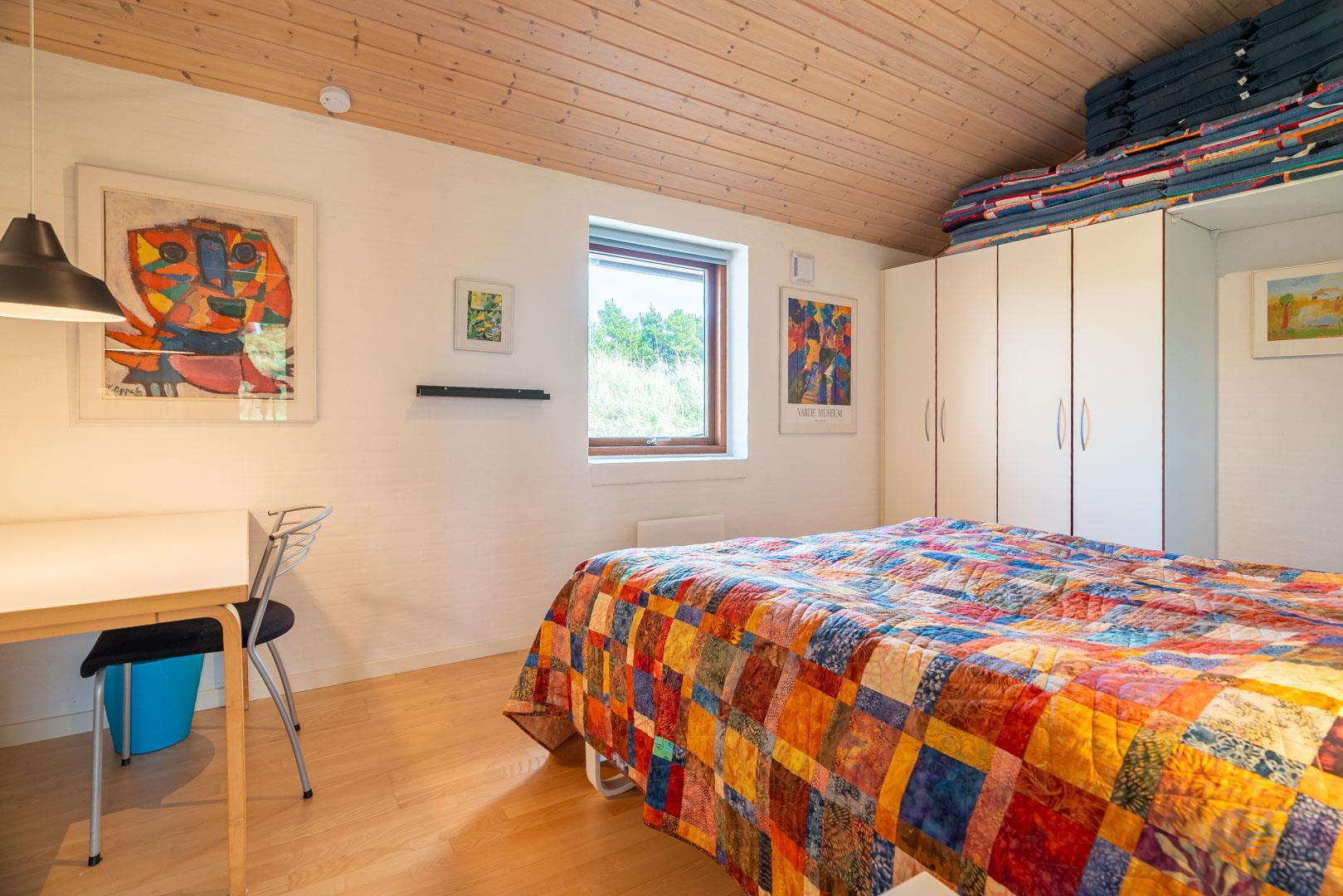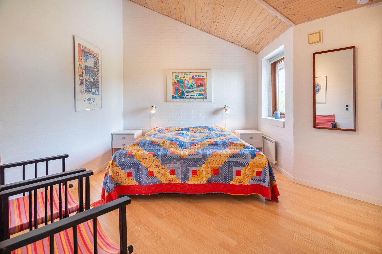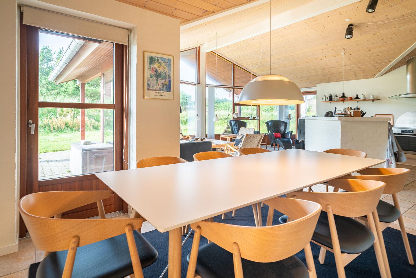 Opholdsstuen er lyst og venligt indrettet og har store vinduespartier, som giver et dejligt lysindfald. Køkkenet er praktisk indrettet og integreret i stuen, så hele familien kan være sammen – også når der bliver lavet mad. Sommerhuset har fire soveværelser: Tre med dobbeltsenge og ét med to enkeltsenge. Værelserne har trægulve og god opbevaringsplads, hvilket gør huset velegnet til både familier og mindre grupper.