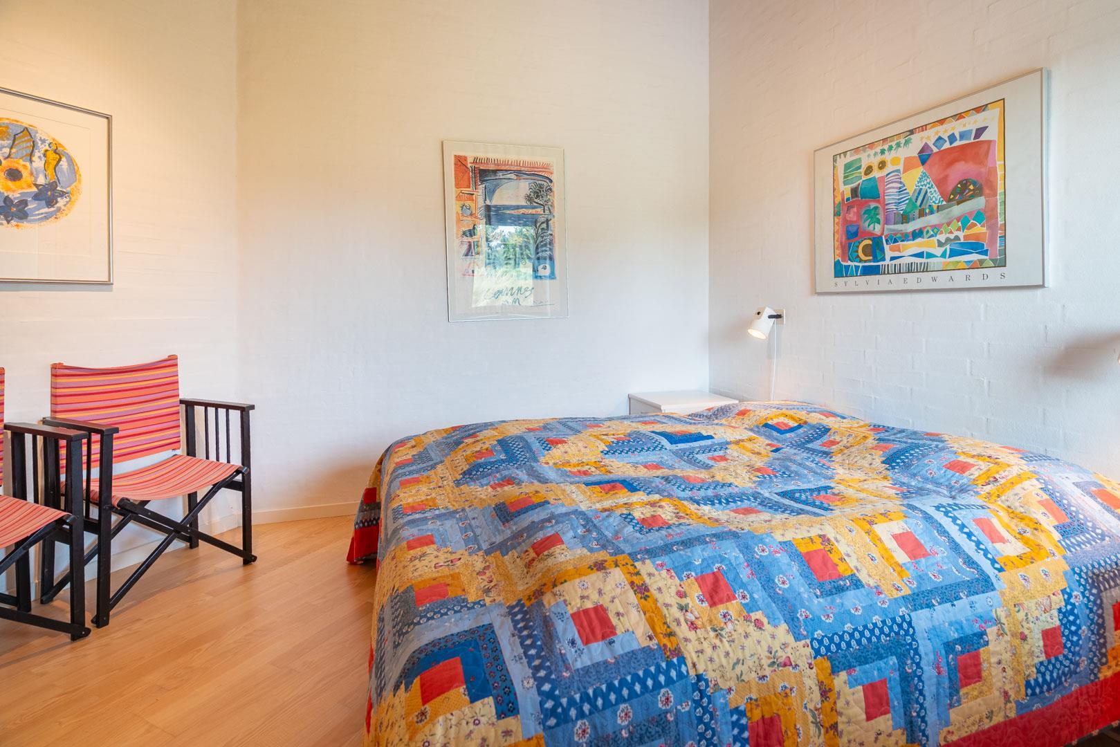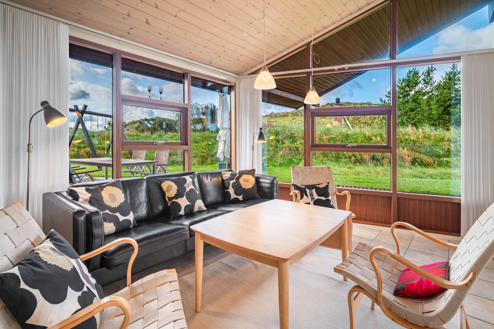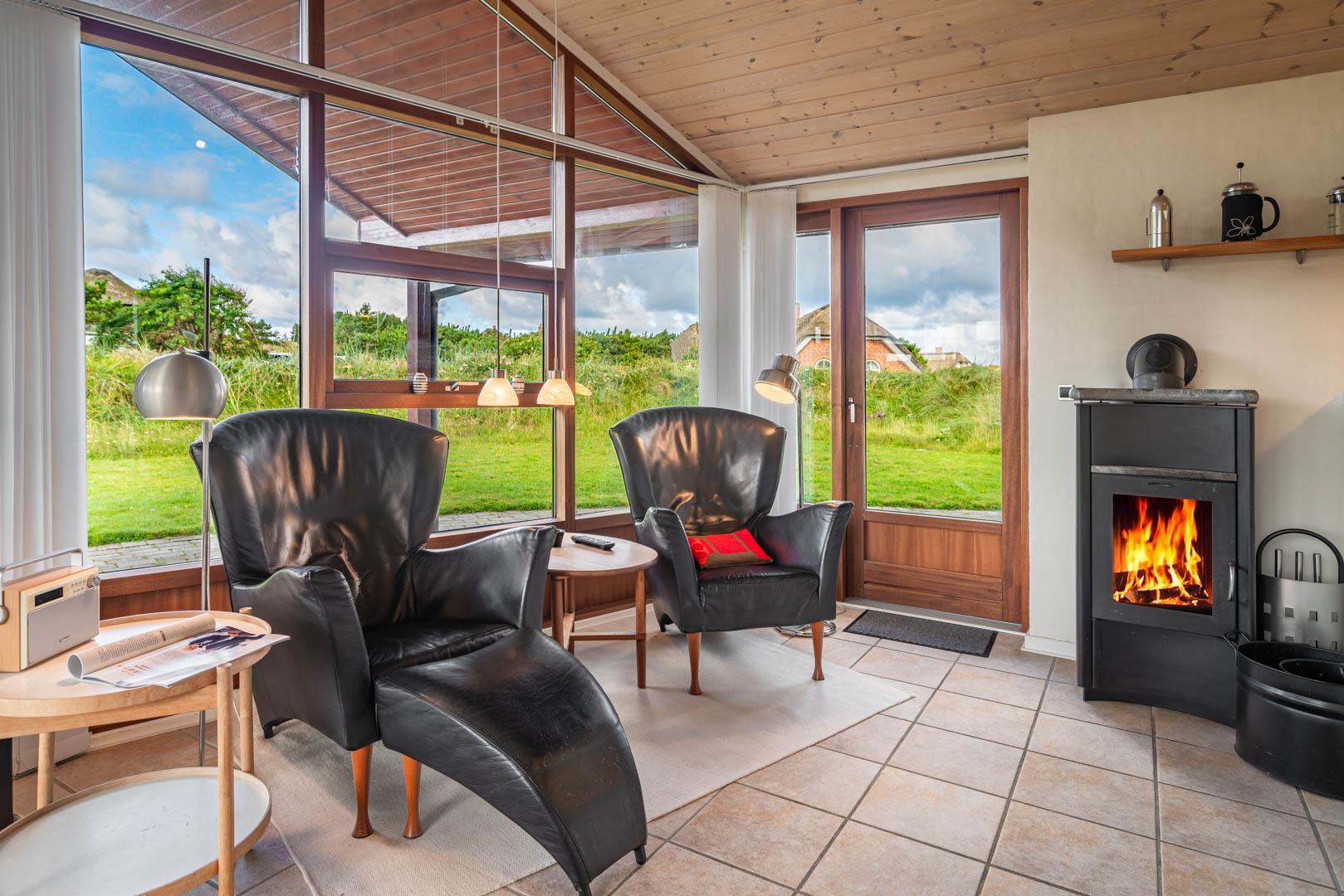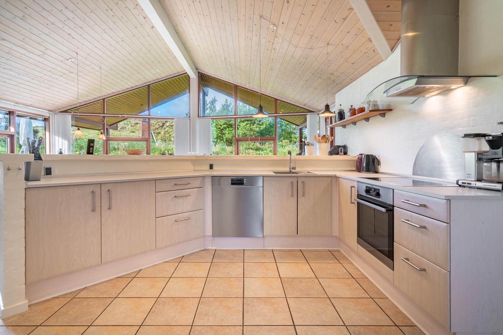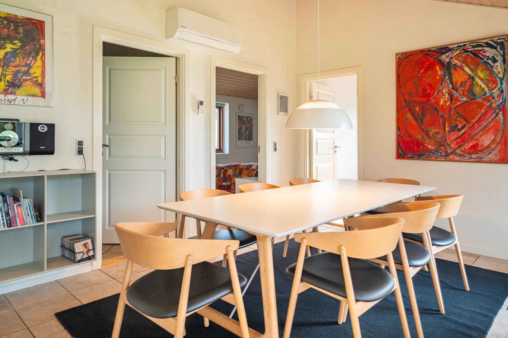 Opholdsstuen er lyst og venligt indrettet og har store vinduespartier, som giver et dejligt lysindfald. Køkkenet er praktisk indrettet og integreret i stuen, så hele familien kan være sammen – også når der bliver lavet mad. Sommerhuset har fire soveværelser: Tre med dobbeltsenge og ét med to enkeltsenge. Værelserne har trægulve og god opbevaringsplads, hvilket gør huset velegnet til både familier og mindre grupper.