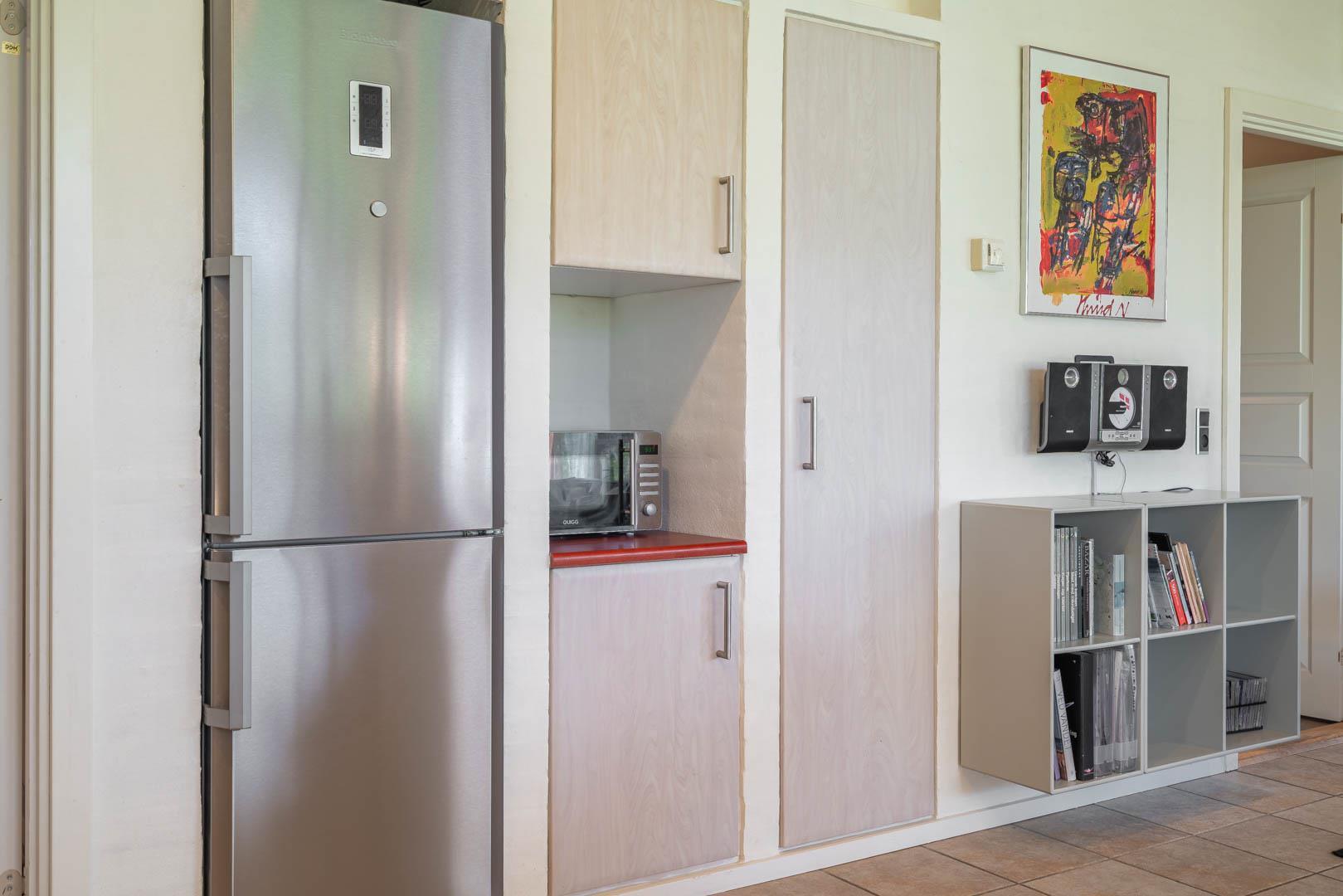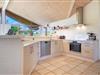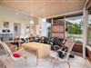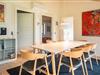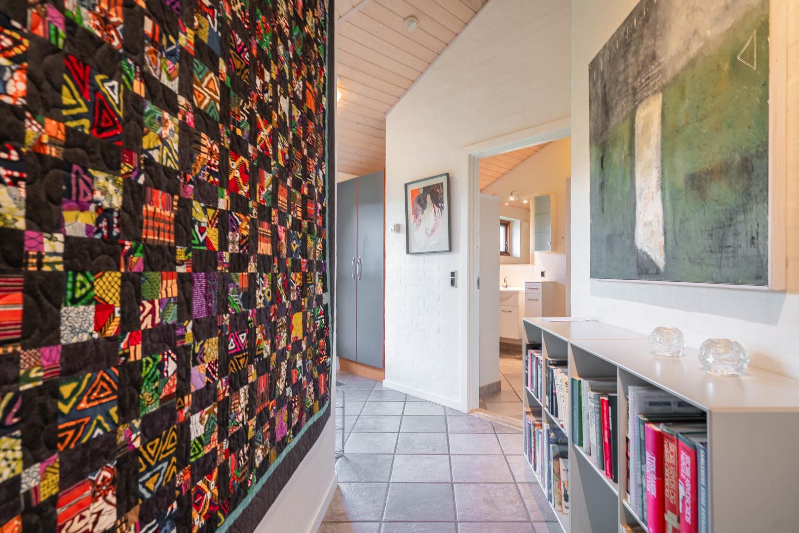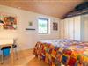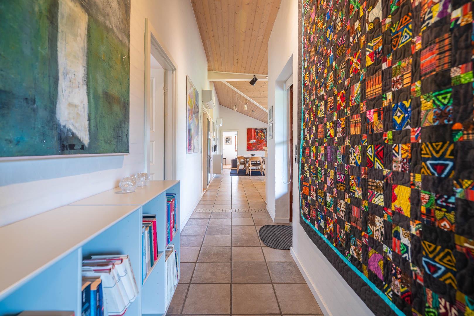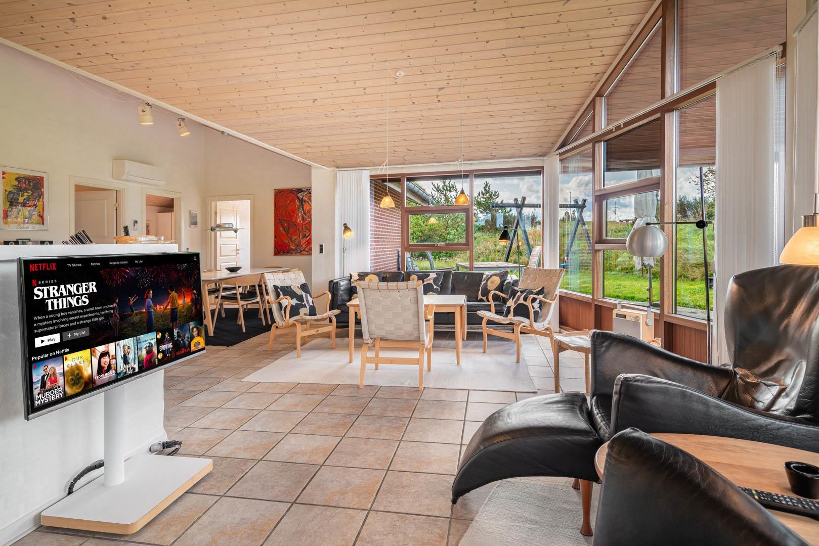 Opholdsstuen er lyst og venligt indrettet og har store vinduespartier, som giver et dejligt lysindfald. Køkkenet er praktisk indrettet og integreret i stuen, så hele familien kan være sammen – også når der bliver lavet mad. Sommerhuset har fire soveværelser: Tre med dobbeltsenge og ét med to enkeltsenge. Værelserne har trægulve og god opbevaringsplads, hvilket gør huset velegnet til både familier og mindre grupper.