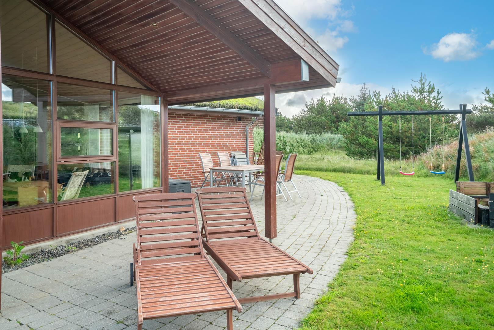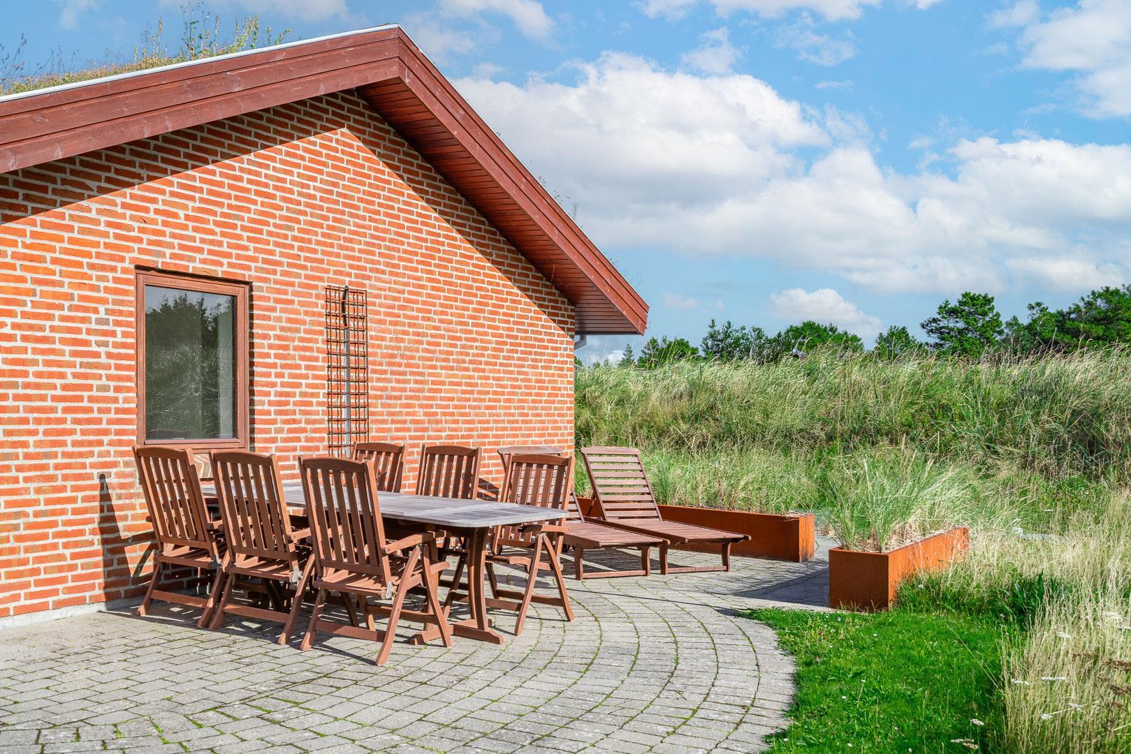 Huset har både en åben og en overdækket terrasse med havemøbler. Her kan du nyde solen om dagen og hyggelige aftener med grill ved den udendørs pejs – uanset vejret.