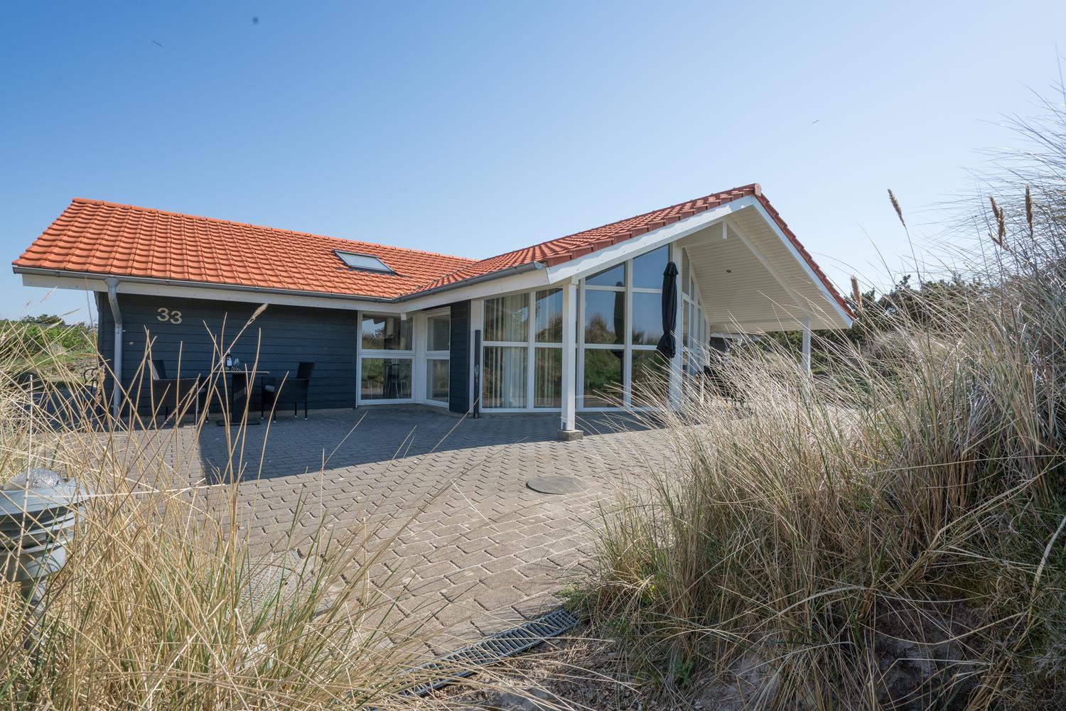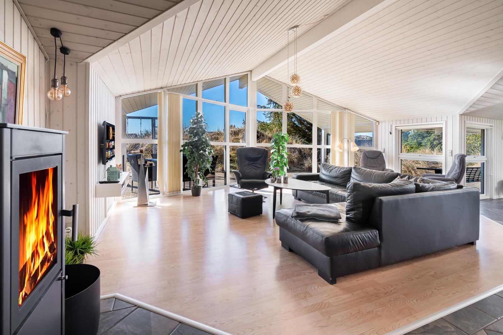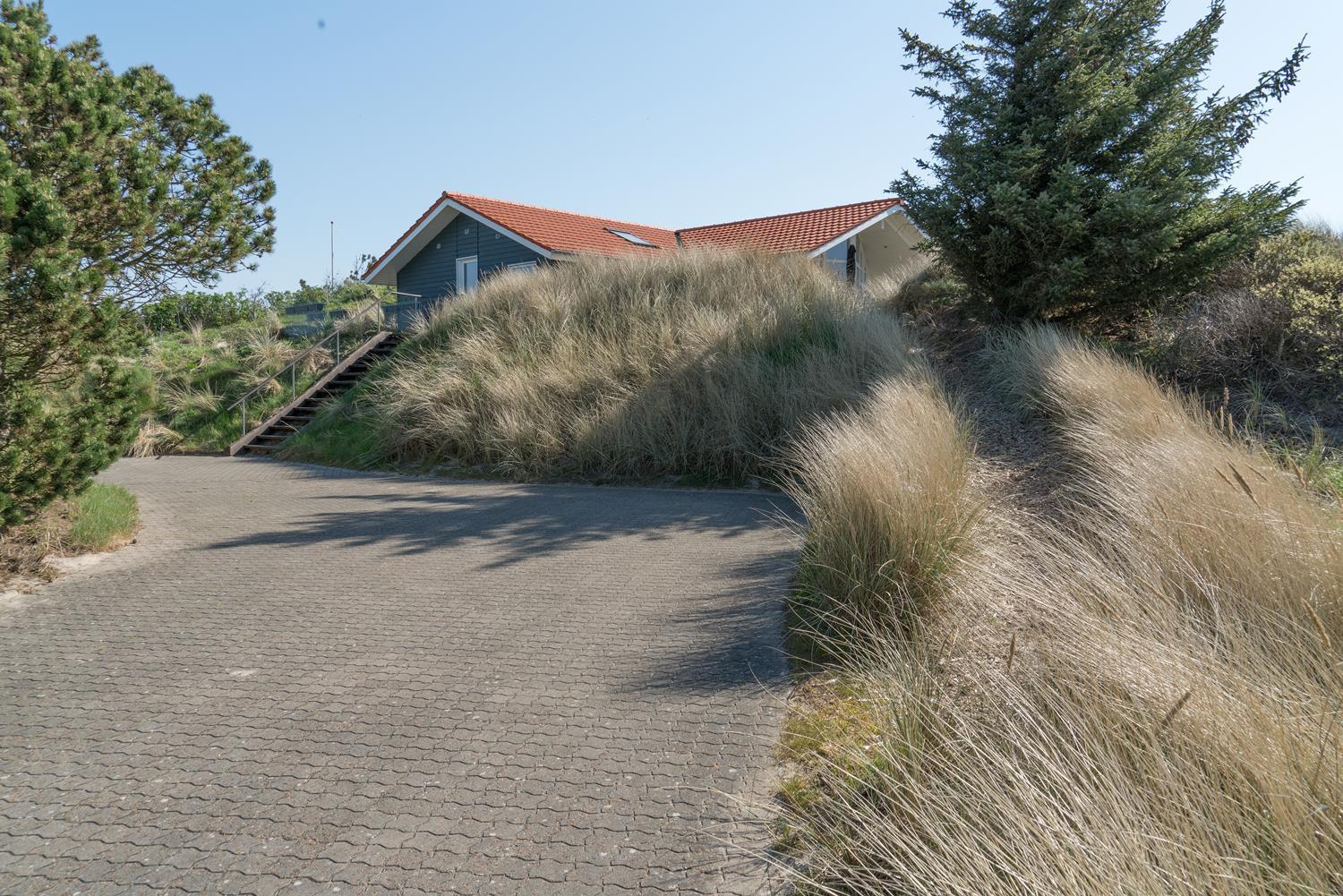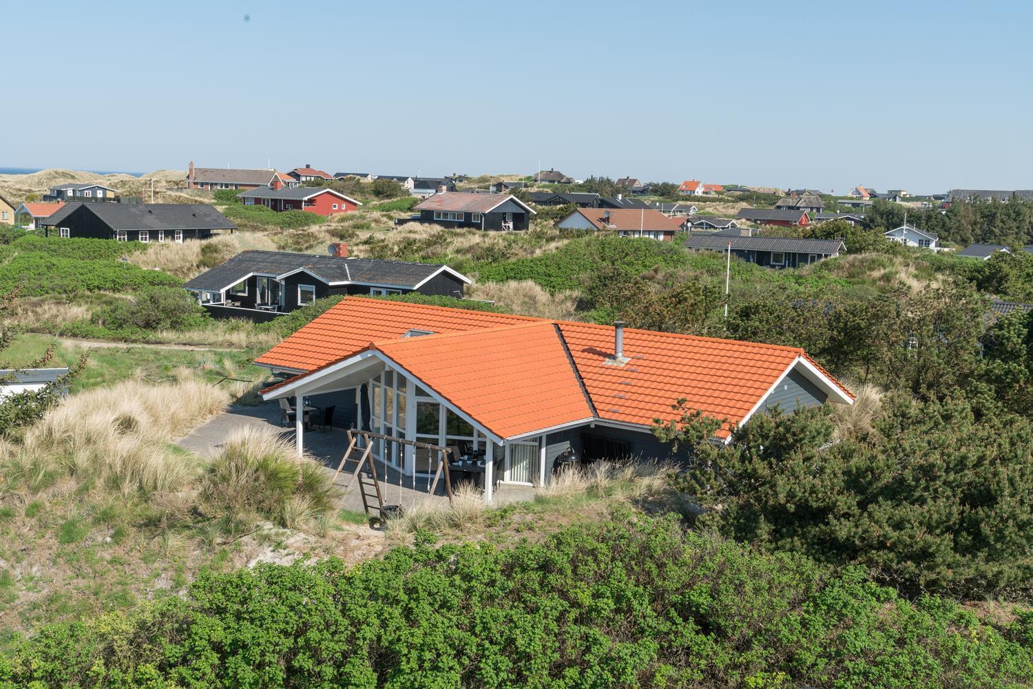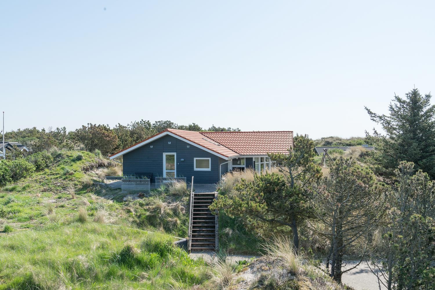 På en pragtfuld højtbeliggende kuperet klitgrund med udsigt over klitterne ligger dette pragtfulde og velholdte feriehus. Flot køkken kombineret med velmøbleret stue med loft til kip. Der er 2 flotte badeværelser med bruser, i det ene er der spa og sauna. 3 gode rummelige soverum. Fra stuen er der udgang til ugeneret terrasse, hvor udsigten og solen kan nydes. Gratis ADSL-Internetforbindelse.