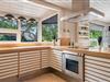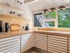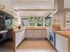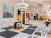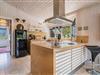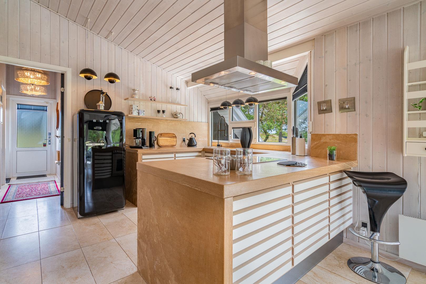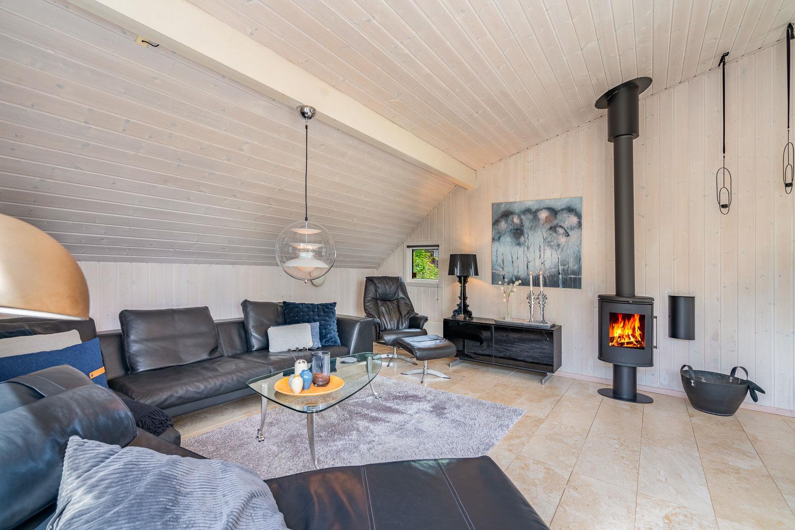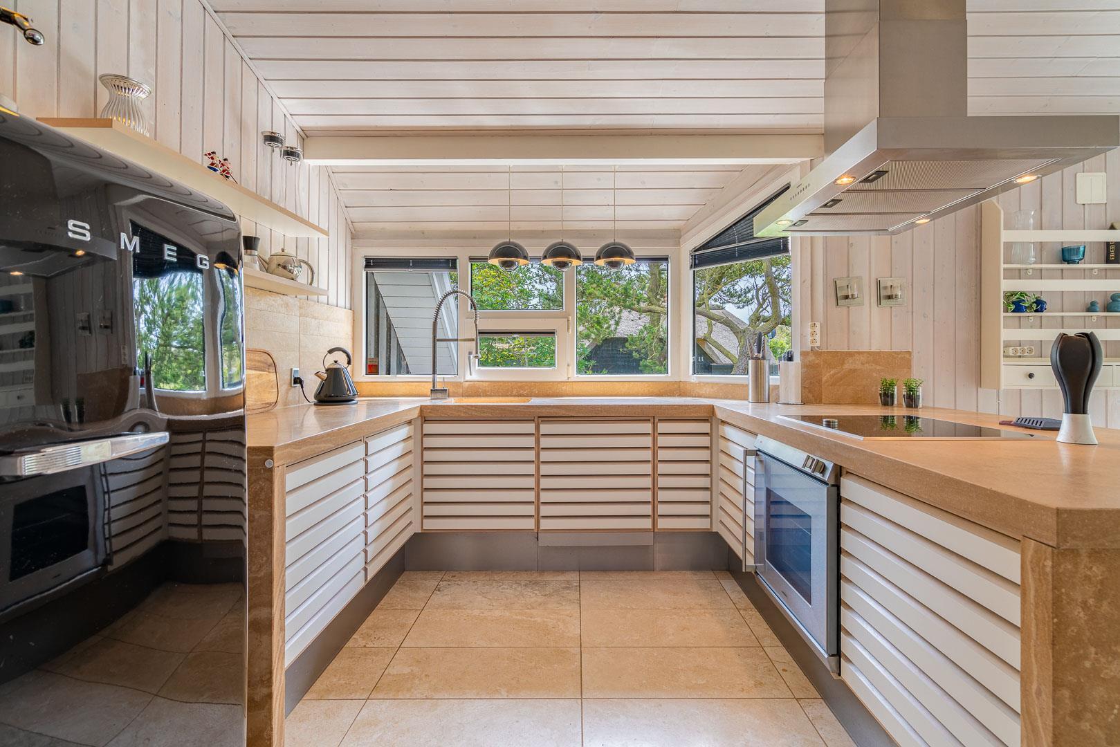 Her er opholds- og spiseafdeling med lækre designermøbler og -lamper, brændeovn, og travertingulve med varme, køkken med udstyr fra Smeg, Gaggenau og Uniform samt stort køkkenbord i massiv travertin.