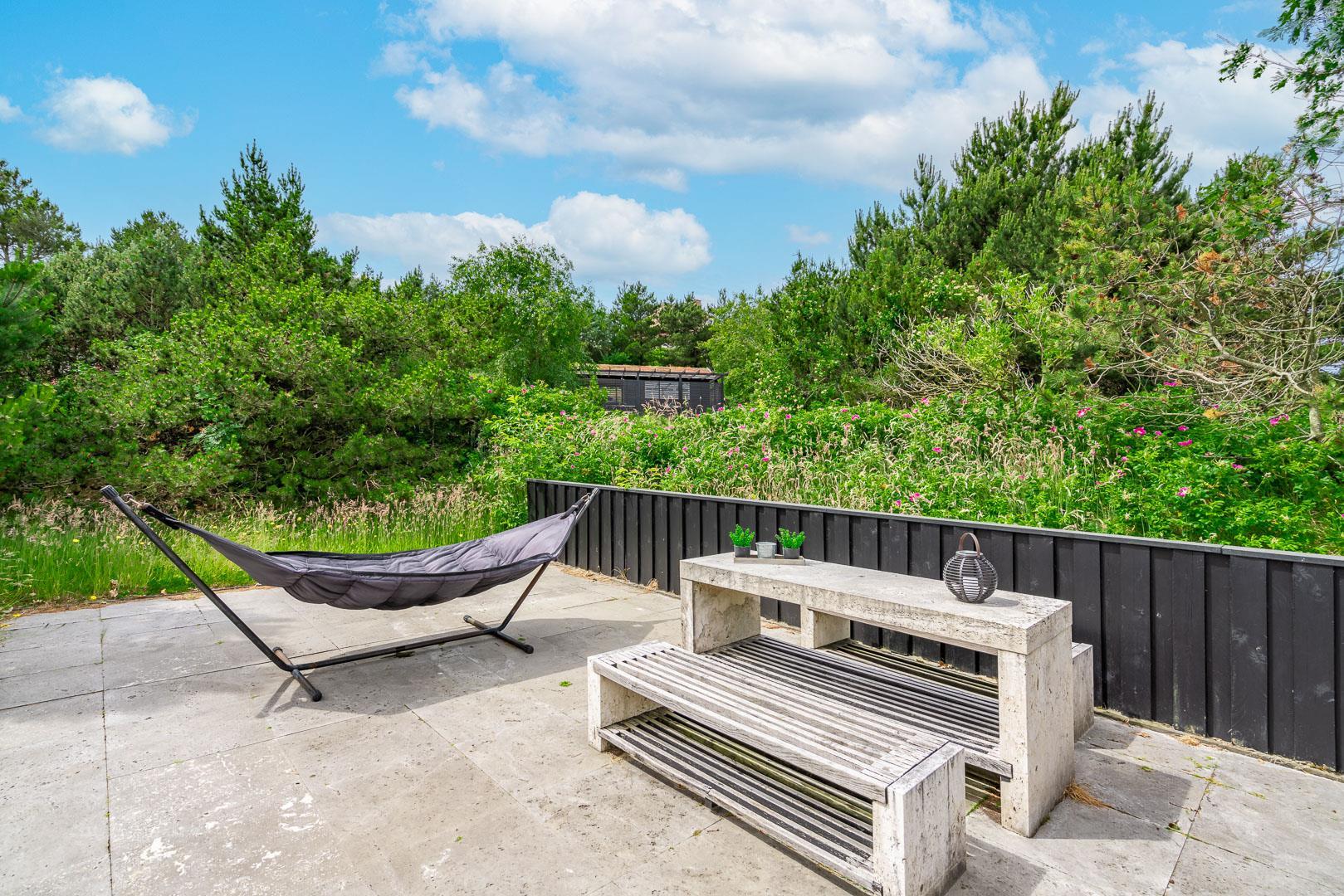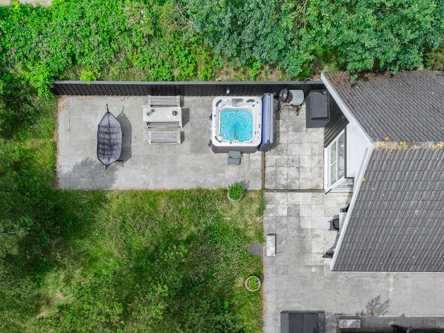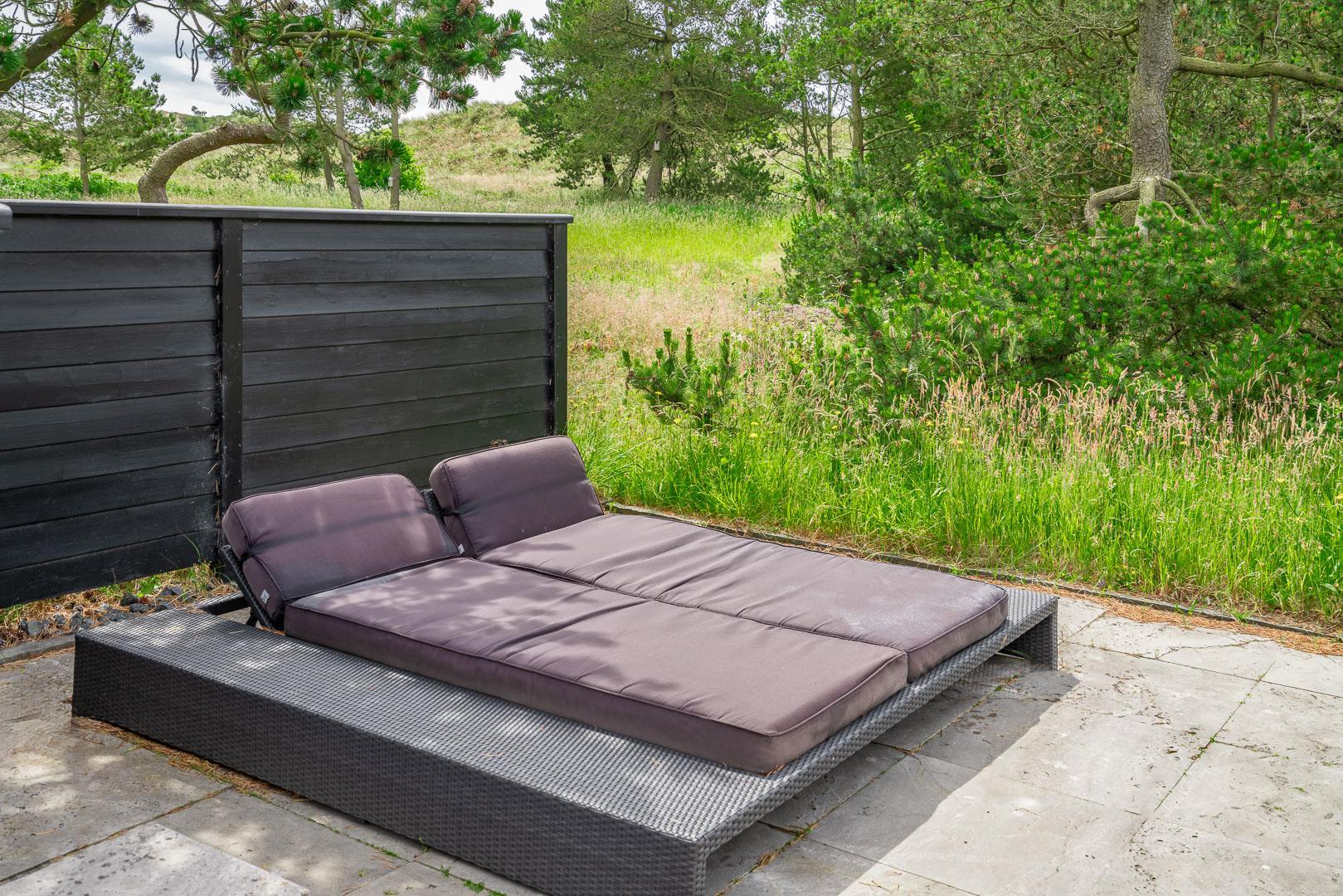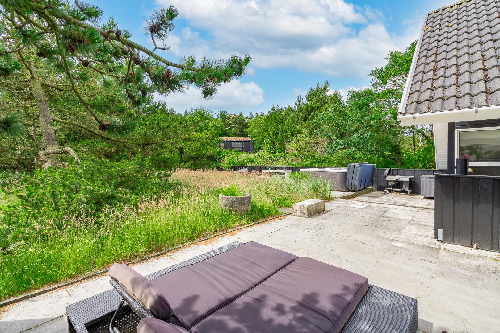 Udenfor er der masser af muligheder for både læ og sol på den over 150 m2 store, flisebelagte terrasse, som nærmest omkranser huset, og hvor der bl.a. findes stor dobbelt solseng, grill, fatboy og diverse havemøbler.