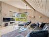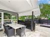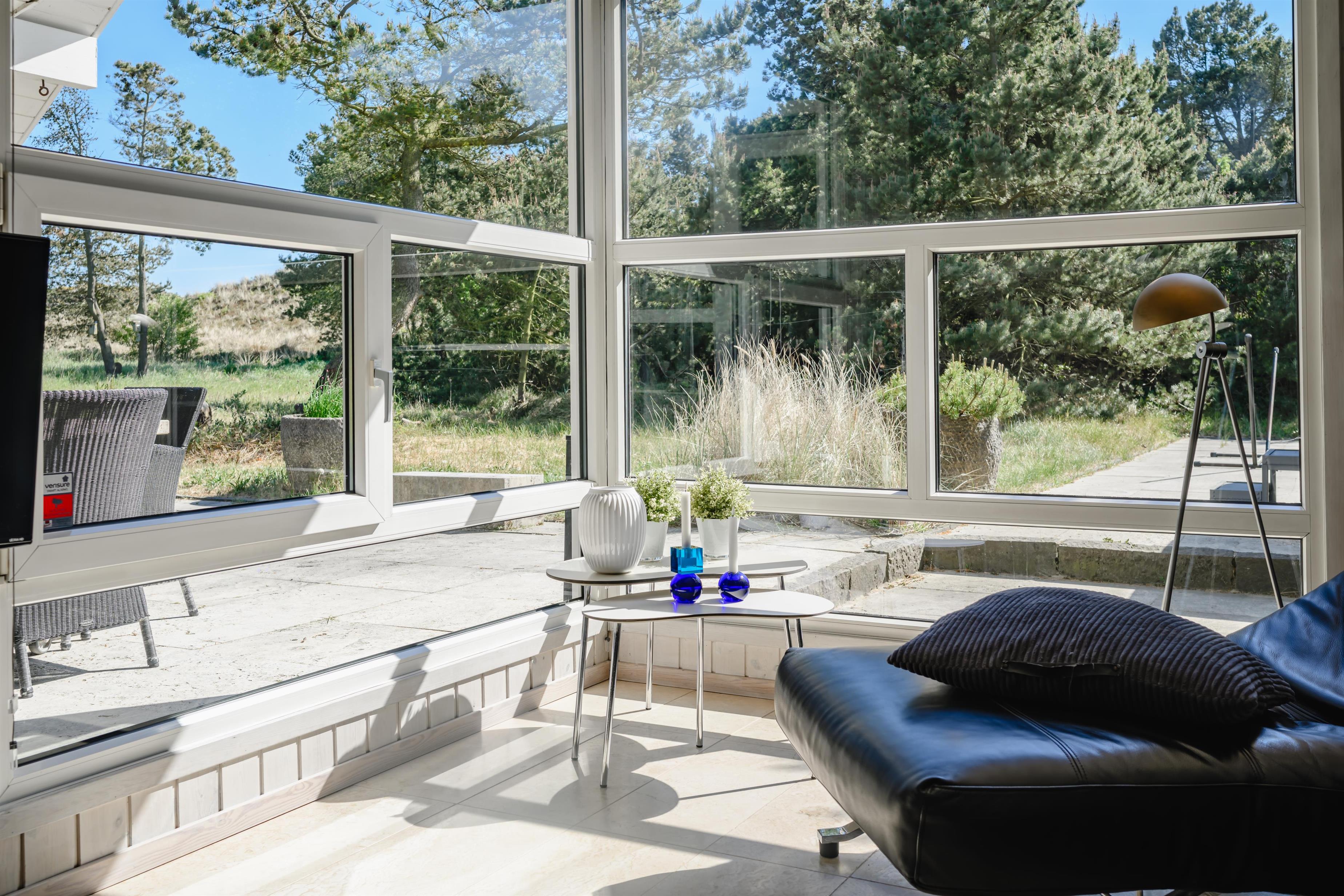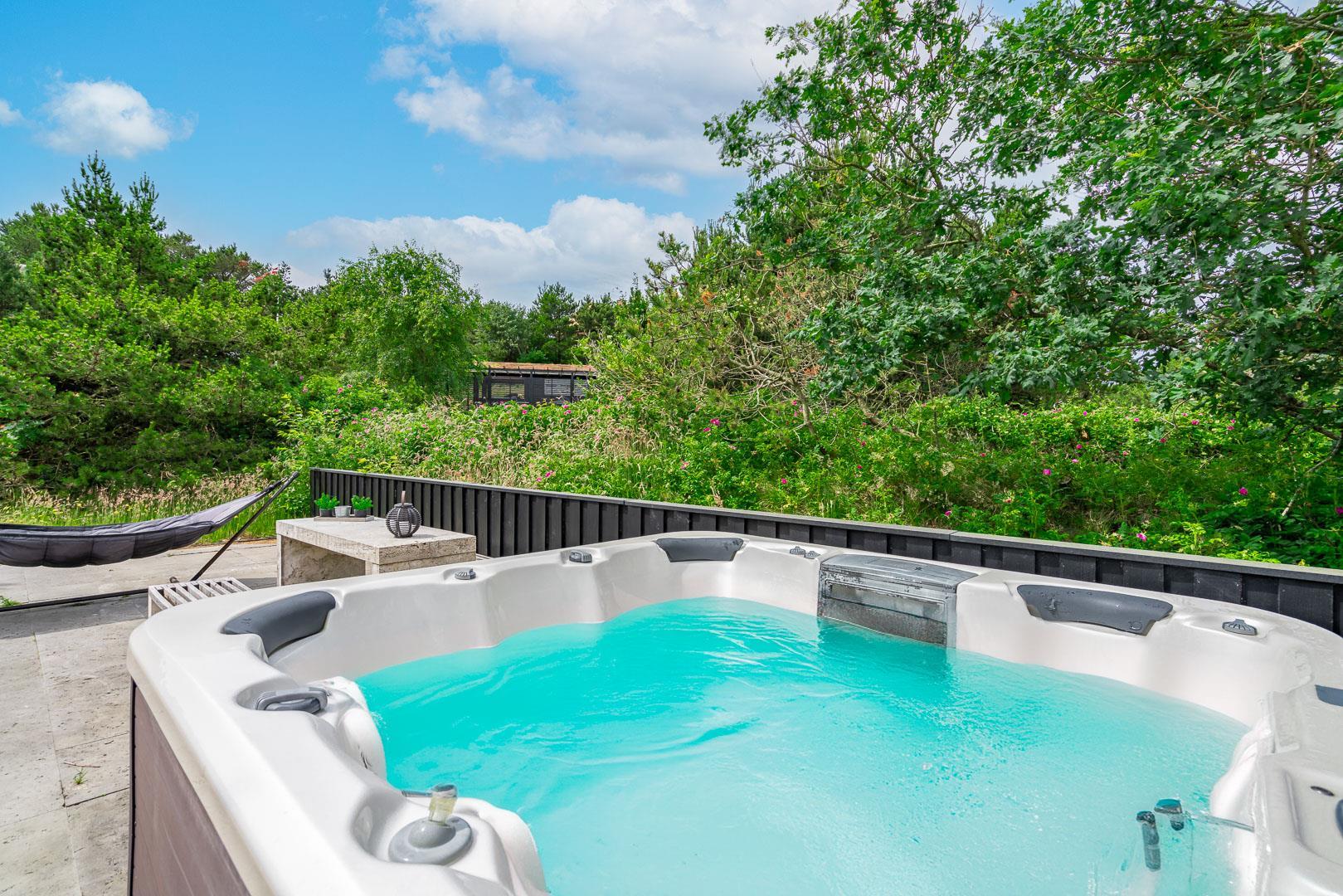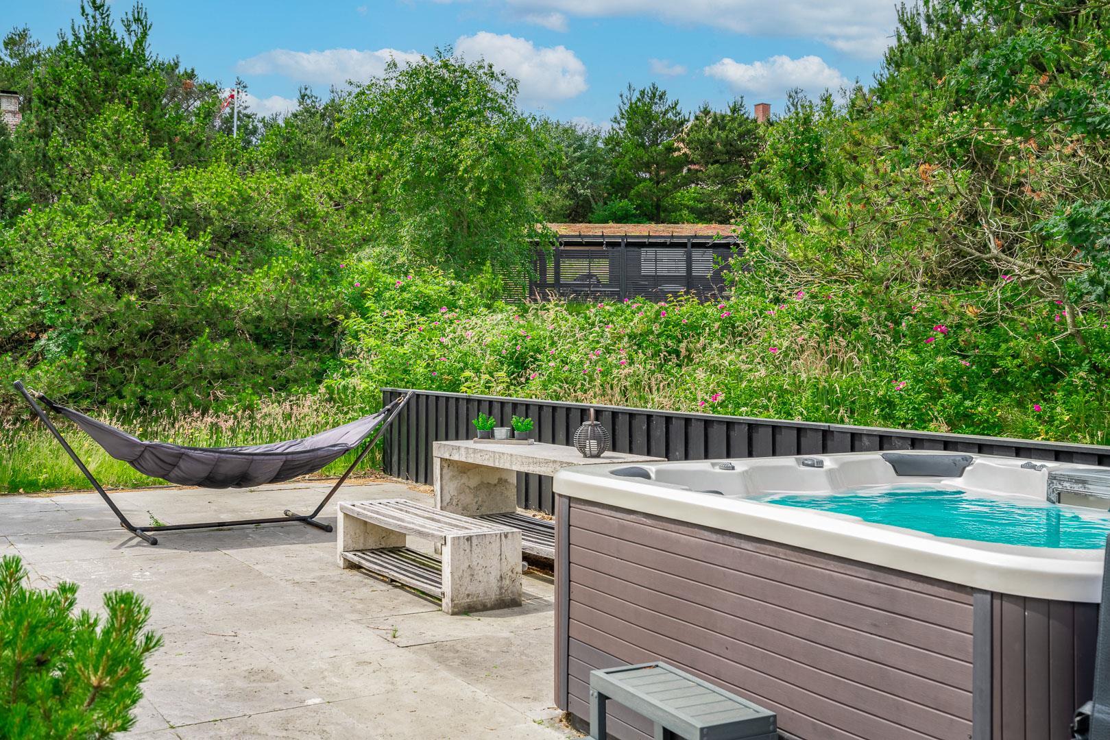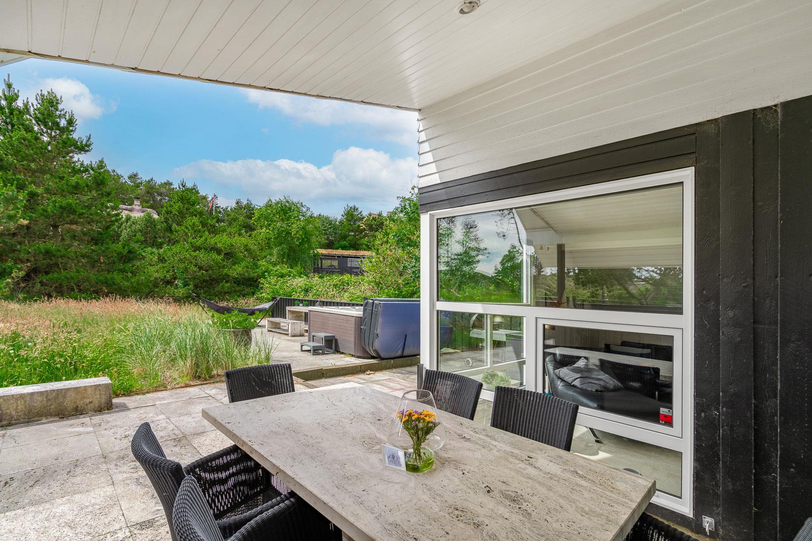 Udenfor er der masser af muligheder for både læ og sol på den over 150 m2 store, flisebelagte terrasse, som nærmest omkranser huset, og hvor der bl.a. findes stor dobbelt solseng, grill, fatboy og diverse havemøbler.