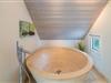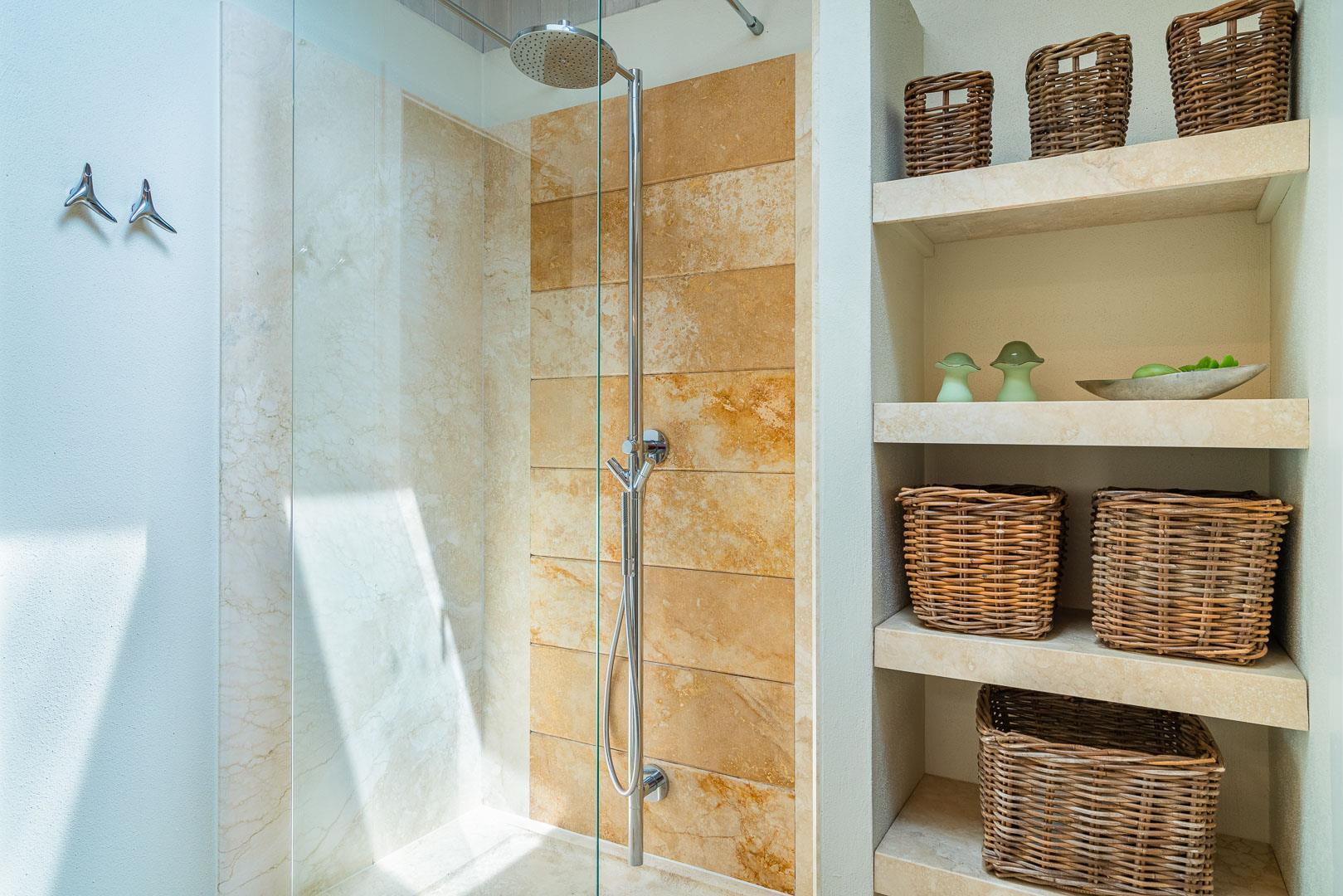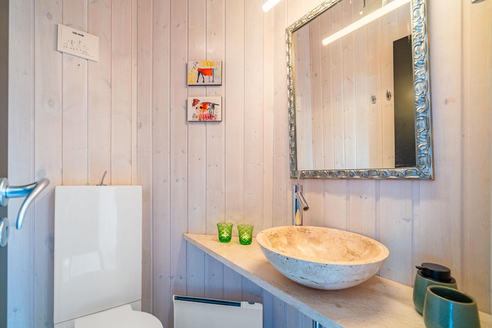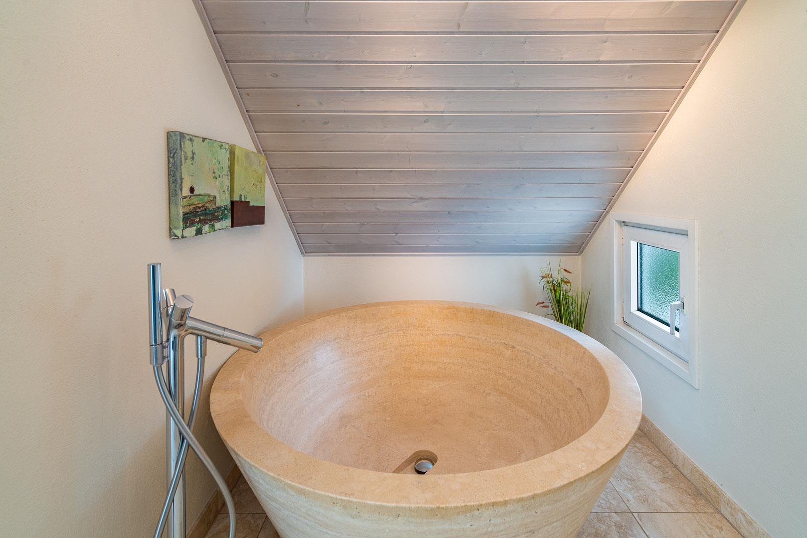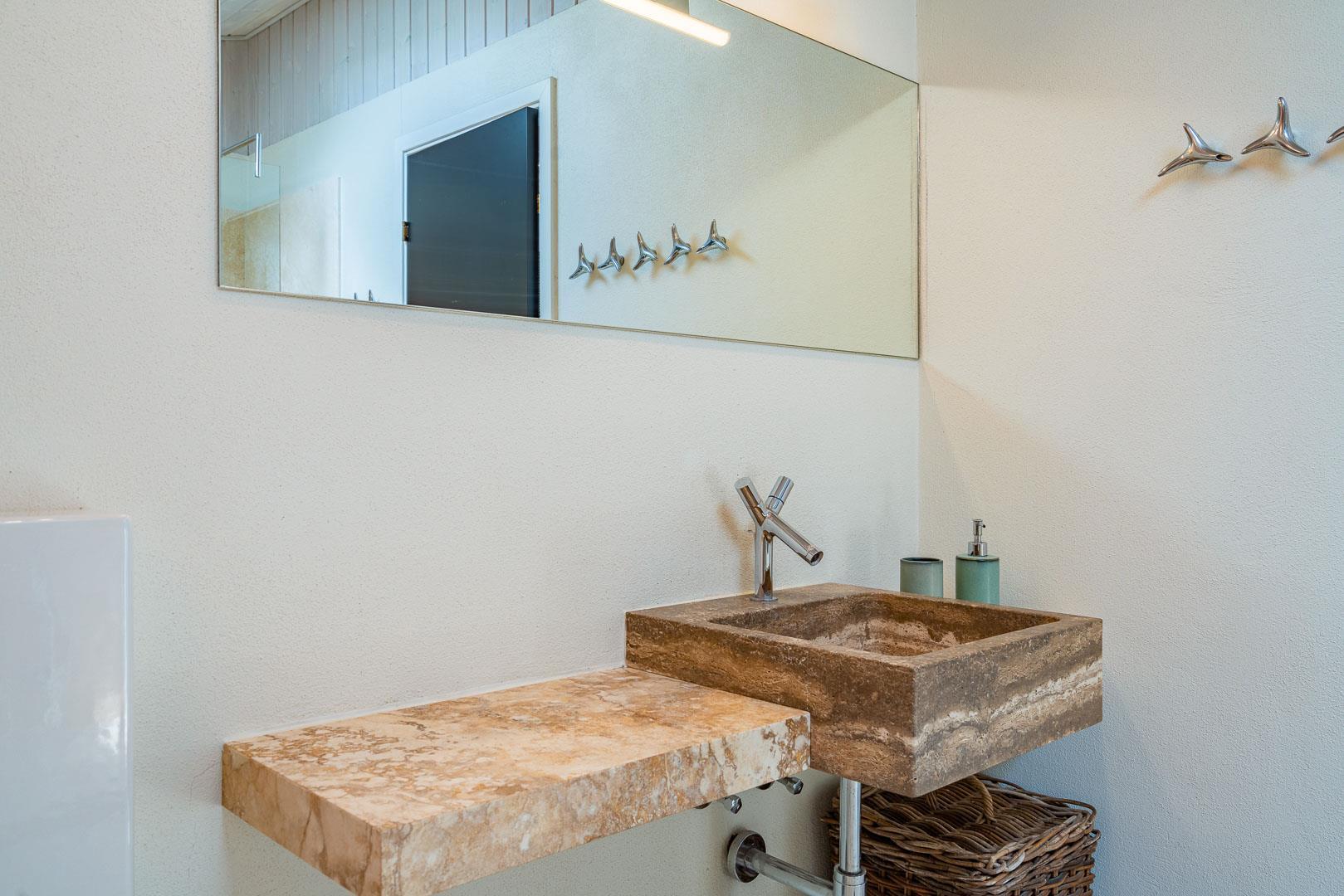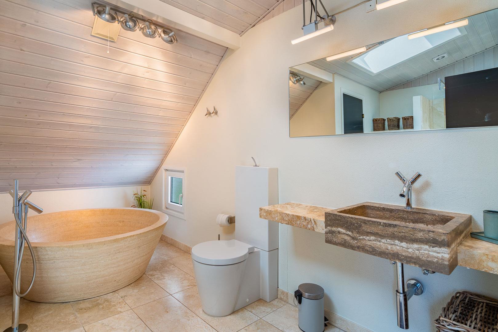 Bad og gæstetoilet ligeledes holdt i travertin og med lækkert udstyr, bl.a. stort rundt badekar og skøn bruseafdeling.