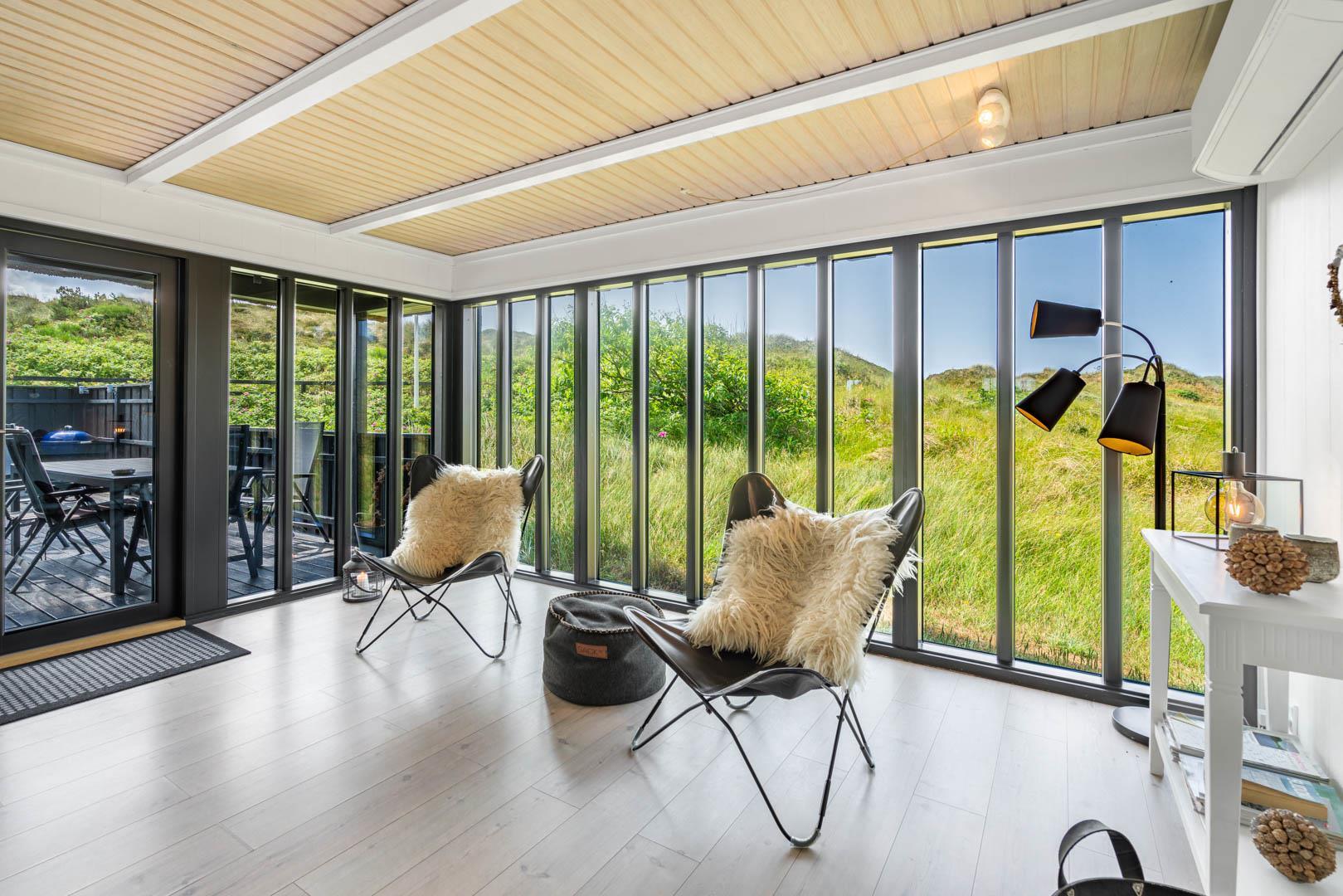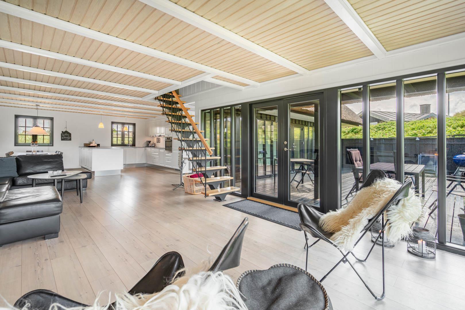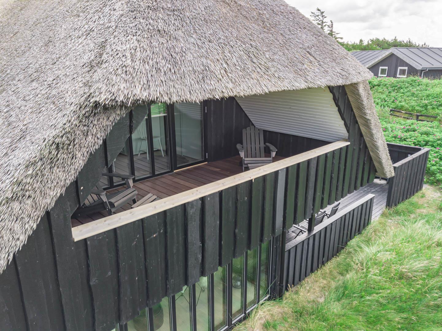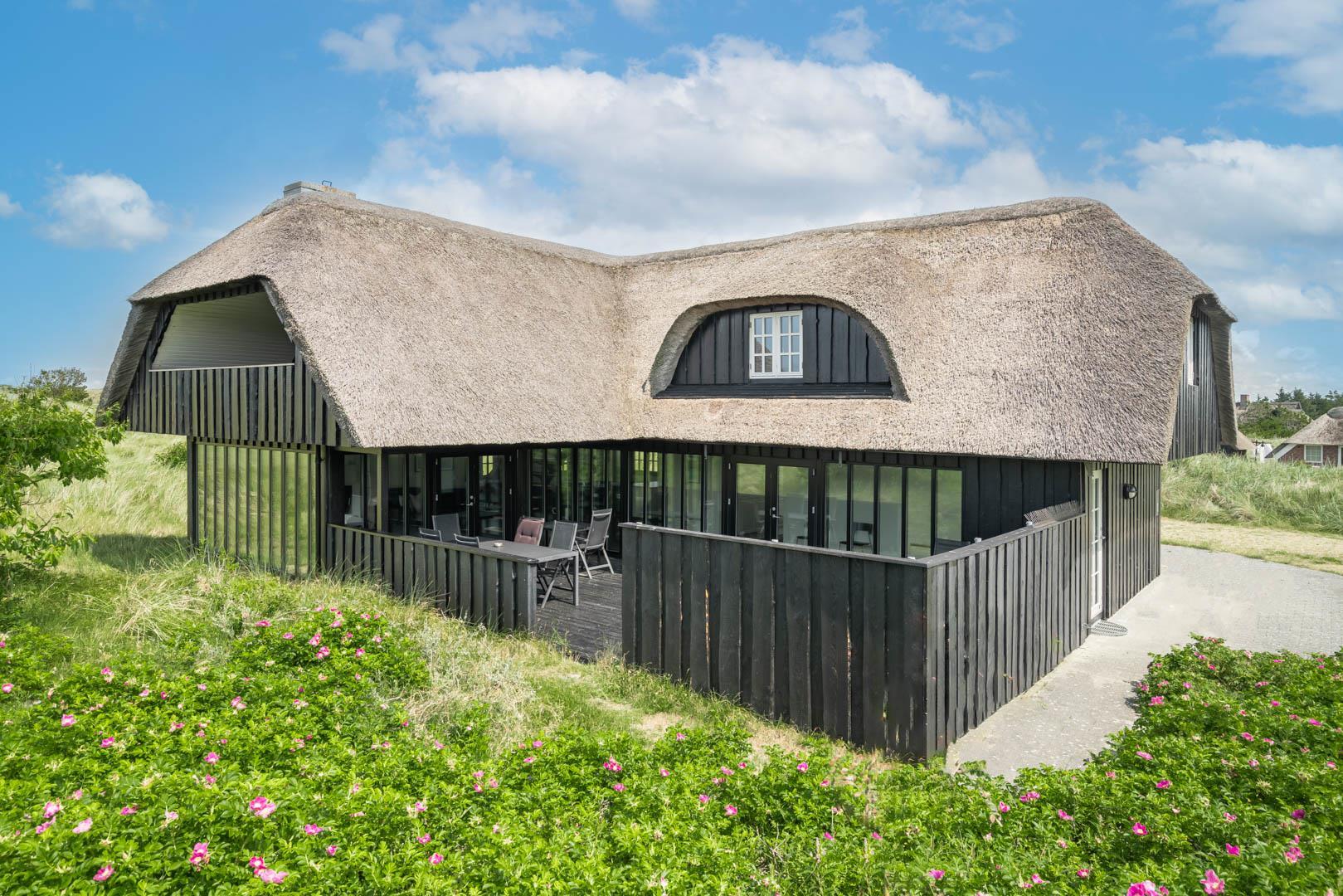 Sommerhusets charmerende ydre med stråtag, sortmalet træbeklædning og hvide sprossevinduer er som en lille reminder om en tid, hvor alt var mere simpelt, hvor himlen var mere blå og solen skinnede hele sommeren. Og det føles næsten også som en mere simpel tid, når man er på ferie her, for naturens rolige lyde, og den måde marehalmen vajer i vinden på, udenfor de store panoramavinduer, gør, at man automatisk sænker skuldrene og slipper hverdagens travlhed og bekymringer.