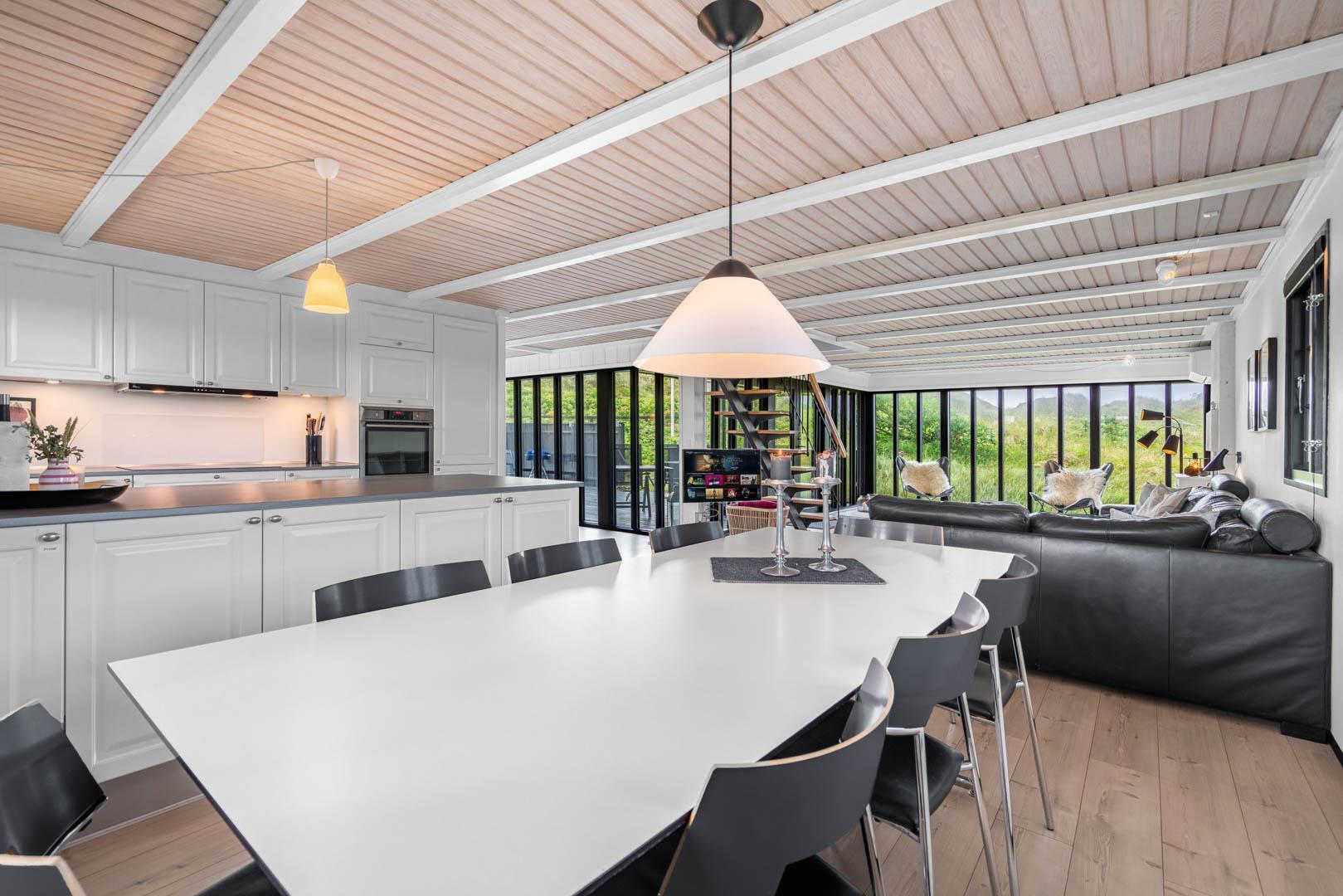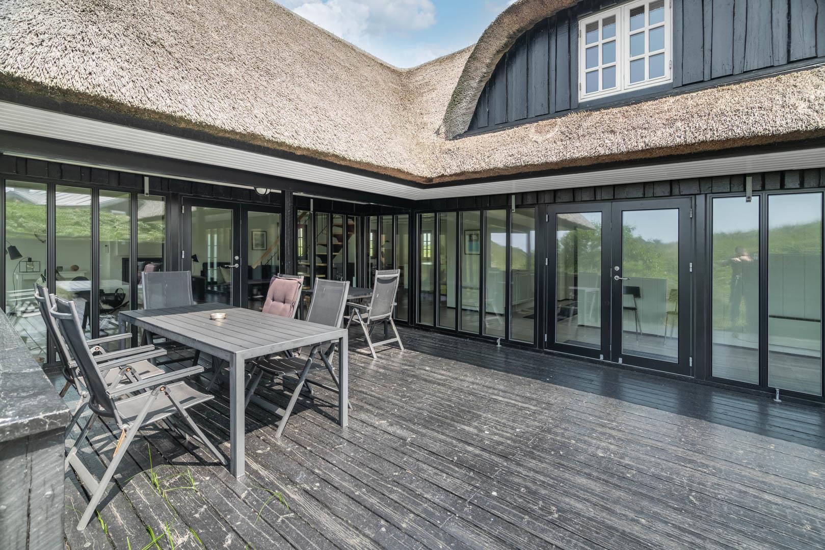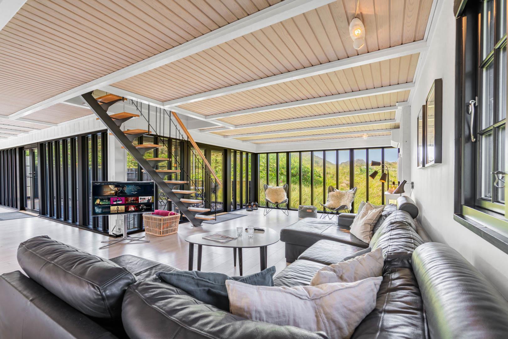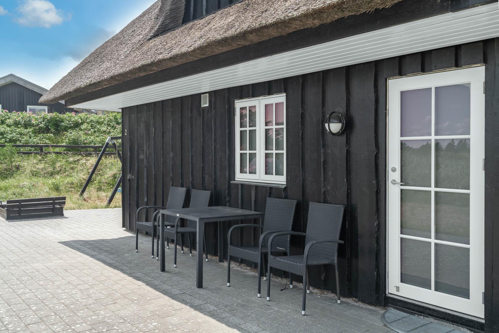Sommerhusets charmerende ydre med stråtag, sortmalet træbeklædning og hvide sprossevinduer er som en lille reminder om en tid, hvor alt var mere simpelt, hvor himlen var mere blå og solen skinnede hele sommeren. Og det føles næsten også som en mere simpel tid, når man er på ferie her, for naturens rolige lyde, og den måde marehalmen vajer i vinden på, udenfor de store panoramavinduer, gør, at man automatisk sænker skuldrene og slipper hverdagens travlhed og bekymringer.