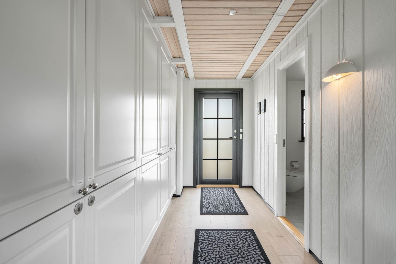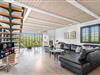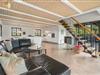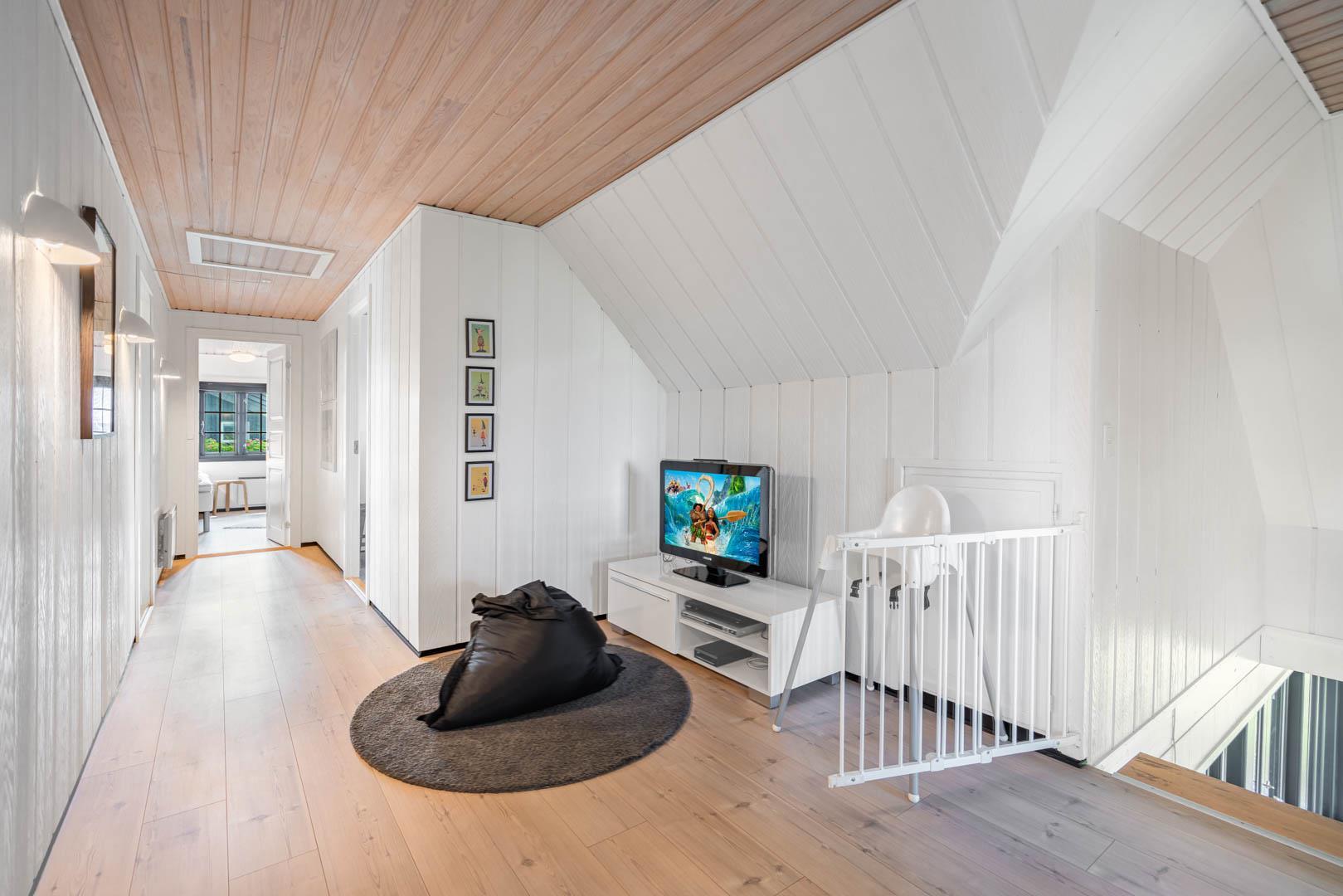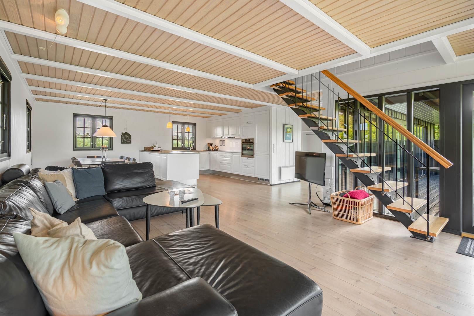 Husets 200 m2 er fordel på to plan med badeværelse i begge. Førstesalen rummer soveafdelingen, mens opholdsrummene ligger i åben forbindelse i stueplan og har indbygget pejs. Badeværelset hernede har både spabad og sauna.