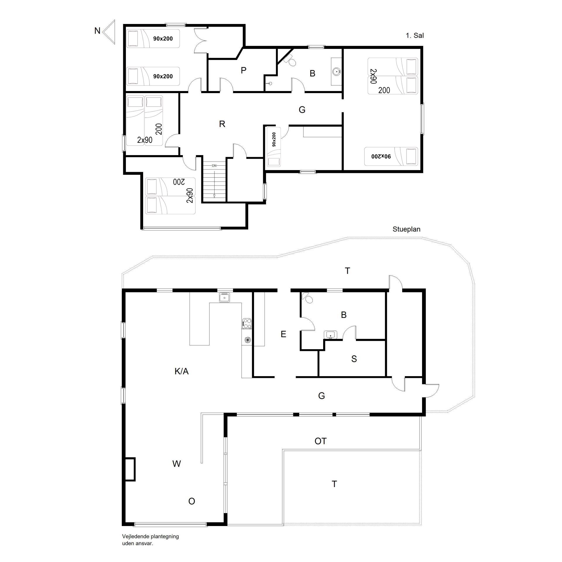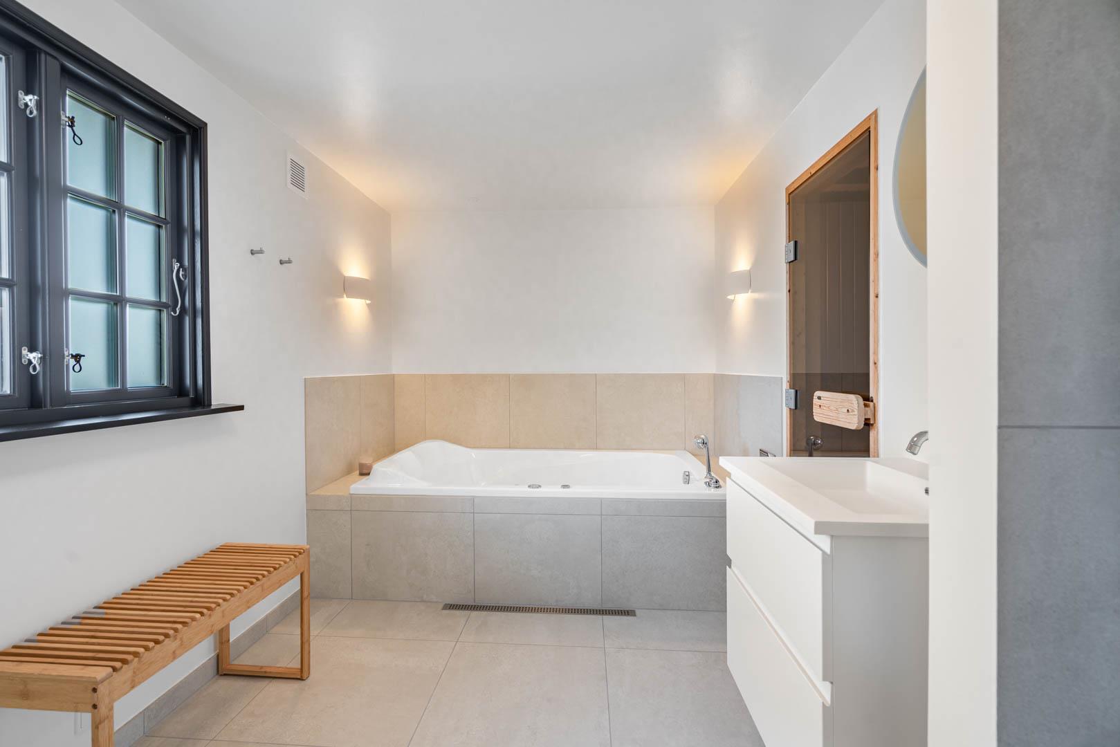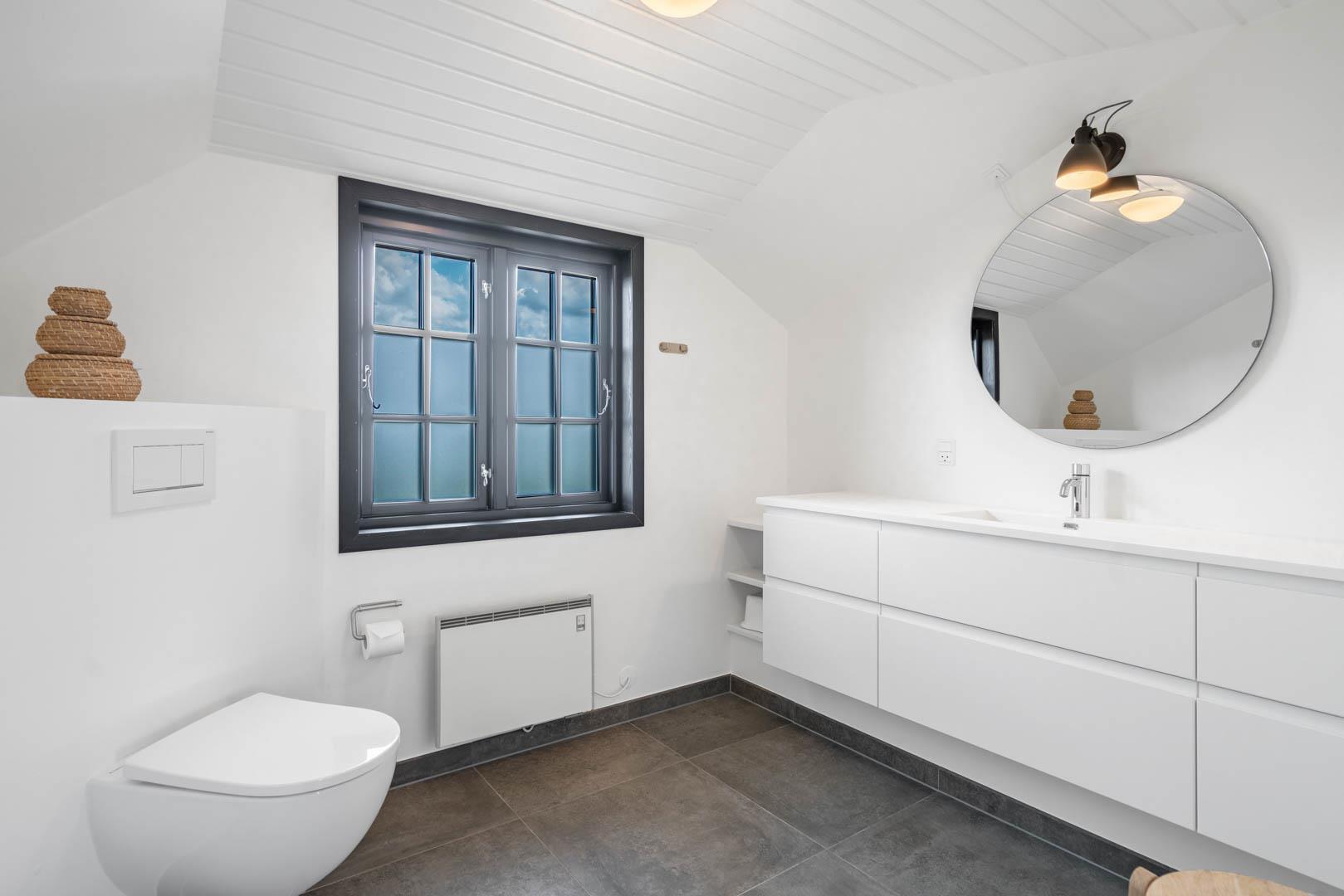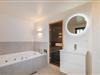 Husets 200 m2 er fordel på to plan med badeværelse i begge. Førstesalen rummer soveafdelingen, mens opholdsrummene ligger i åben forbindelse i stueplan og har indbygget pejs. Badeværelset hernede har både spabad og sauna.