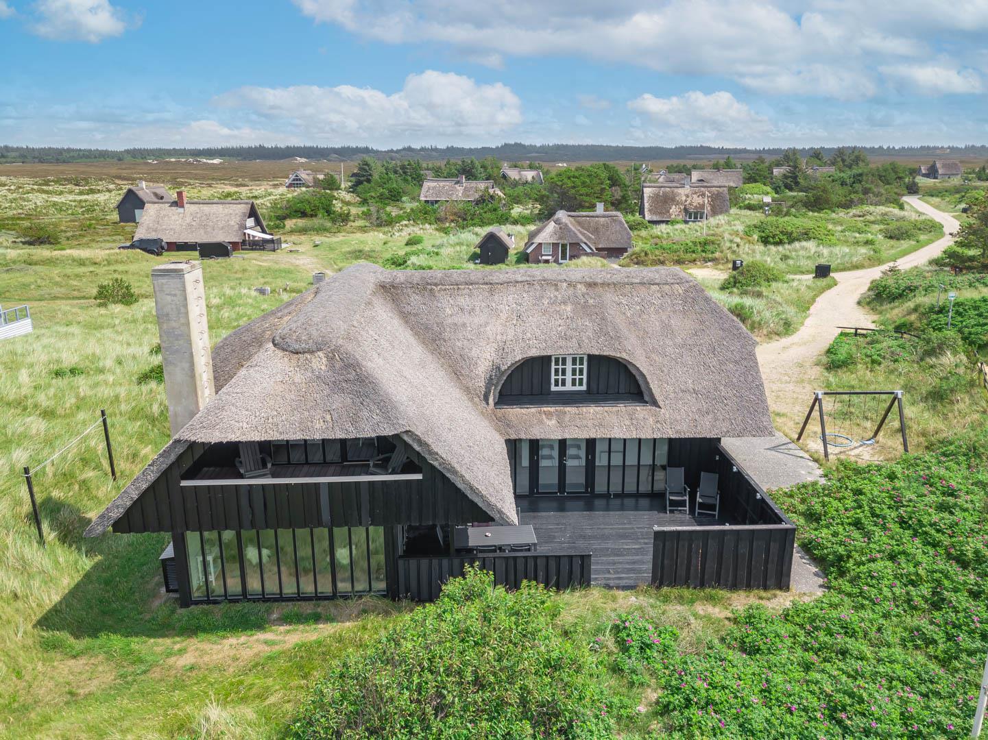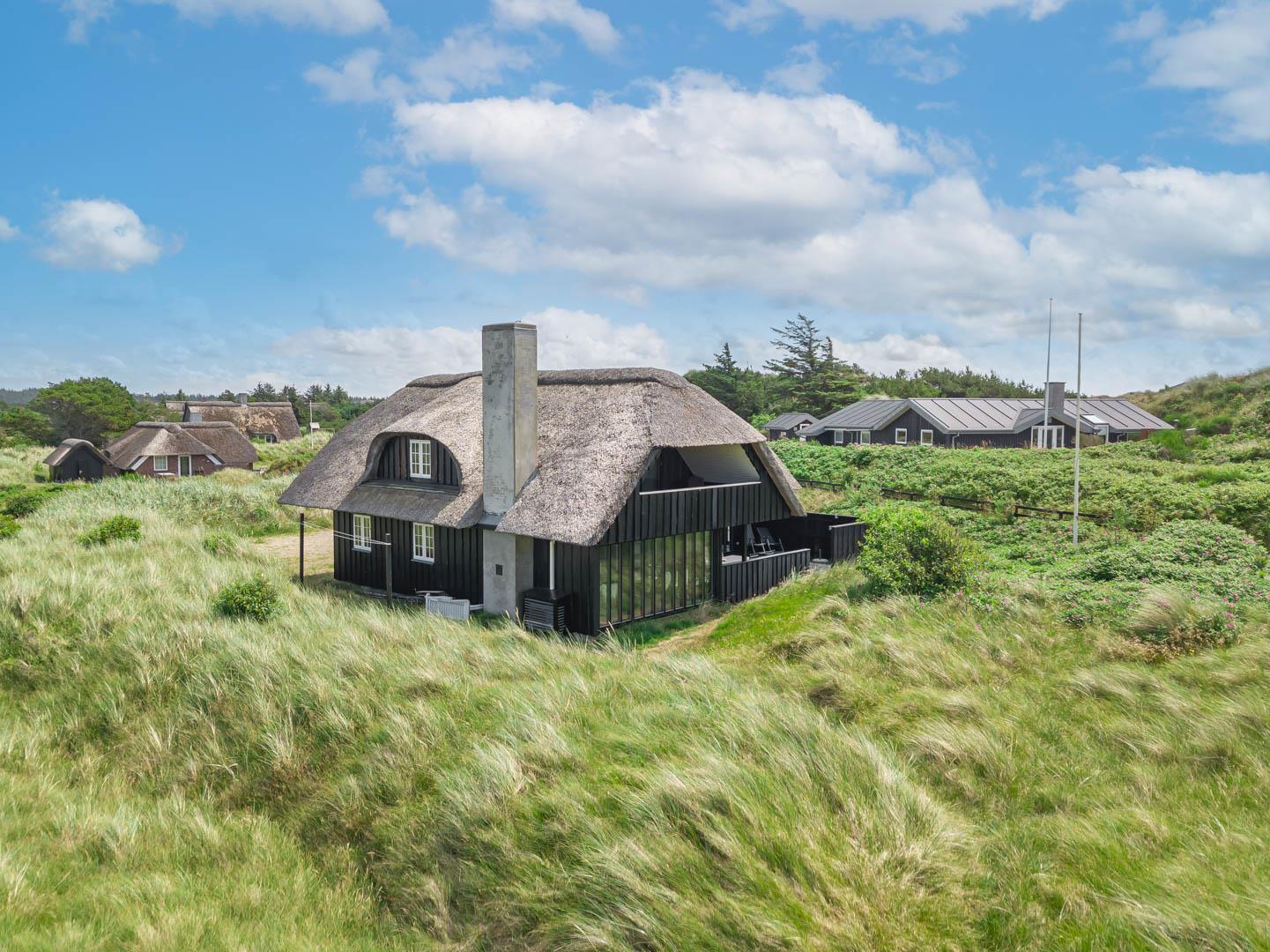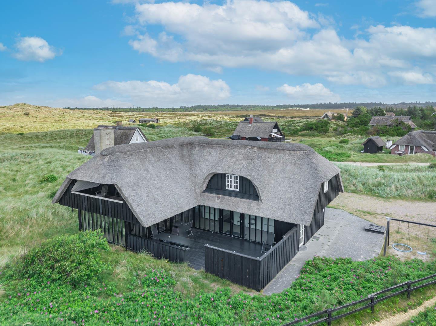 Drømmer I om fredelige feriedage i et feriehus med fantastiske faciliteter? Så kom helt ud i første klitrække, og mærk den tilbagelænede stemning på den store naturgrund, mens I nyder den storslåede udsigt i dette stråtækte hus, der ligger helt ugeneret i den nordligste del af Henne Strand.