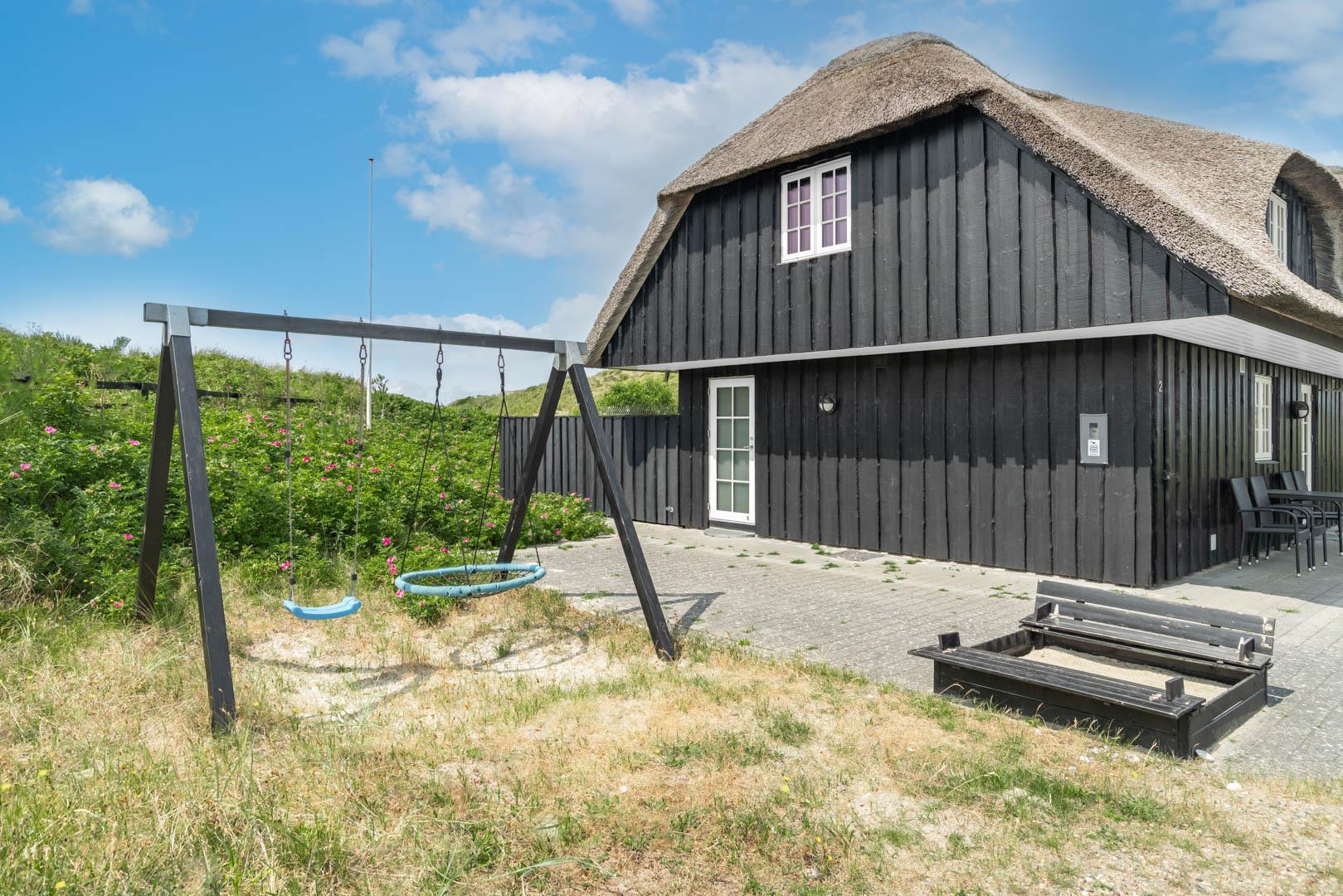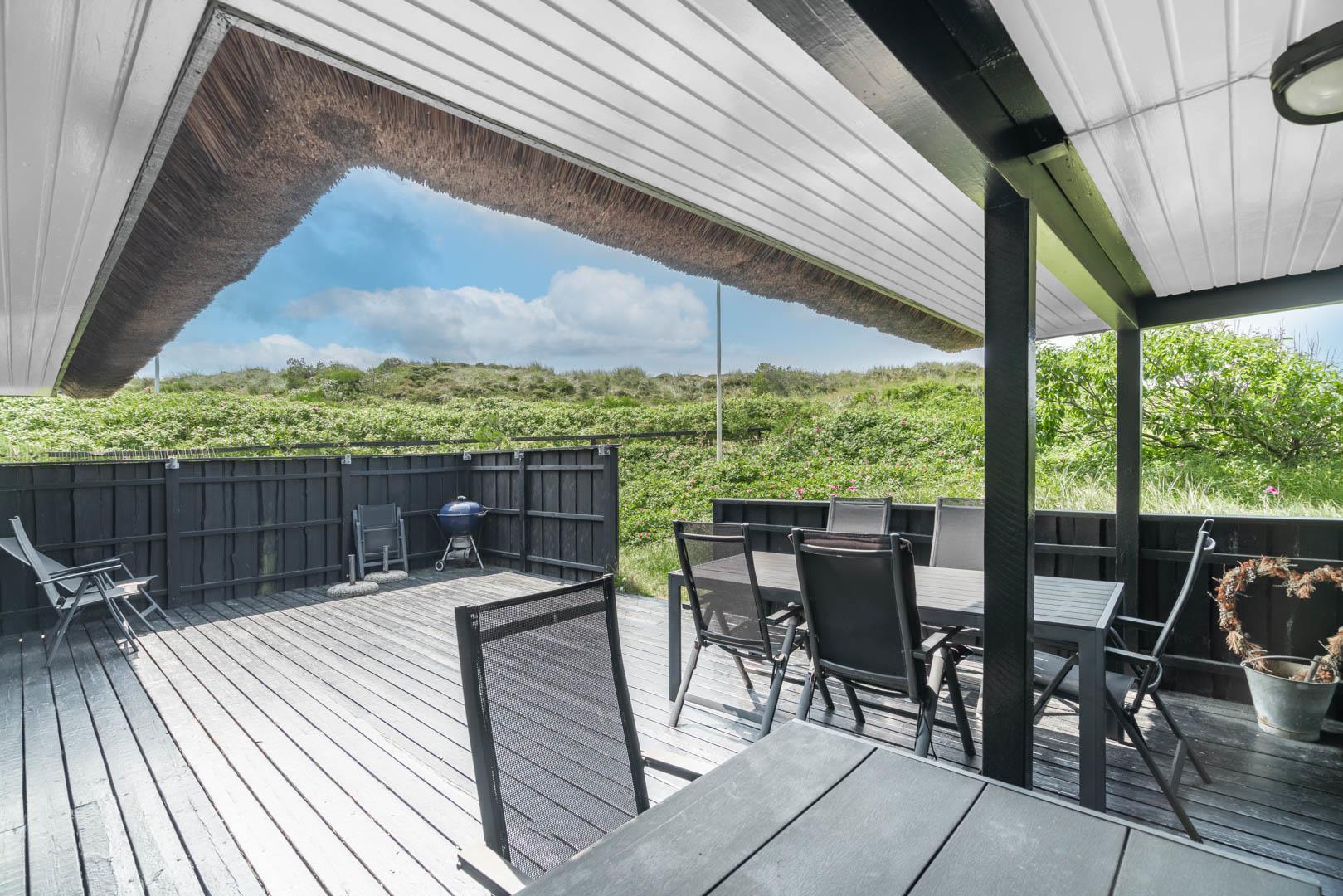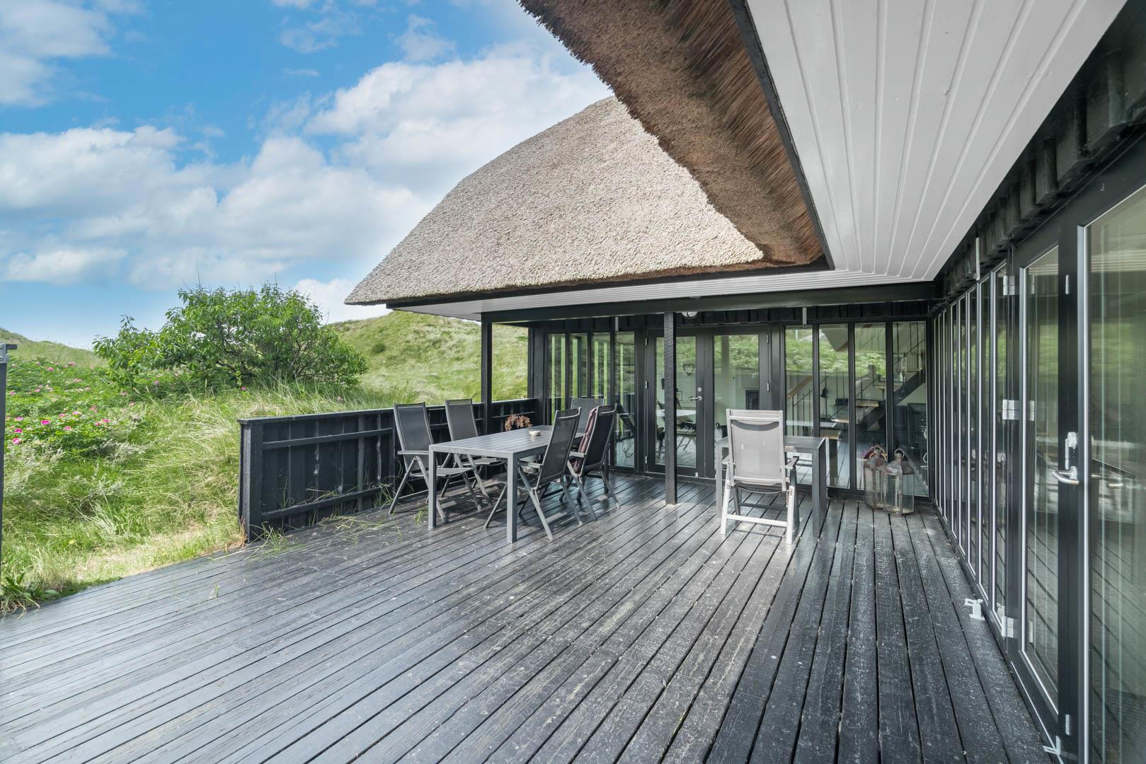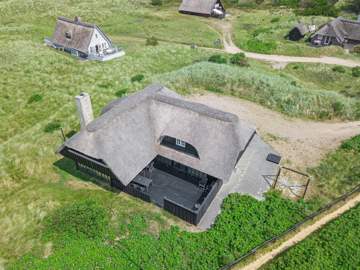 Drømmer I om fredelige feriedage i et feriehus med fantastiske faciliteter? Så kom helt ud i første klitrække, og mærk den tilbagelænede stemning på den store naturgrund, mens I nyder den storslåede udsigt i dette stråtækte hus, der ligger helt ugeneret i den nordligste del af Henne Strand.