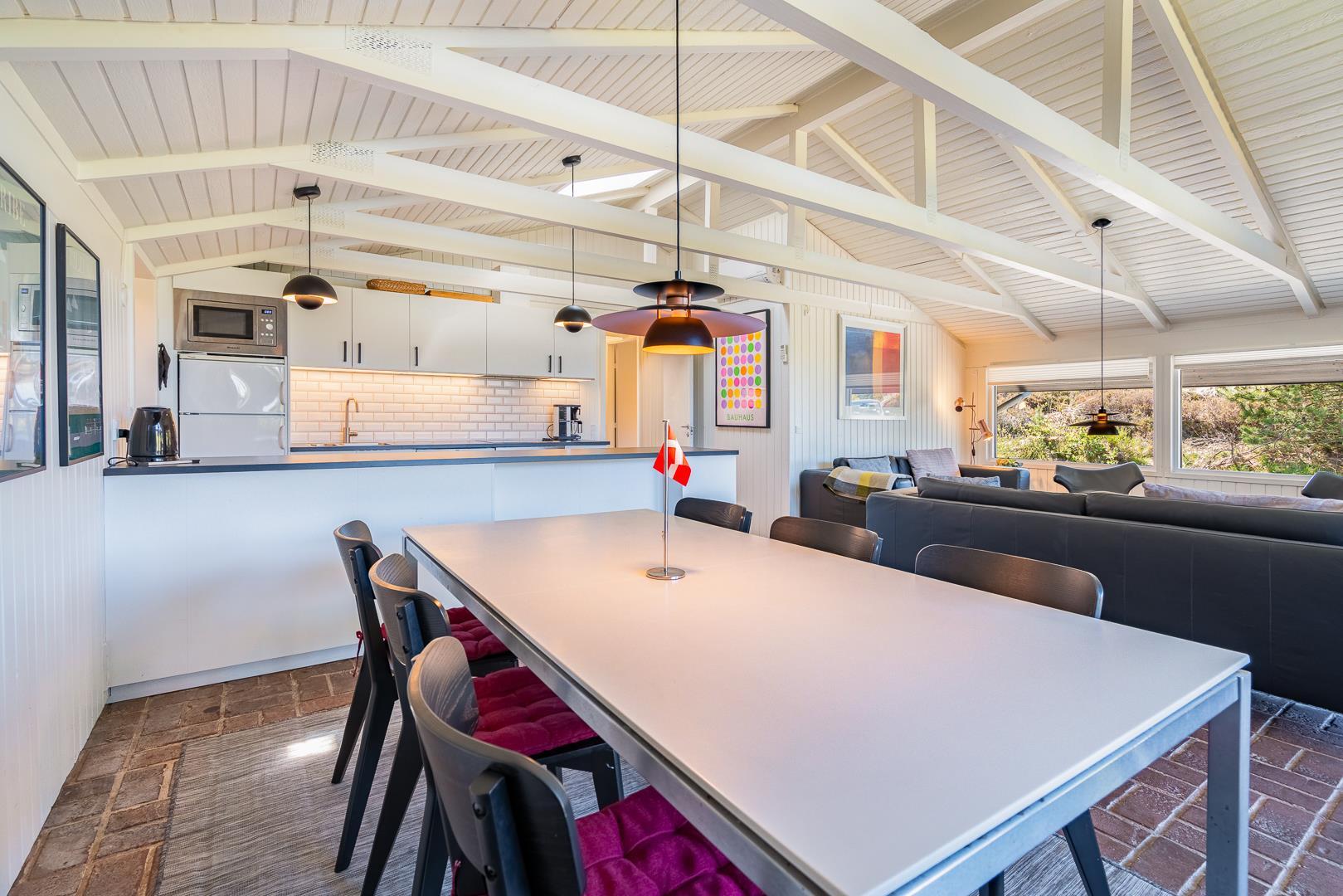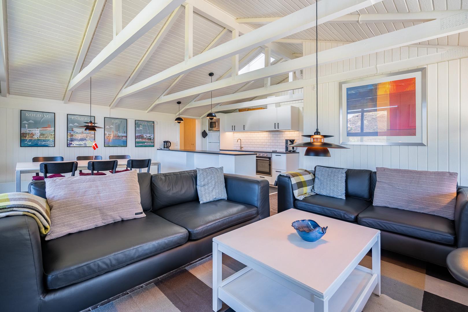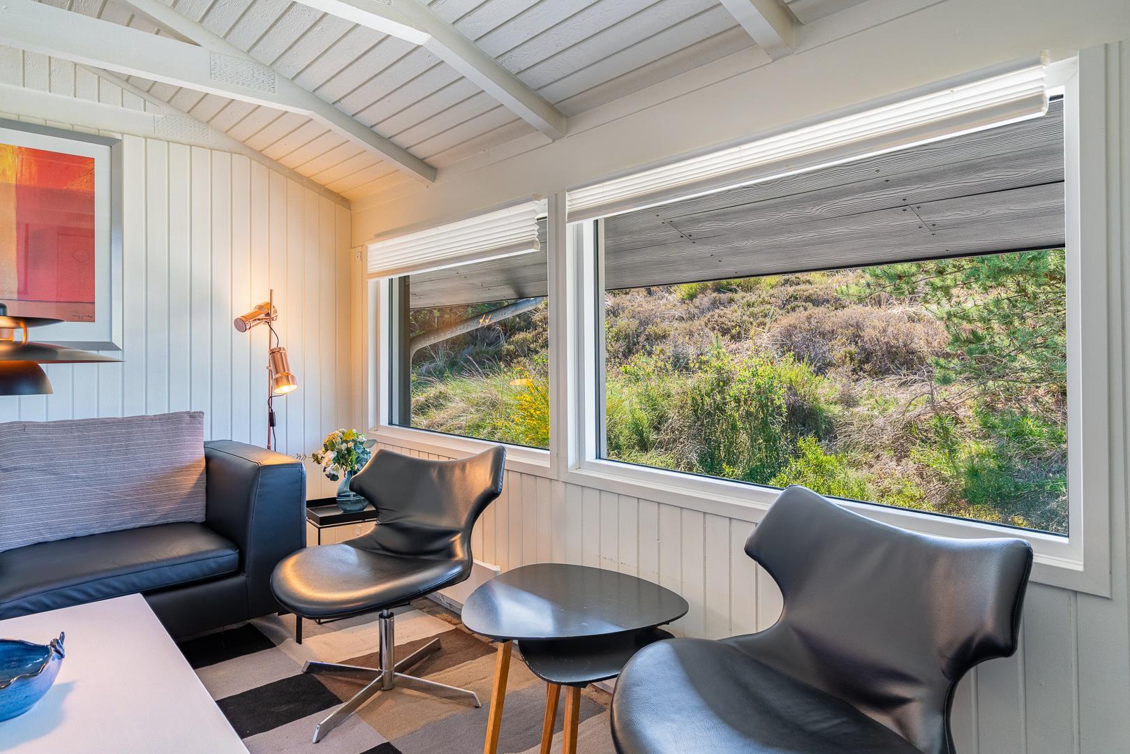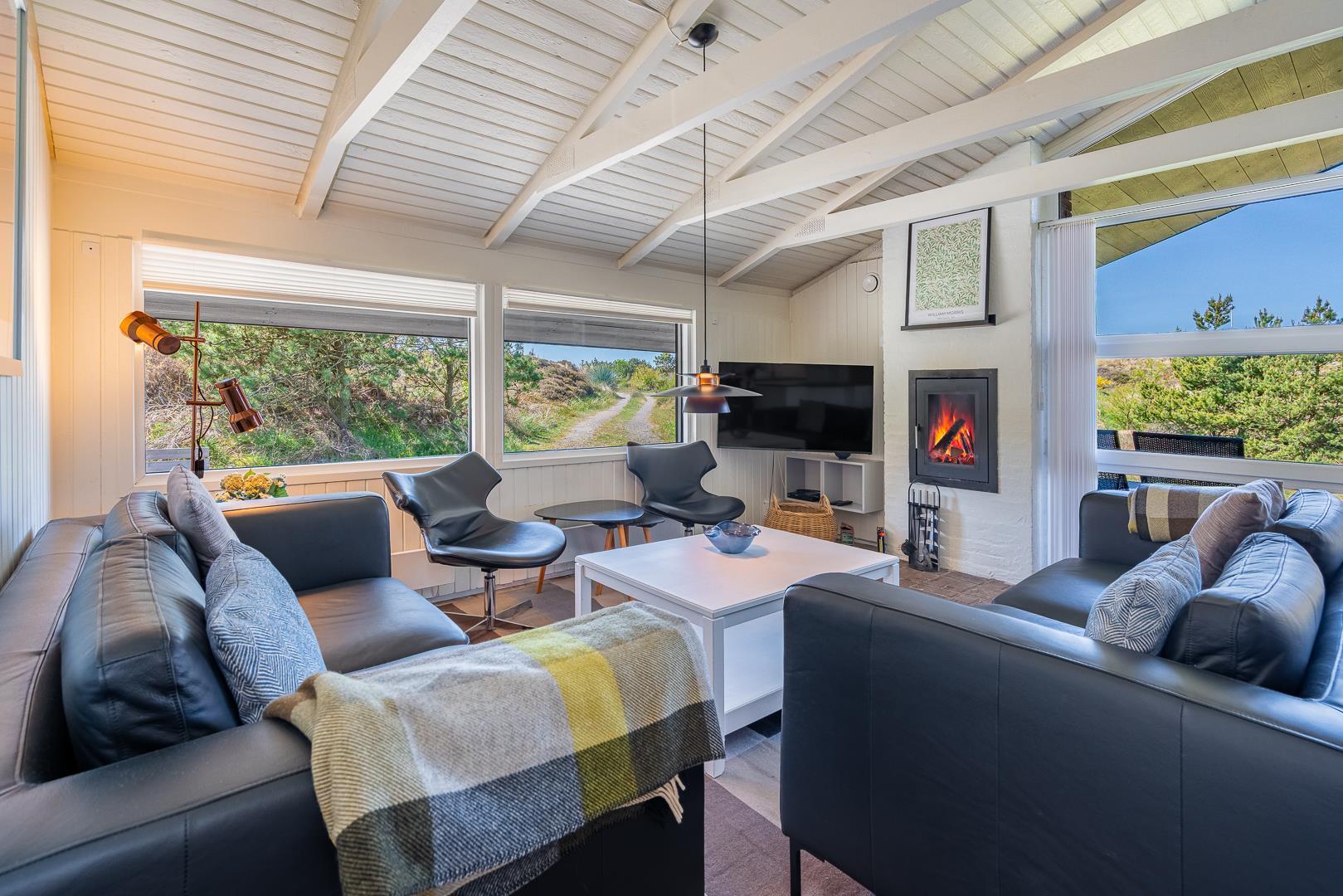 Hjelmevej 55 B, Henne Strand er hyggeligt feriehus med plads til 6 personer, er løbende blevet renoveret. Her er over alt lyse lofter og vægge, og et dejligt lysindfald i stuen. I opholdsstuen sørger brændeovnen for den rigtige hygge i en kold tid. Husets stue er smagfuld indrettet med komfortable kvalitets møbler.