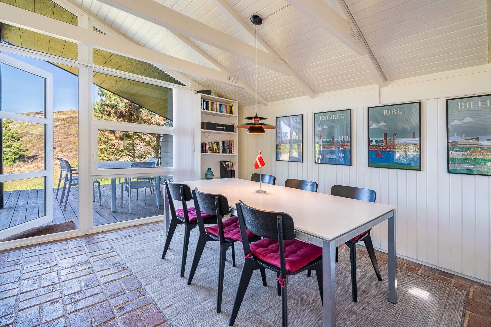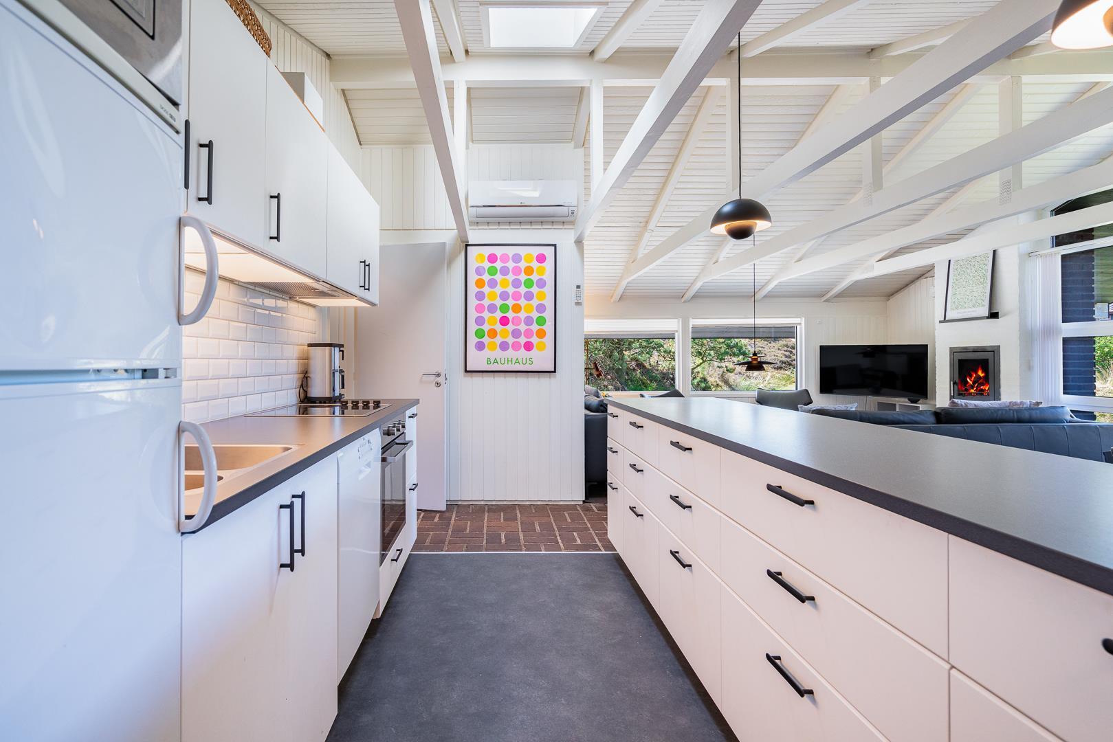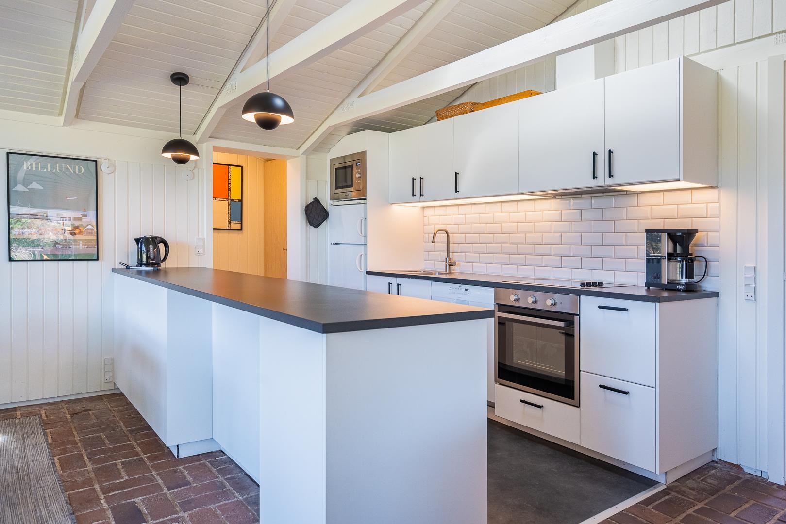 Hjelmevej 55 B, Henne Strand er hyggeligt feriehus med plads til 6 personer, er løbende blevet renoveret. Her er over alt lyse lofter og vægge, og et dejligt lysindfald i stuen. I opholdsstuen sørger brændeovnen for den rigtige hygge i en kold tid. Husets stue er smagfuld indrettet med komfortable kvalitets møbler.