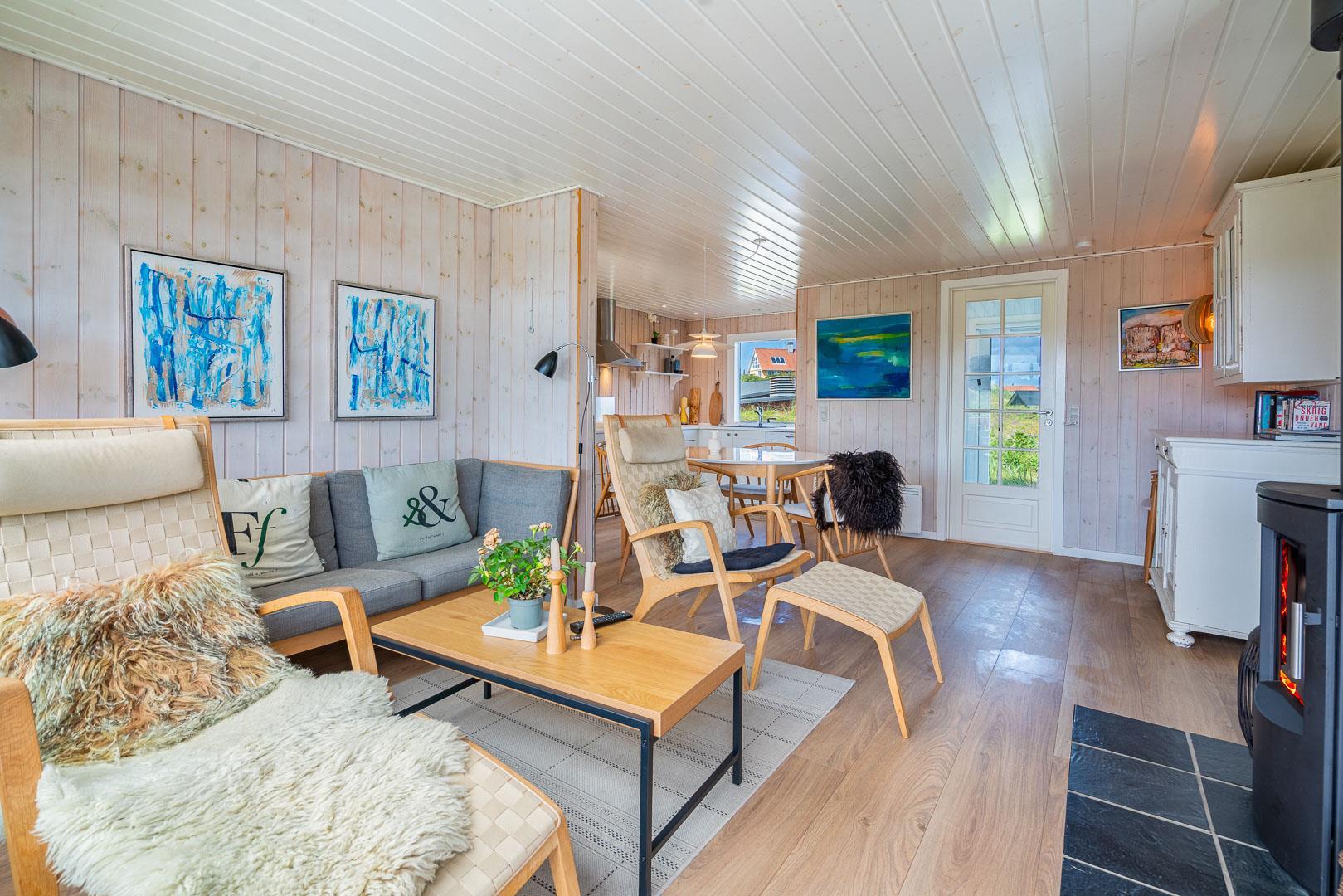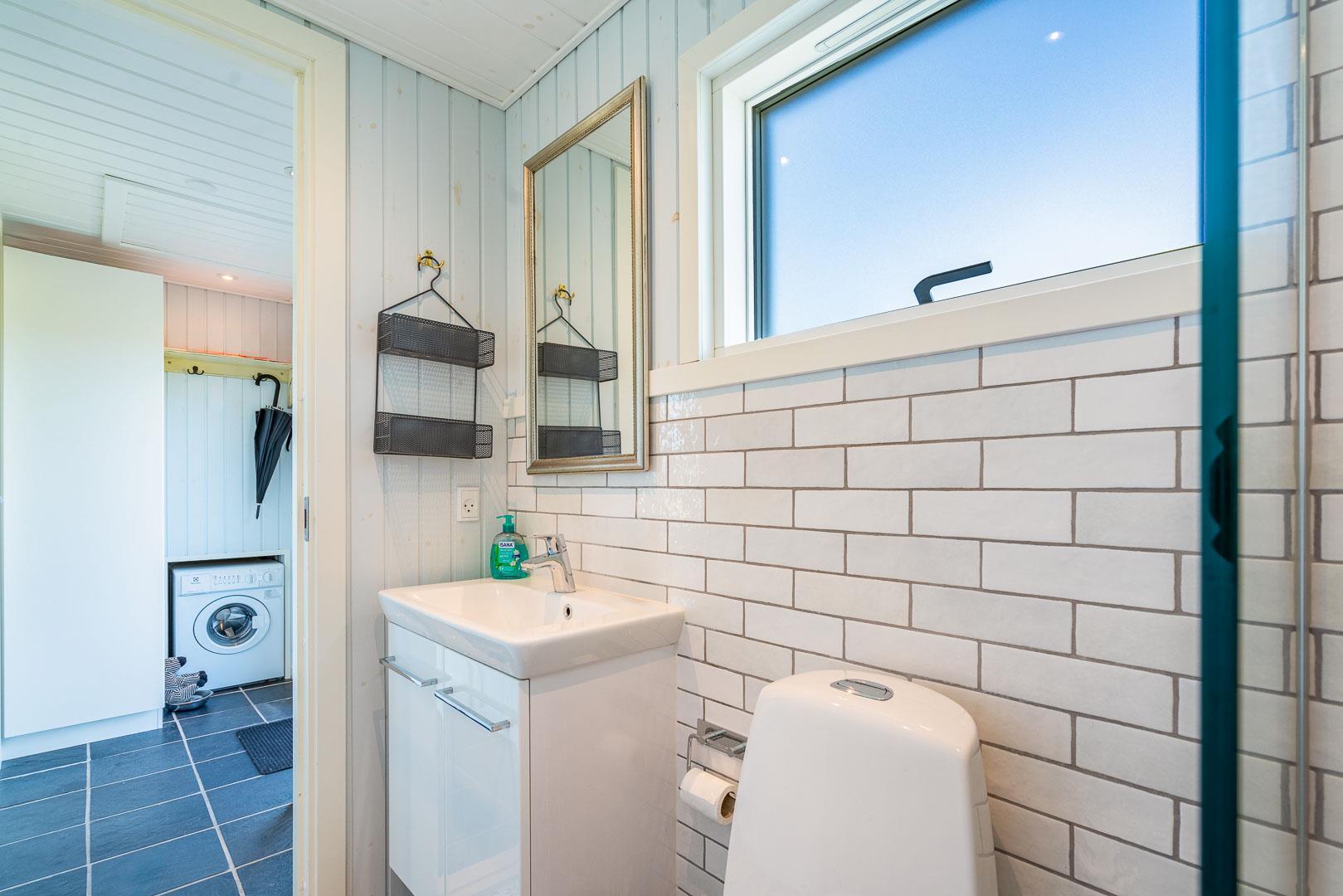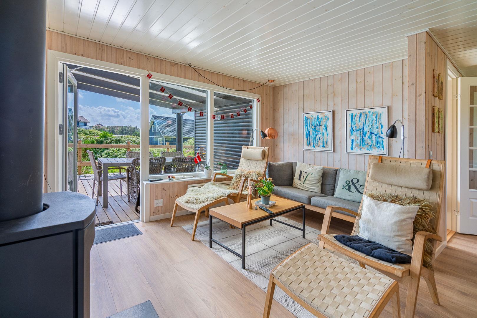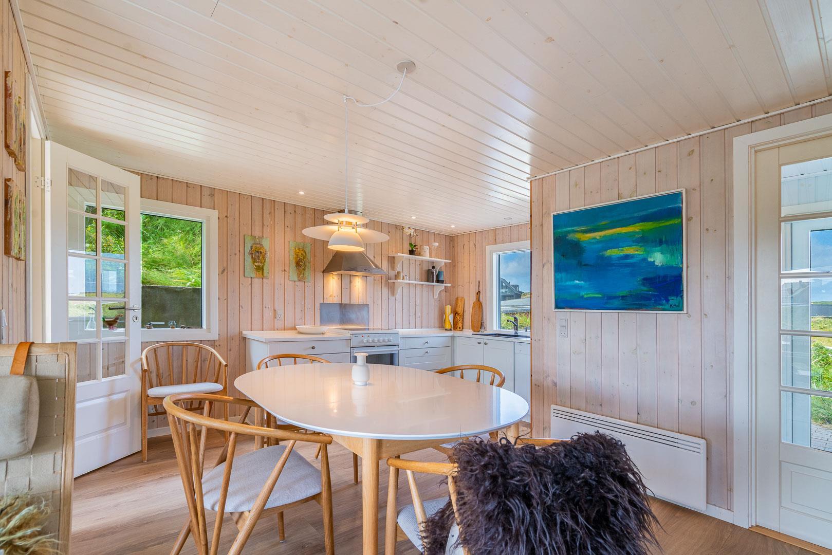 Flot badeværelse fra 2021. Husets køkken er i åben forbindelse med stuen, hvorfra der er udgang til overdækket terrasse med gode læforhold.