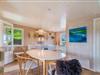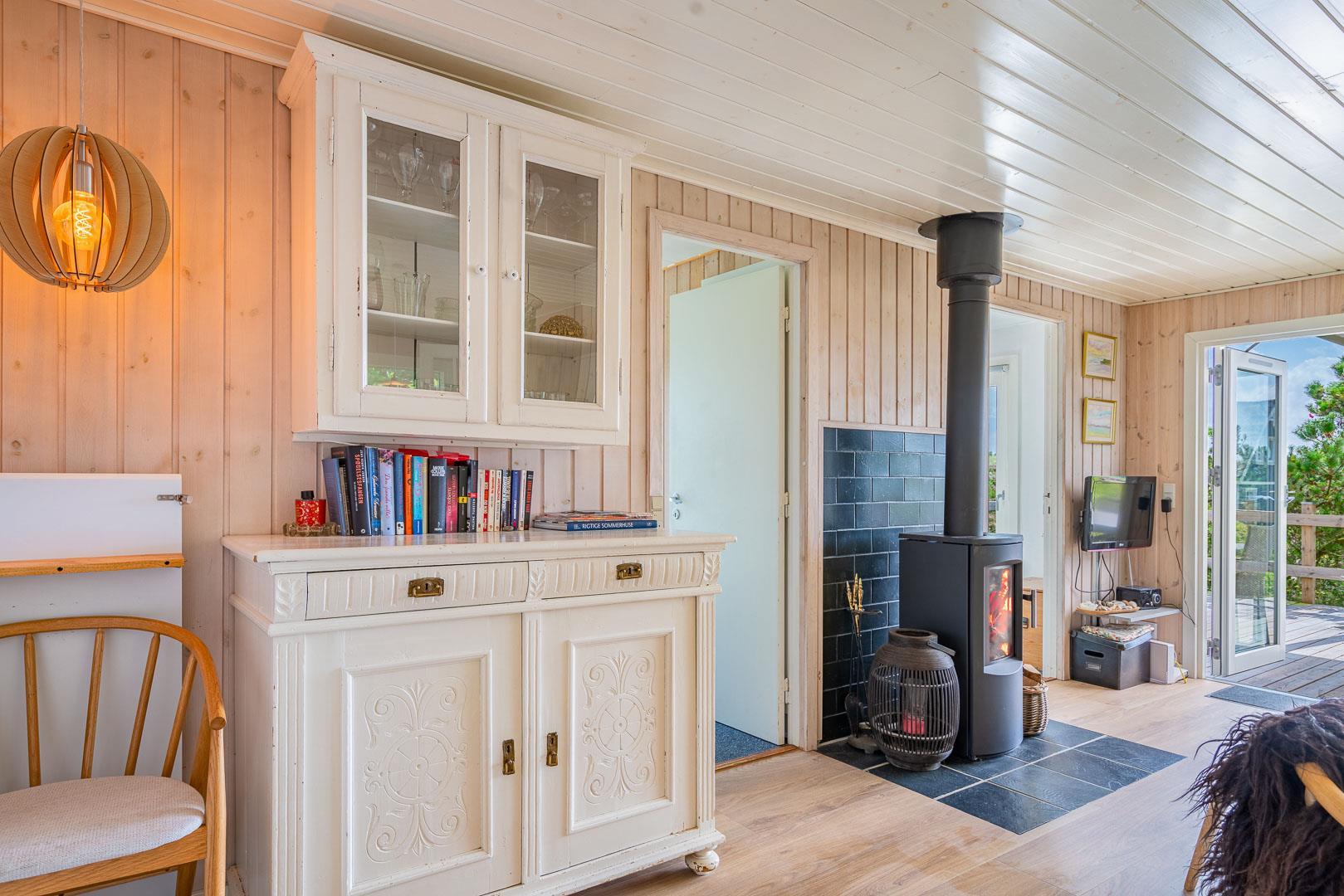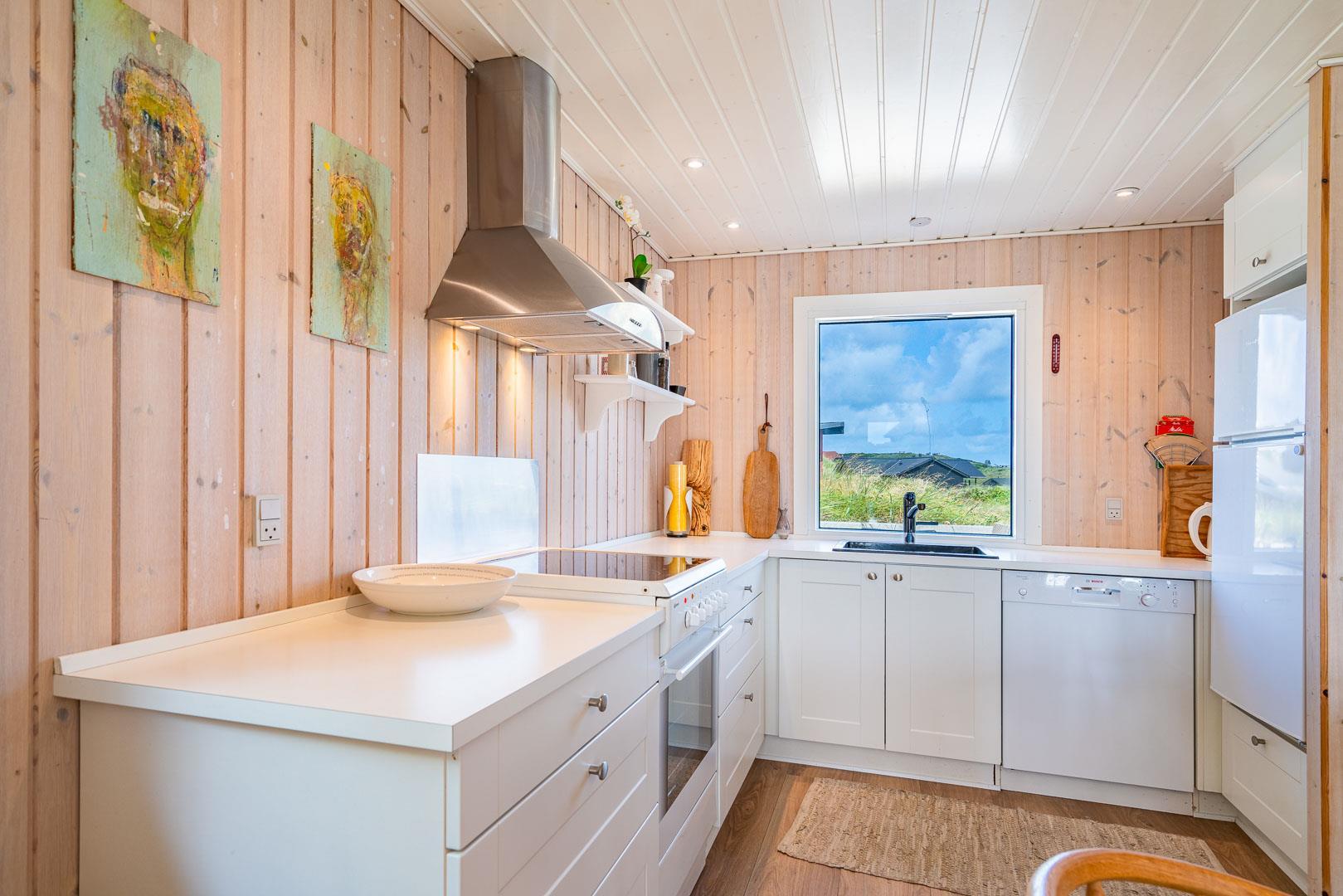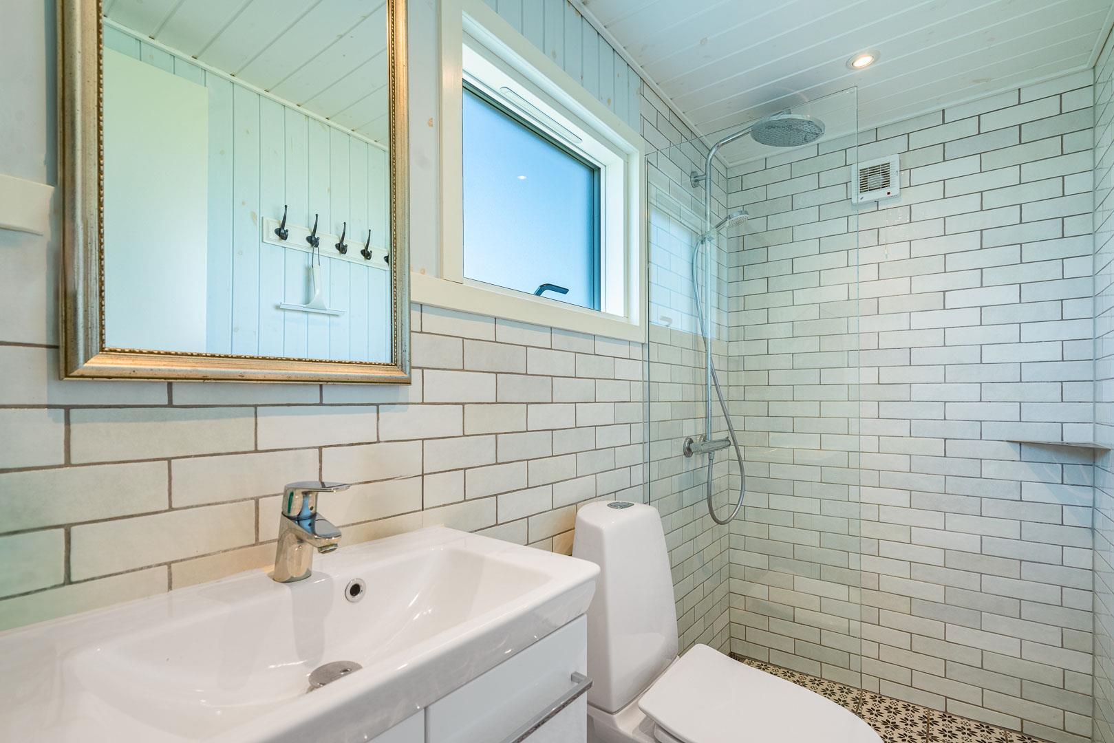 Flot badeværelse fra 2021. Husets køkken er i åben forbindelse med stuen, hvorfra der er udgang til overdækket terrasse med gode læforhold.