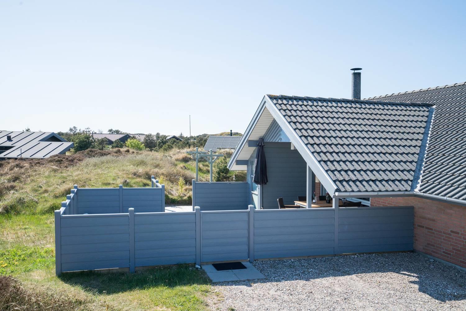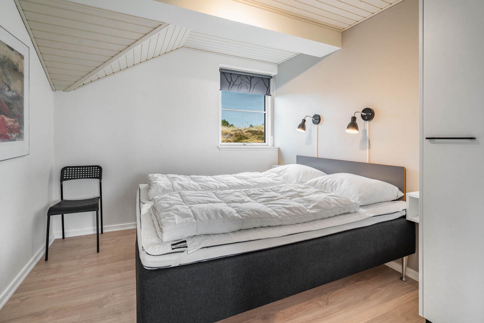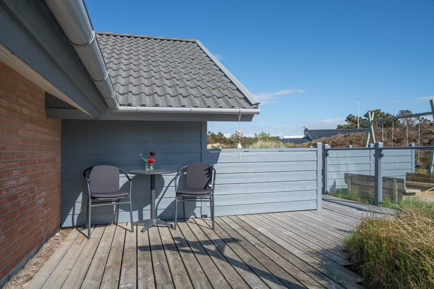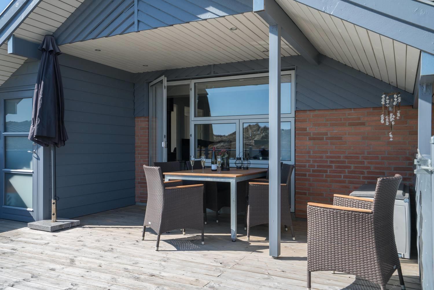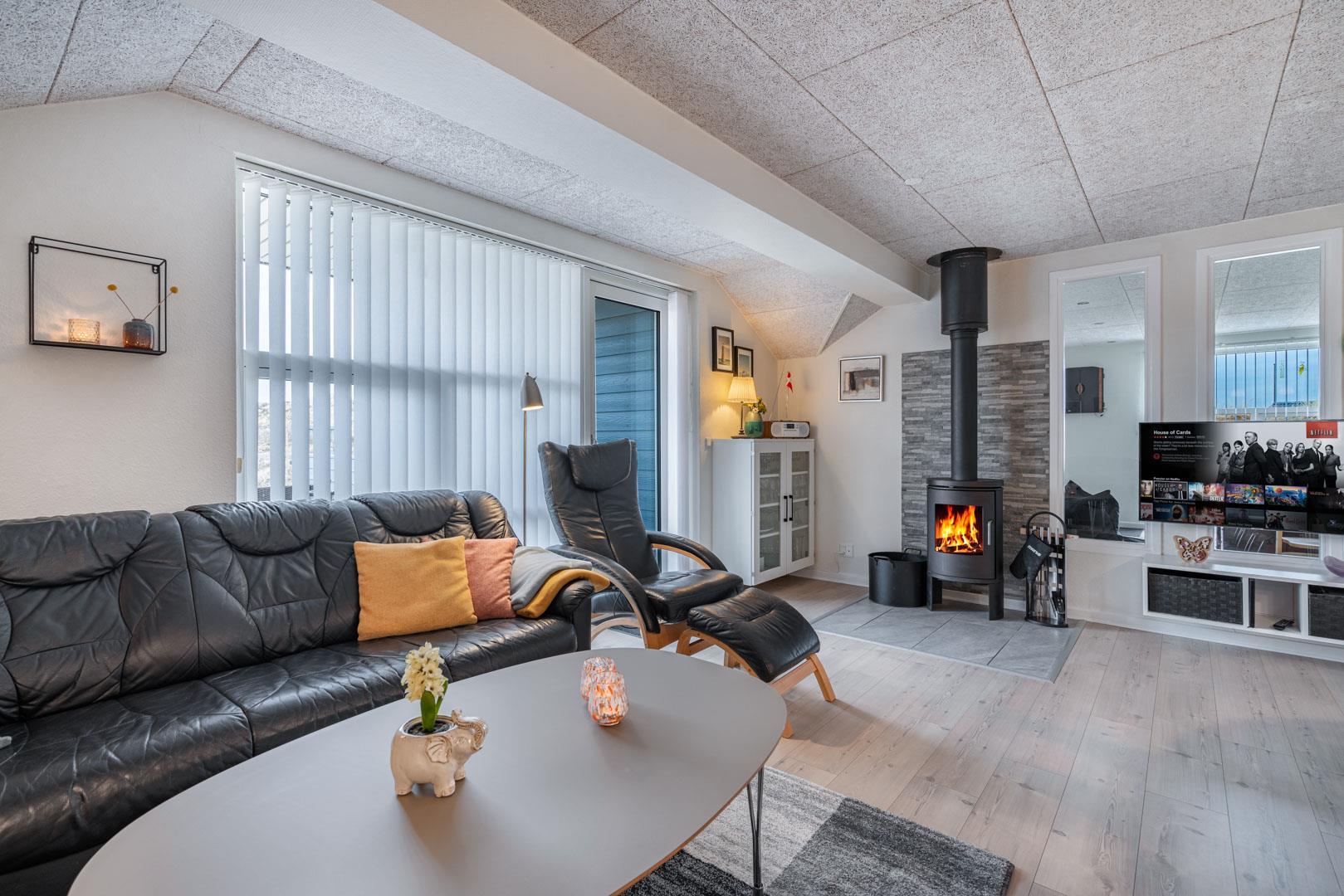 Stuen er lys og hyggeligt indrettet med komfortable møbler og store vinduespartier, der lukker dagslyset ind. Det veludstyrede køkken er integreret i opholdsrummet og giver direkte adgang til den store, ugenerede træterrasse. Her er der god plads til at slappe af, grille og nyde sommerdagene. Huset har tre soveværelser med dobbeltsenge og 1 soverum med 2 enkeltsenge. Derudover findes der et stort køle/fryseskab og separat redskabsrum til brænde og andre ting.
