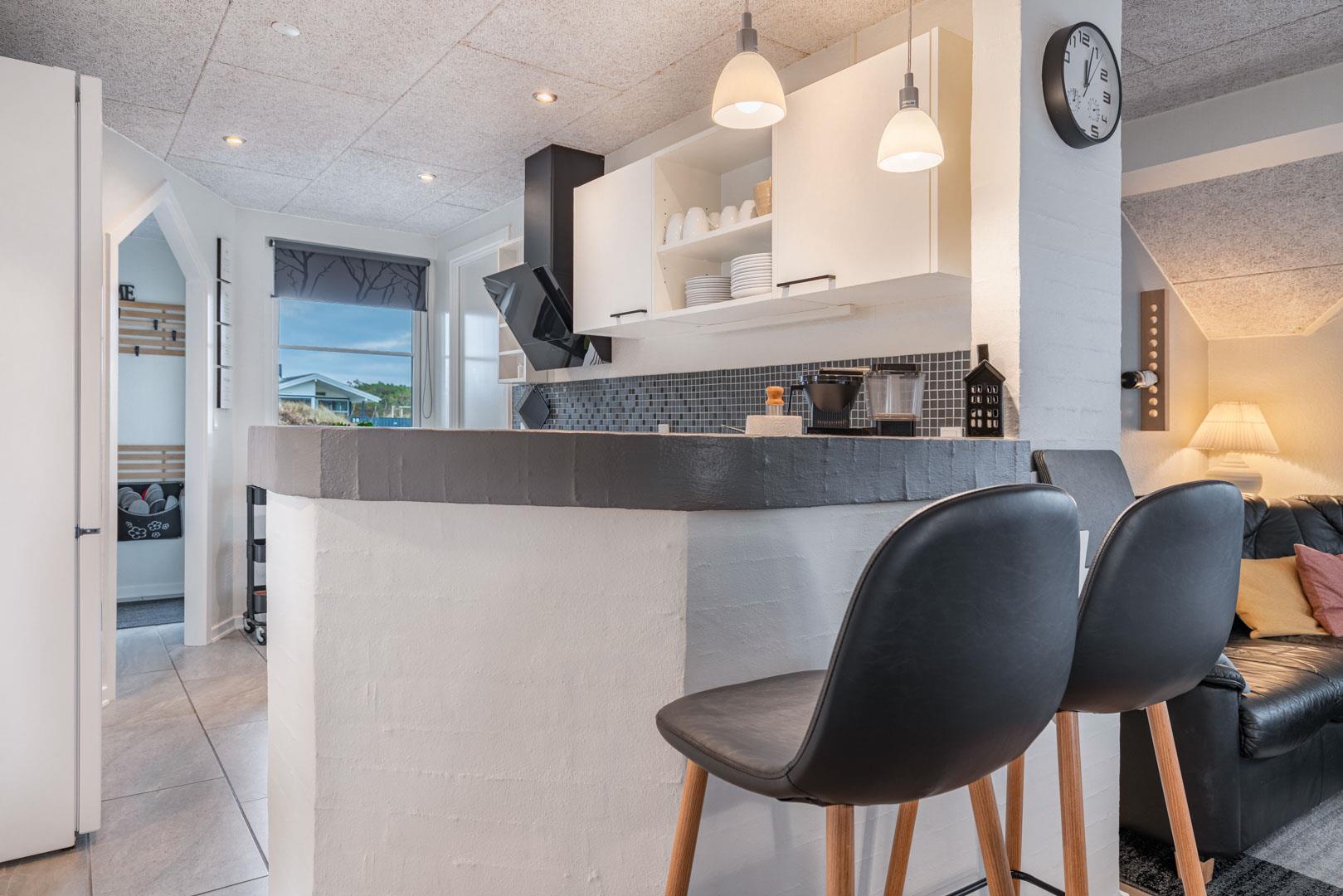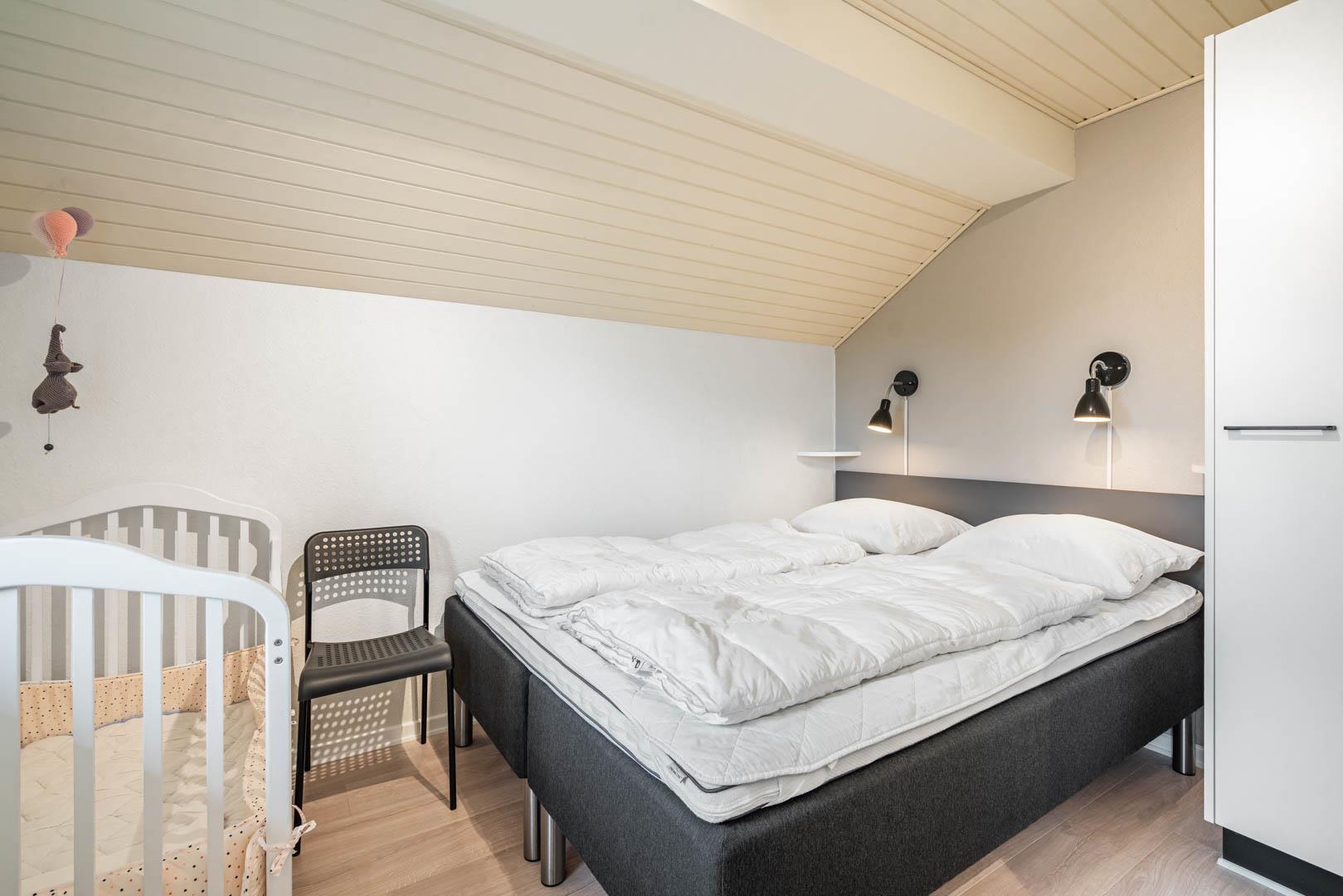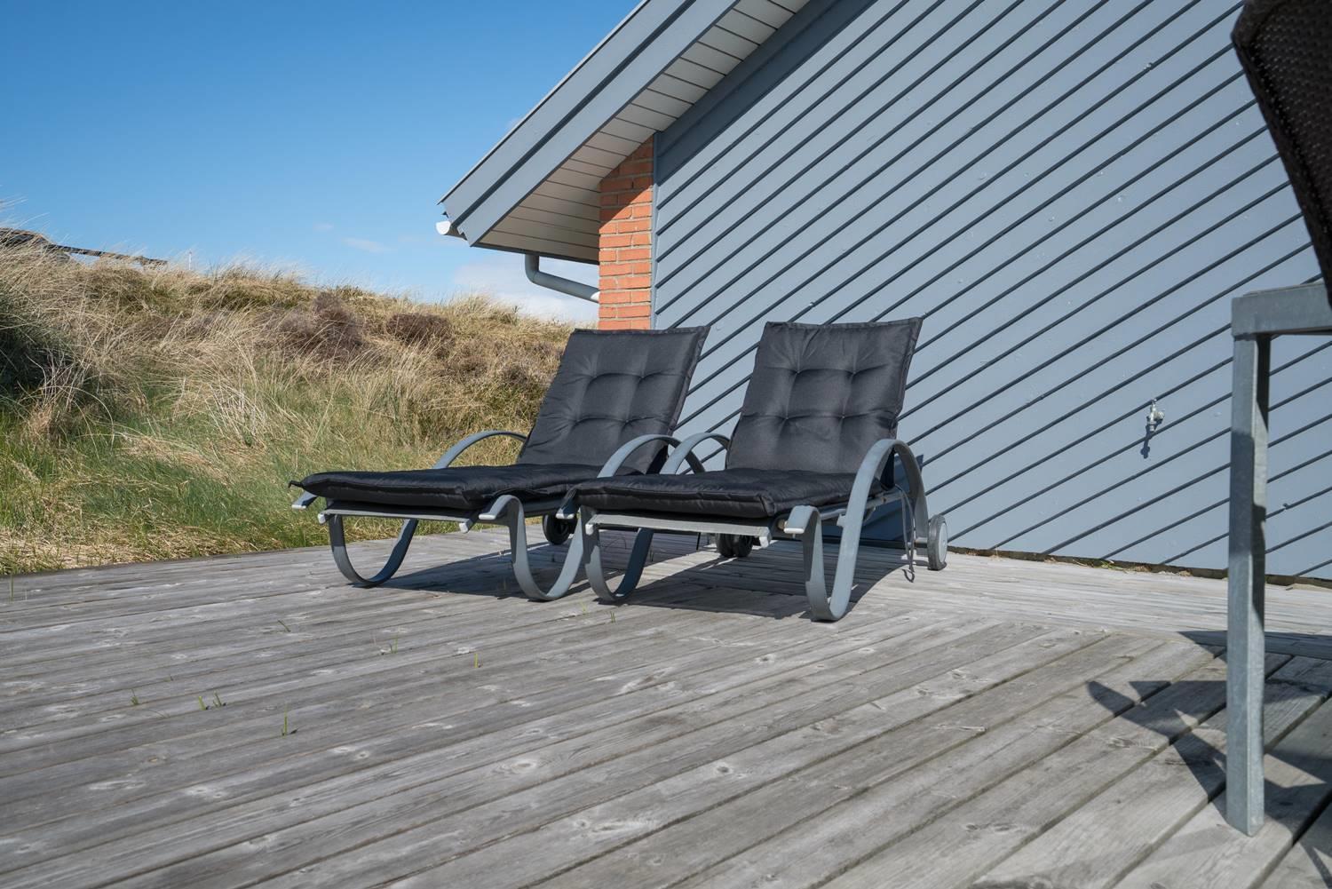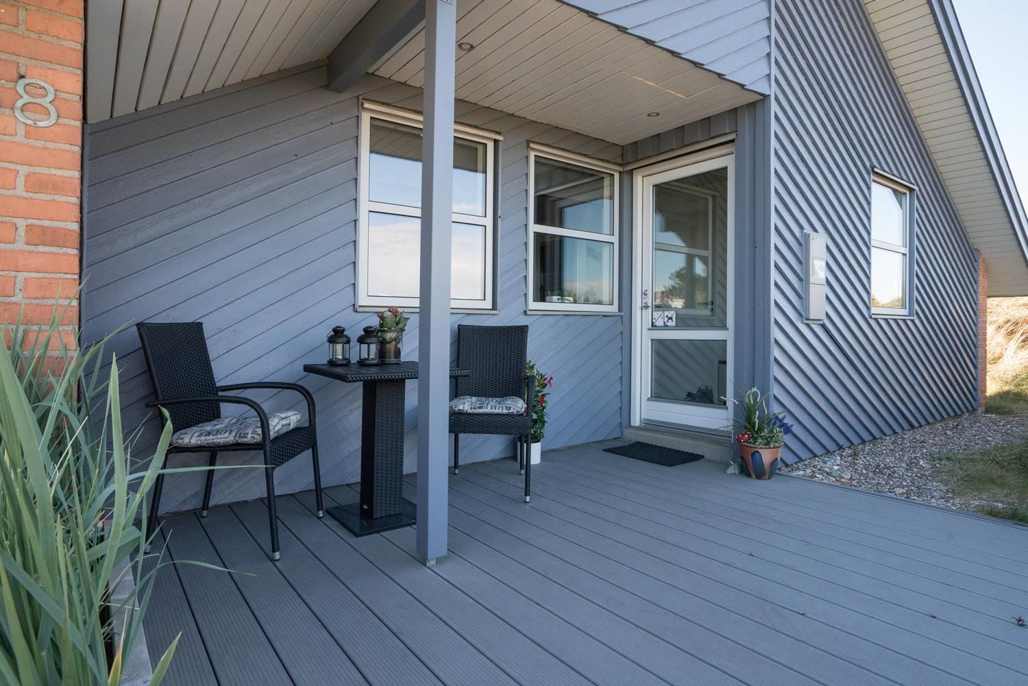 Stuen er lys og hyggeligt indrettet med komfortable møbler og store vinduespartier, der lukker dagslyset ind. Det veludstyrede køkken er integreret i opholdsrummet og giver direkte adgang til den store, ugenerede træterrasse. Her er der god plads til at slappe af, grille og nyde sommerdagene. Huset har tre soveværelser med dobbeltsenge og 1 soverum med 2 enkeltsenge. Derudover findes der et stort køle/fryseskab og separat redskabsrum til brænde og andre ting.