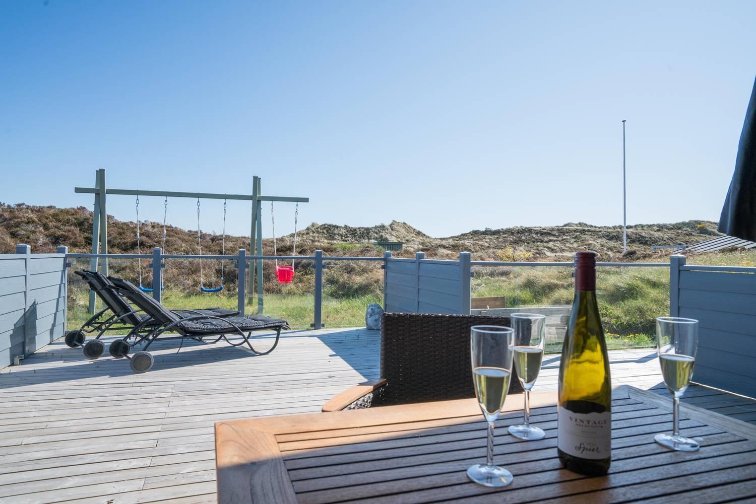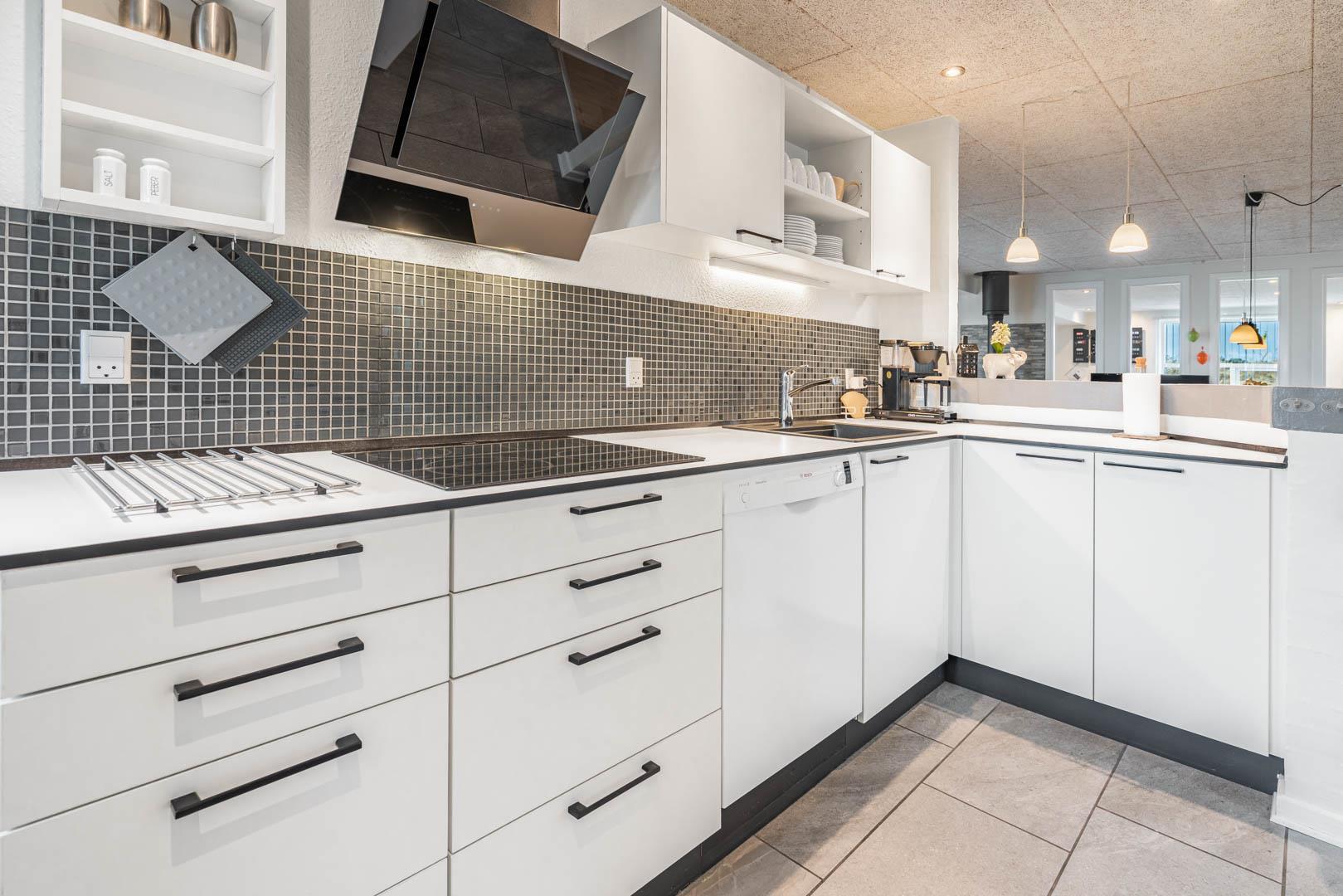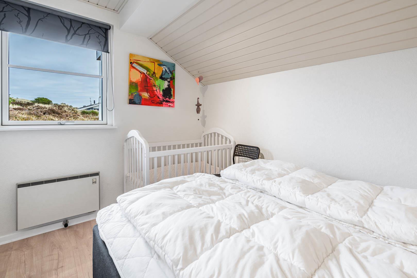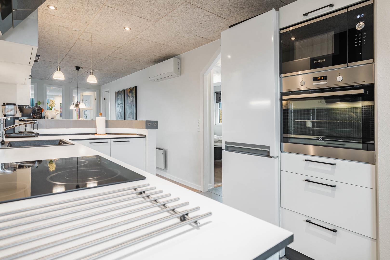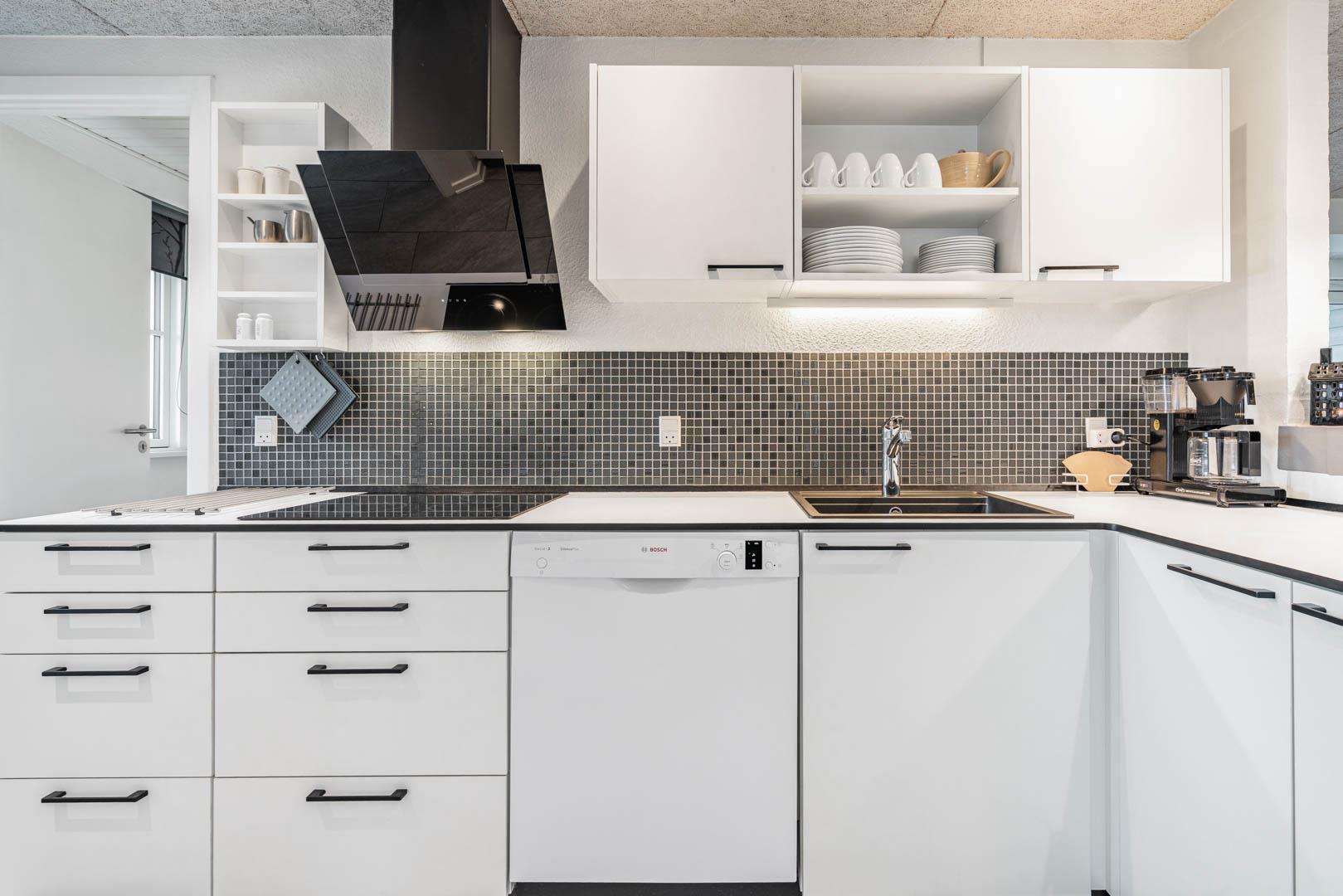 Stuen er lys og hyggeligt indrettet med komfortable møbler og store vinduespartier, der lukker dagslyset ind. Det veludstyrede køkken er integreret i opholdsrummet og giver direkte adgang til den store, ugenerede træterrasse. Her er der god plads til at slappe af, grille og nyde sommerdagene. Huset har tre soveværelser med dobbeltsenge og 1 soverum med 2 enkeltsenge. Derudover findes der et stort køle/fryseskab og separat redskabsrum til brænde og andre ting.