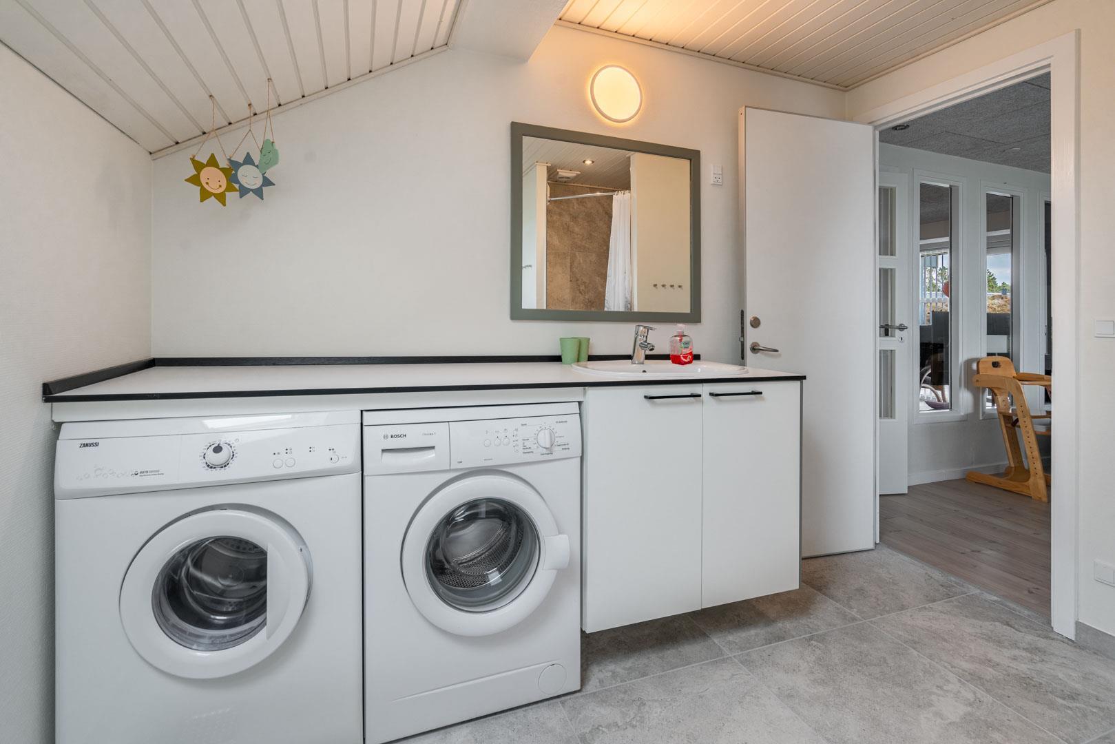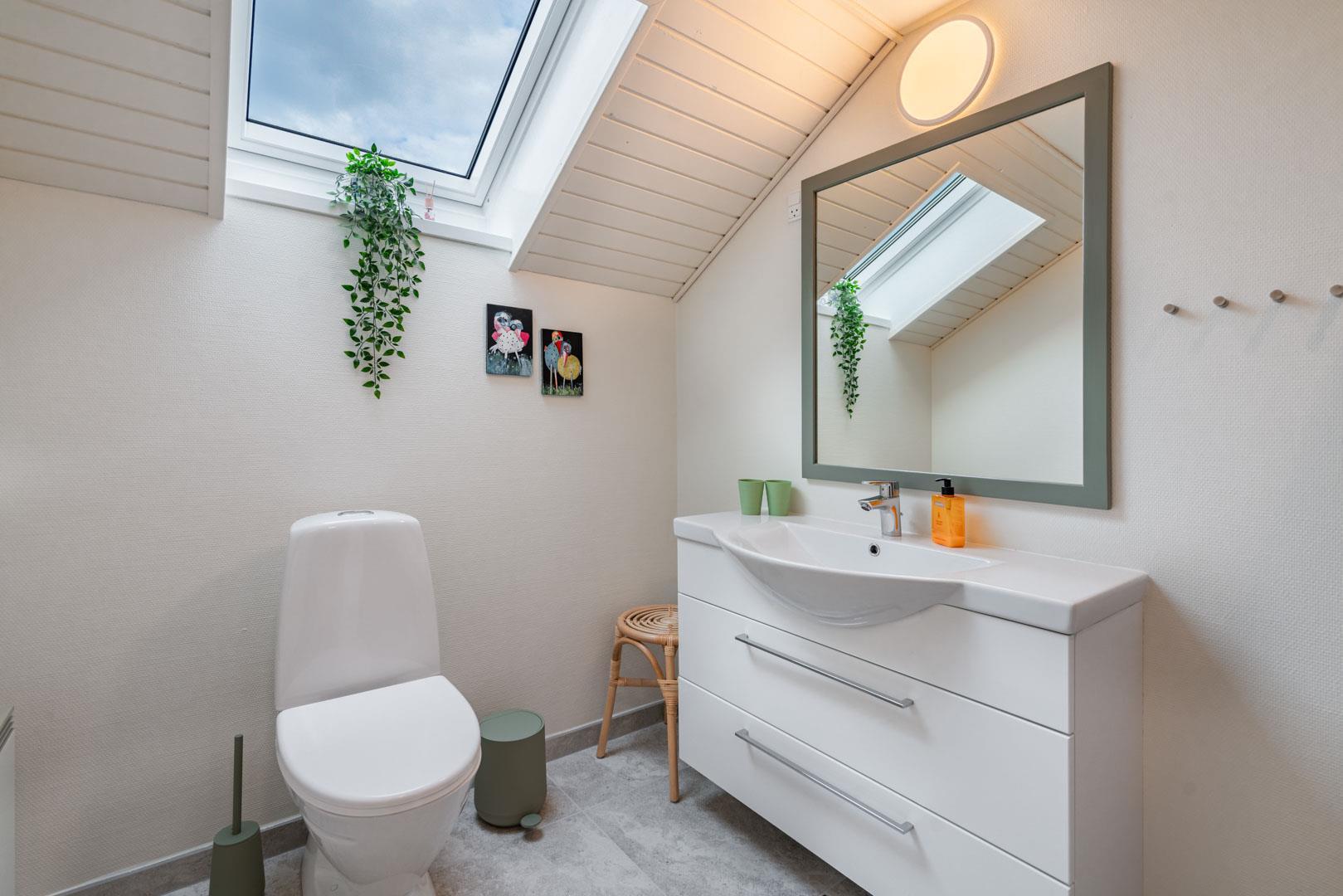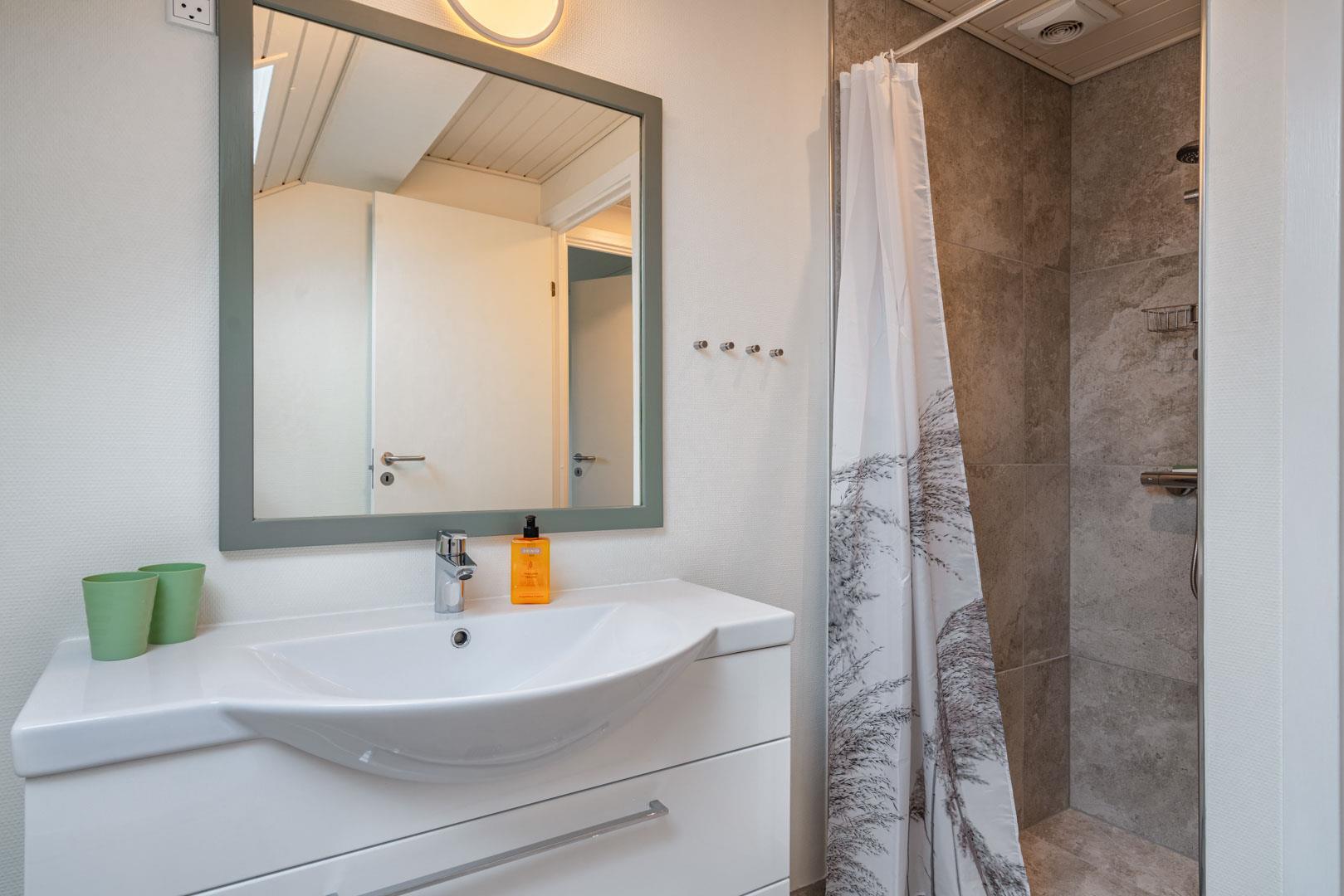 Et af husets højdepunkter er det rummelige aktivitetsrum, som er udstyret med billardbord, dart og bordfodbold. I direkte forbindelse findes et moderne badeværelse med sauna – ideelt til afslapning efter en aktiv dag. I den modsatte ende af huset er der et ekstra badeværelse med bruser – praktisk til familier eller mindre grupper.