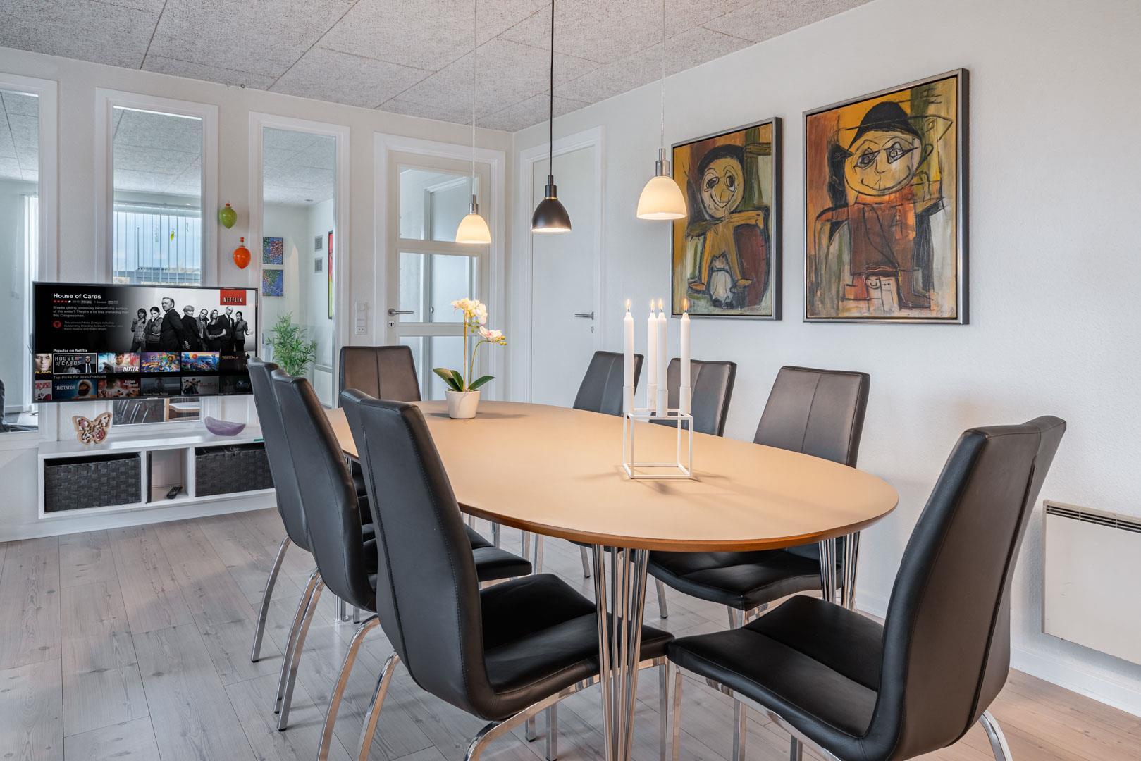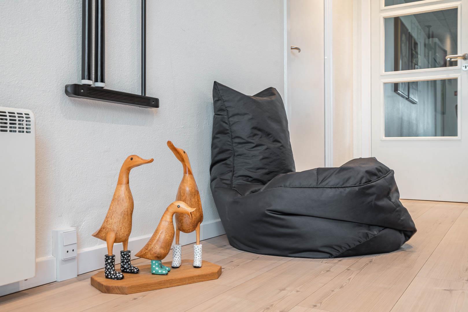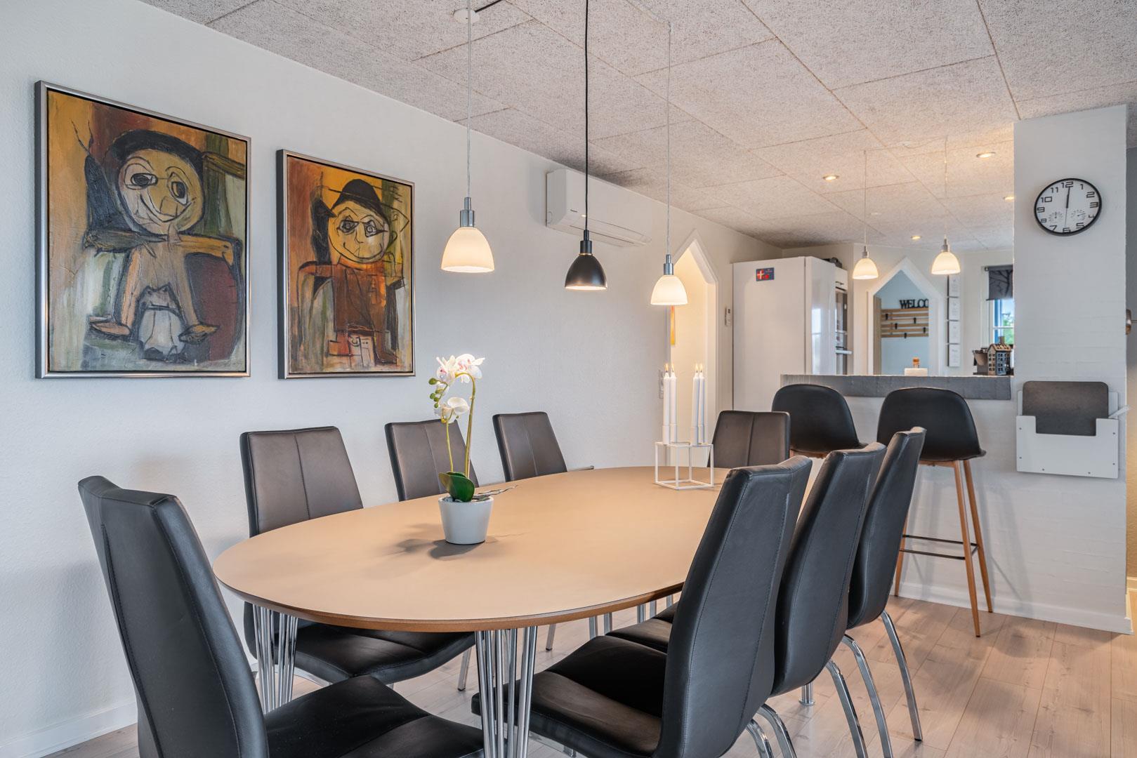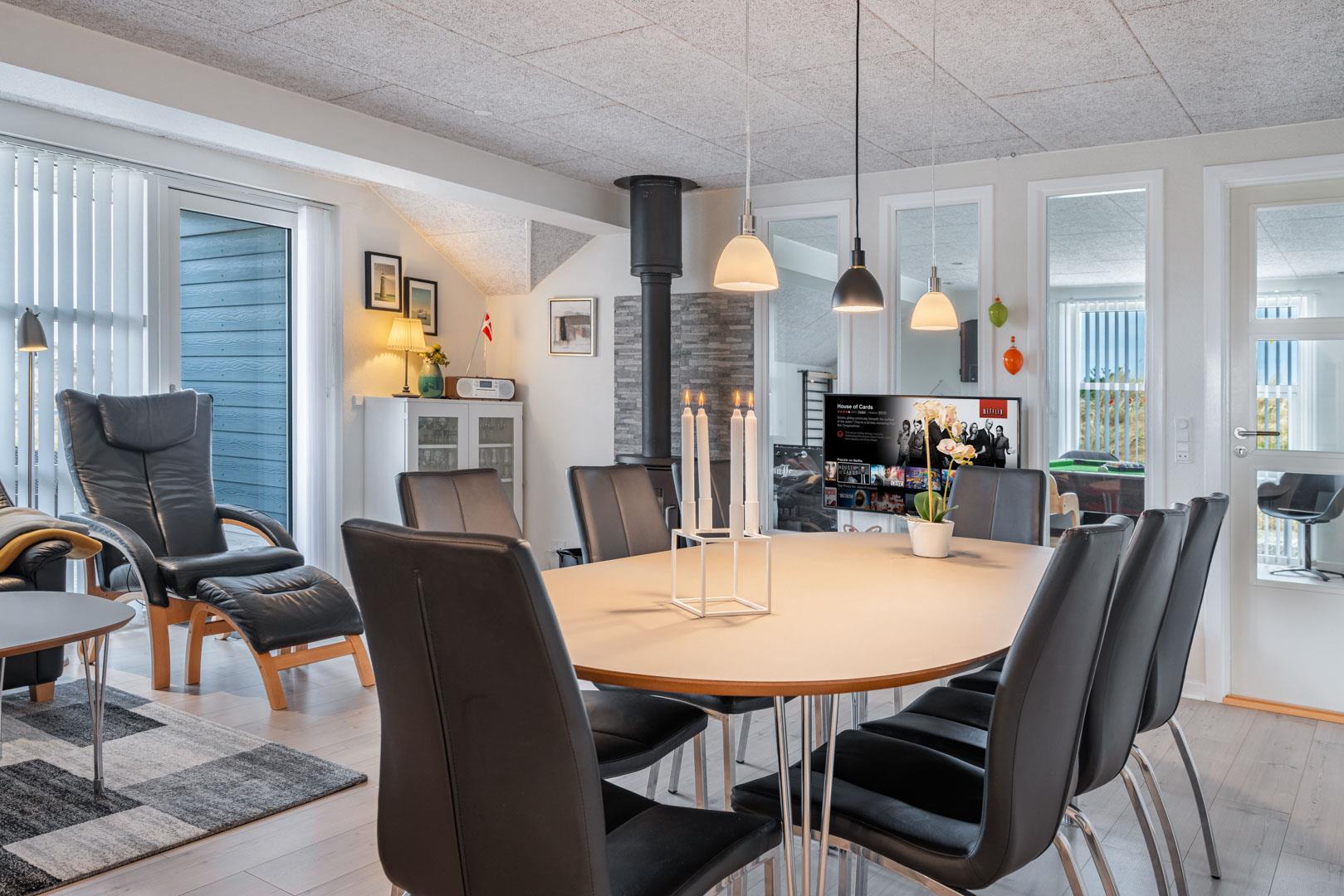 Et af husets højdepunkter er det rummelige aktivitetsrum, som er udstyret med billardbord, dart og bordfodbold. I direkte forbindelse findes et moderne badeværelse med sauna – ideelt til afslapning efter en aktiv dag. I den modsatte ende af huset er der et ekstra badeværelse med bruser – praktisk til familier eller mindre grupper.