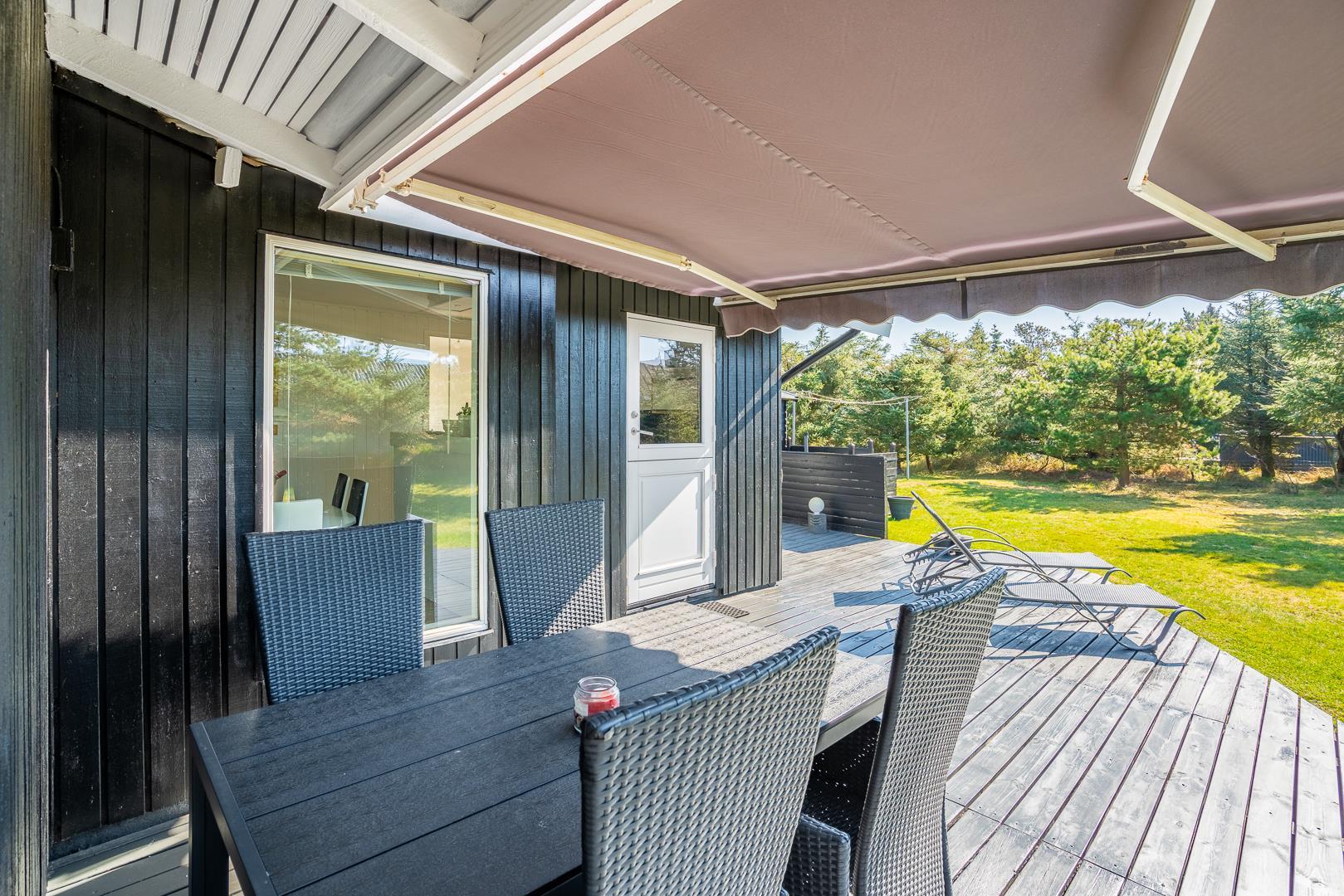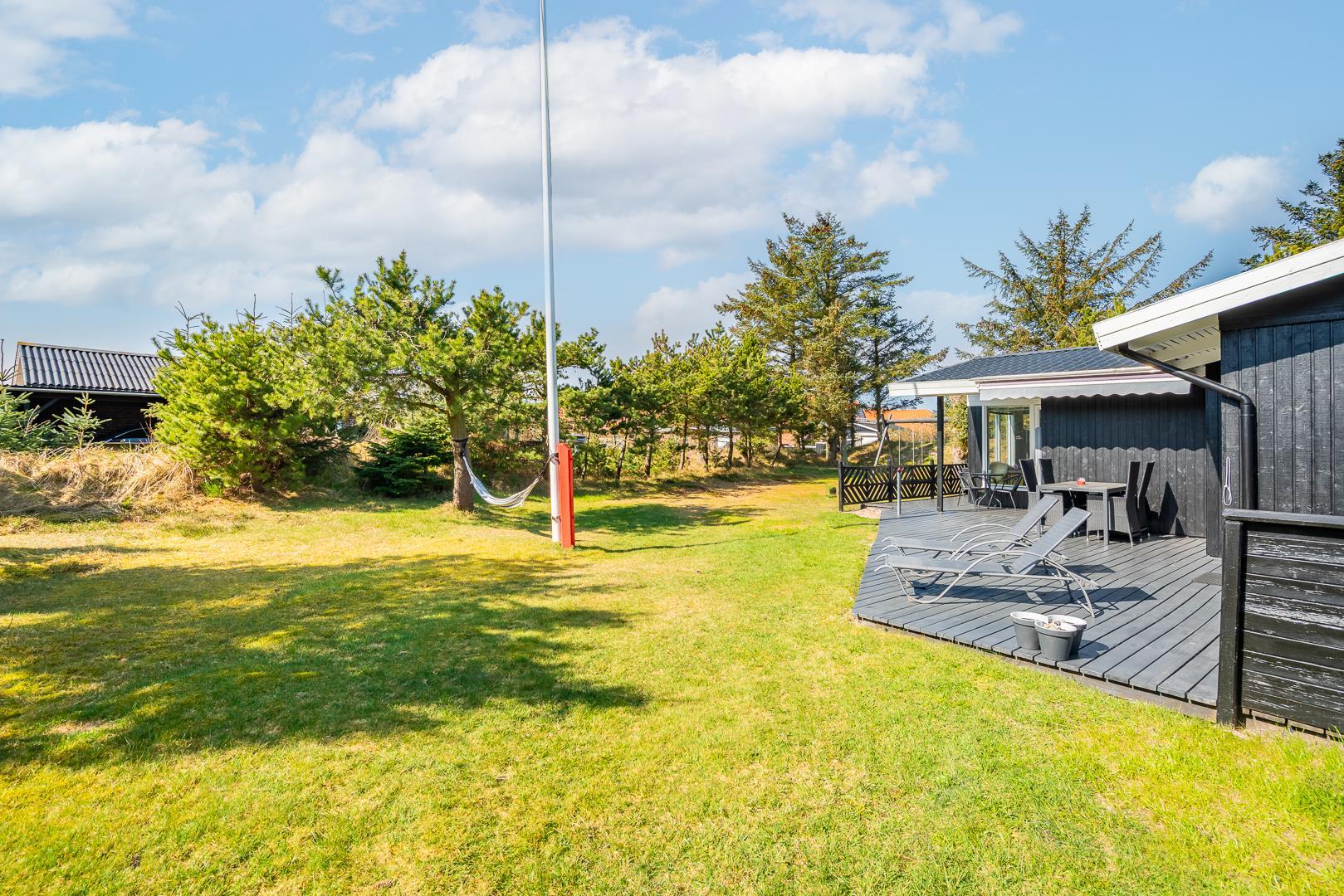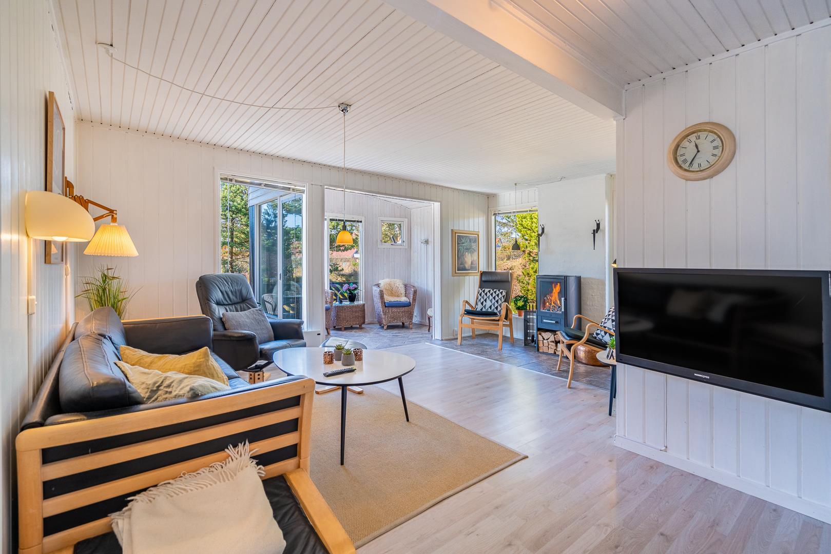 Sommerhuset ligger på en ugeneret, børnevenlig naturgrund omgivet af træer og buske – ideelt til en afslappende ferie i rolige omgivelser. Her kan du nyde solen på flere gode terrasser eller slappe af i den hyggelige udestue med en kop kaffe eller et glas vin.