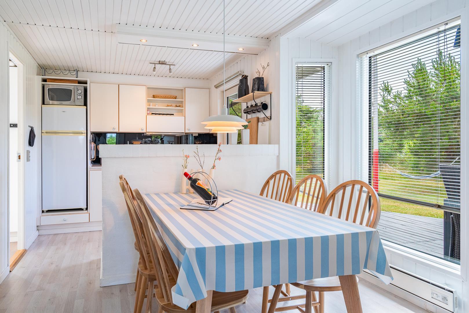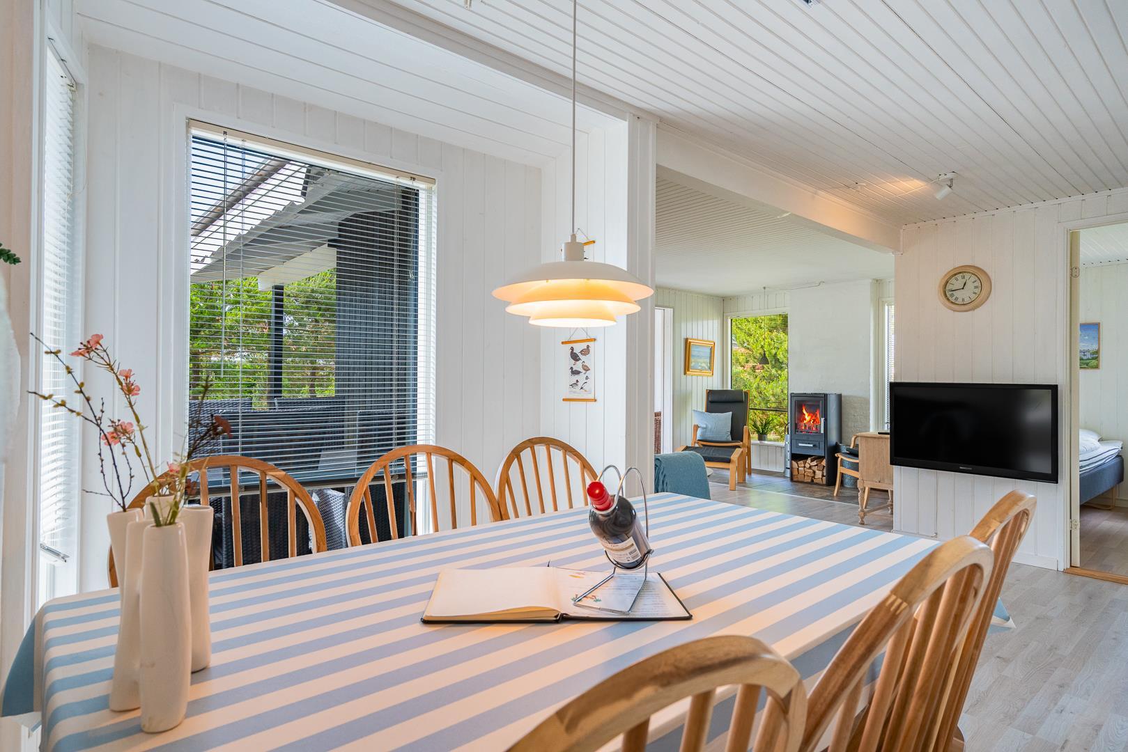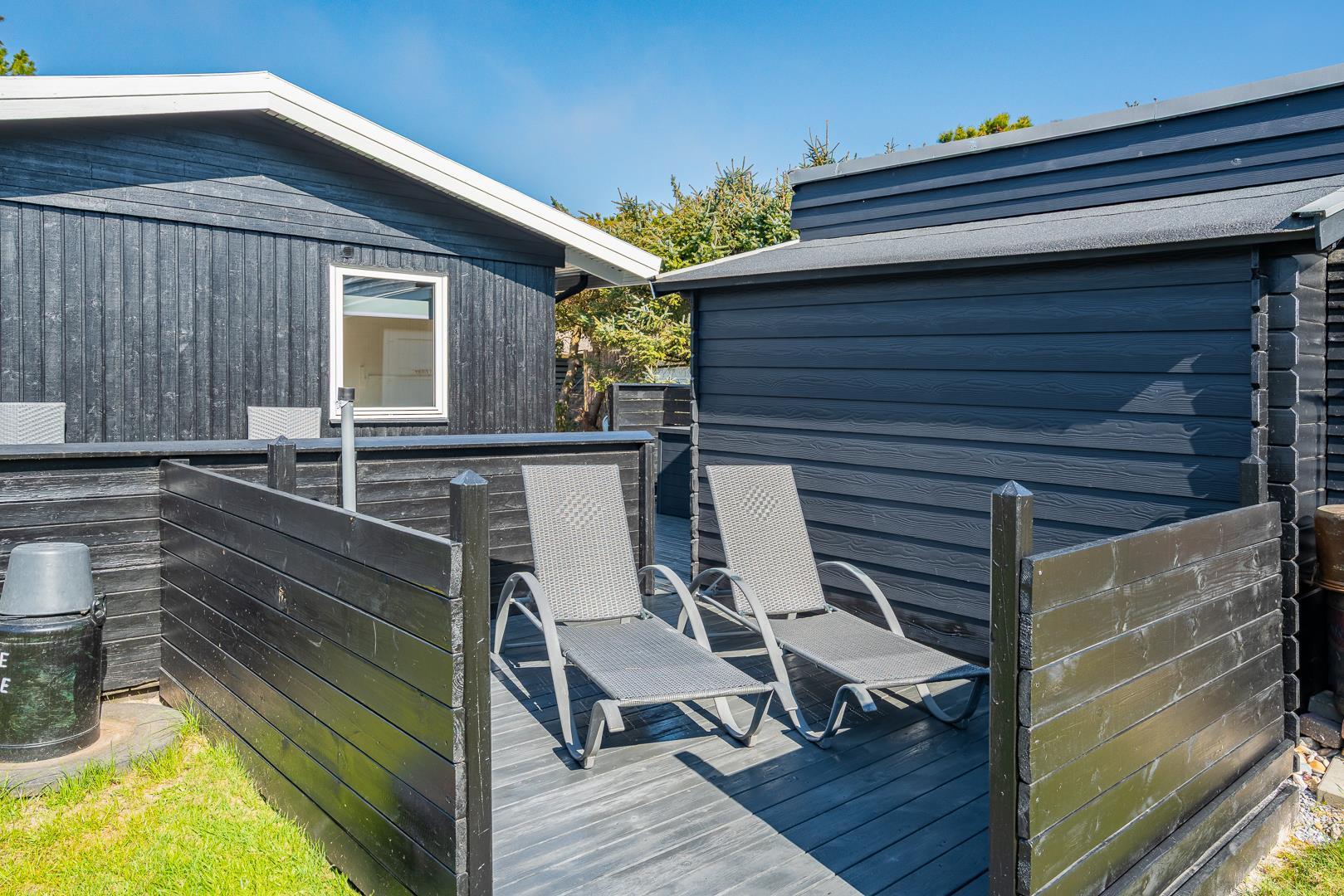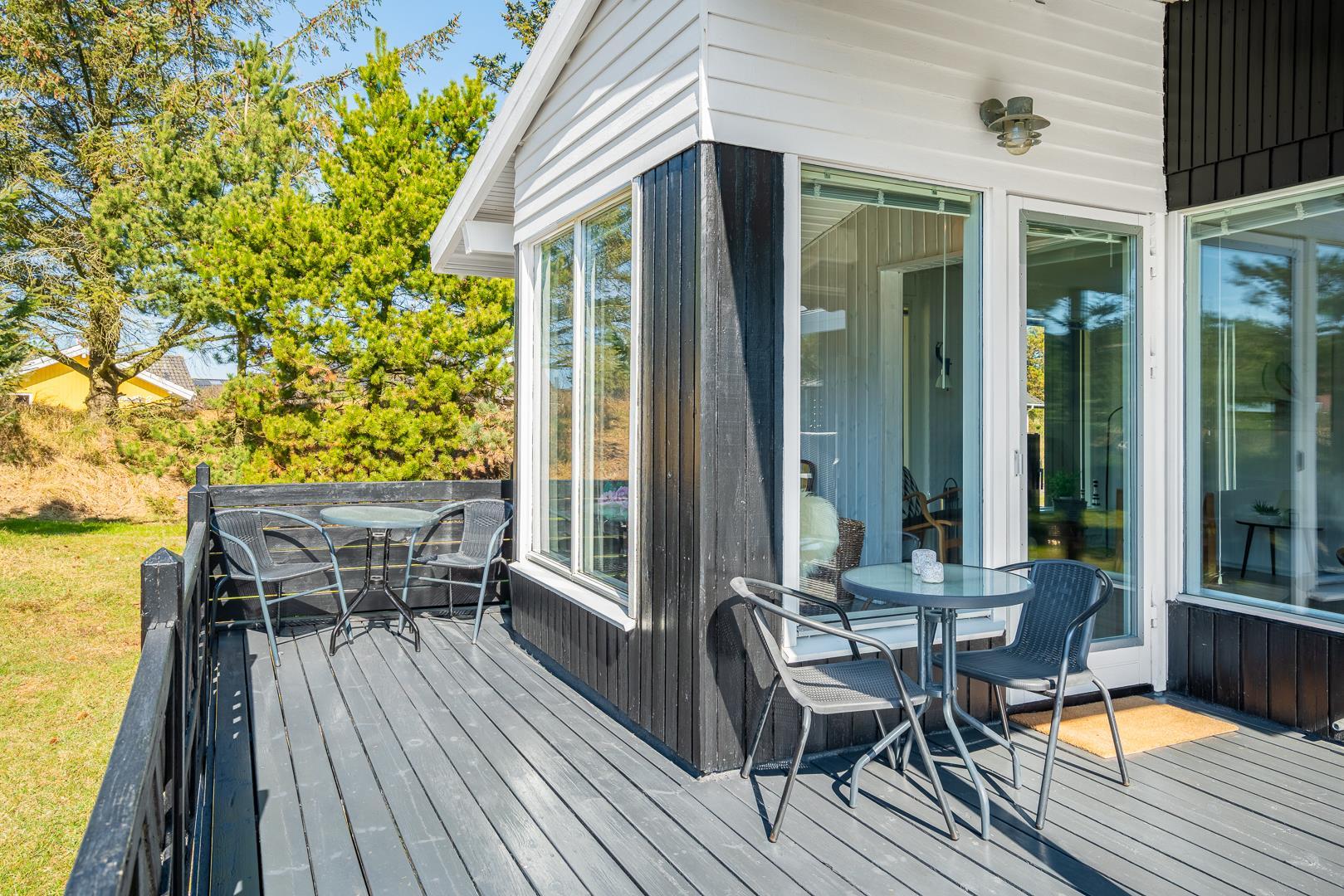 Sommerhuset ligger på en ugeneret, børnevenlig naturgrund omgivet af træer og buske – ideelt til en afslappende ferie i rolige omgivelser. Her kan du nyde solen på flere gode terrasser eller slappe af i den hyggelige udestue med en kop kaffe eller et glas vin.