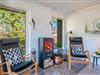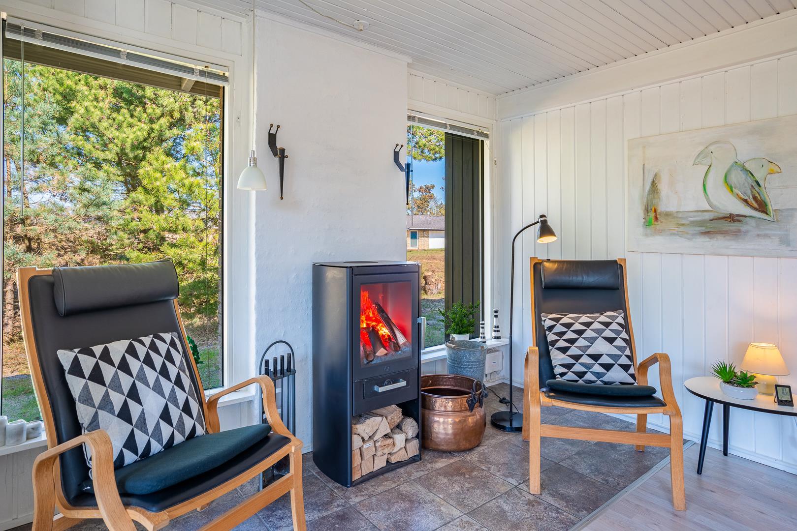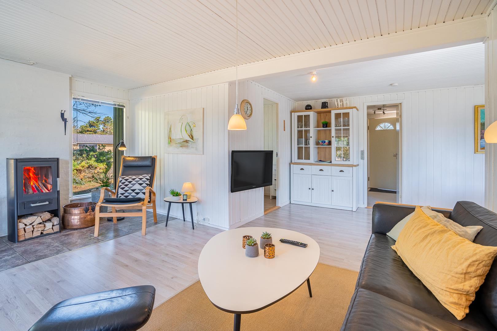 Indenfor mødes du af en lys og venlig atmosfære. Den hyggelige stue med brændeovn skaber den perfekte ramme for afslapning – uanset om du vil fordybe dig i en god bog eller nyde varmen fra flammerne på en kølig aften.
