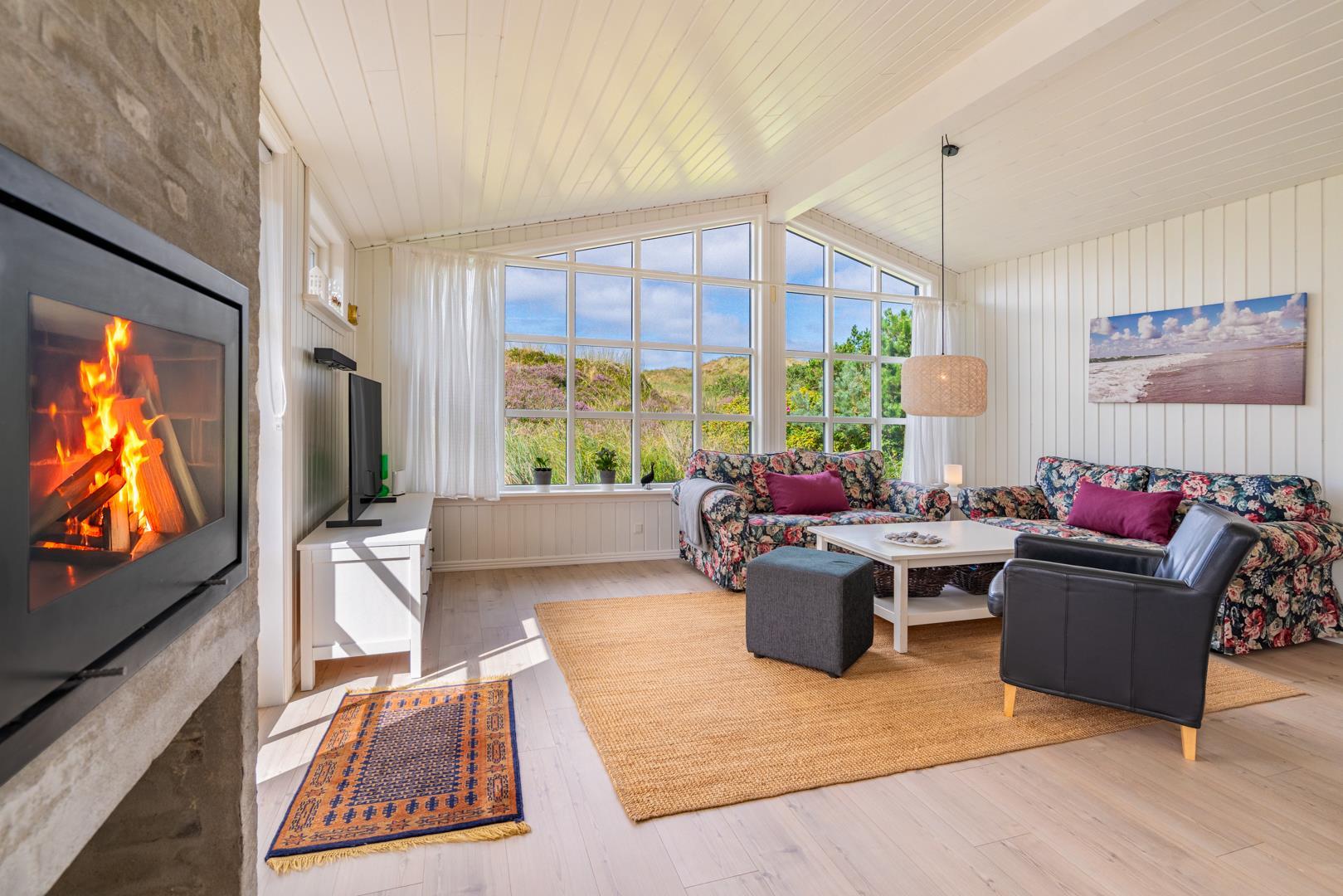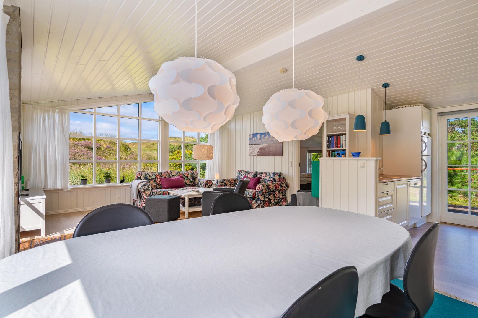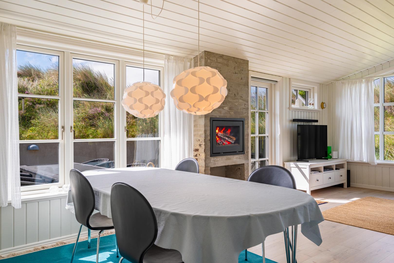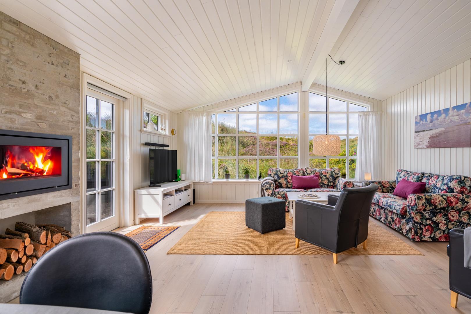 Indretningen er lys, venlig og indbydende med smagfulde materialer, træ- og klinkegulve samt moderne bekvemmeligheder. Det veludstyrede køkken ligger i åben forbindelse med stuen, som har loft til kip, brændeovn og store vinduer med udsigt over det fredede klitlandskab.