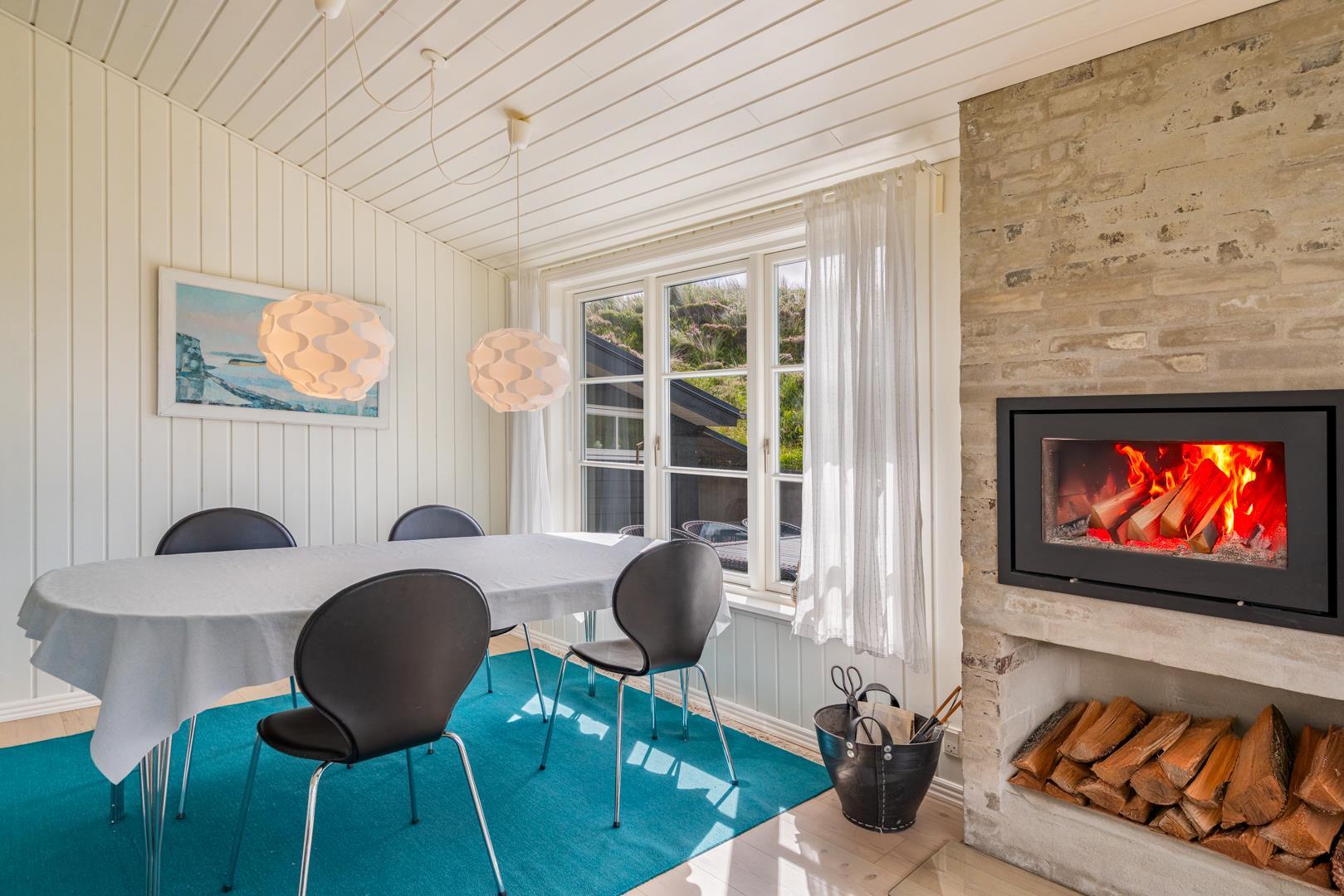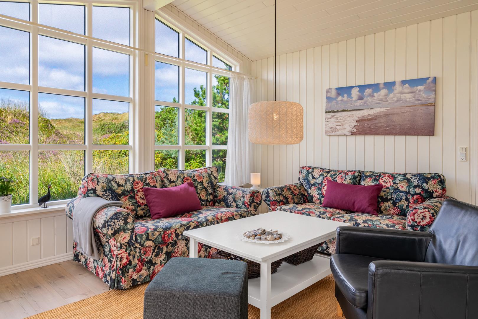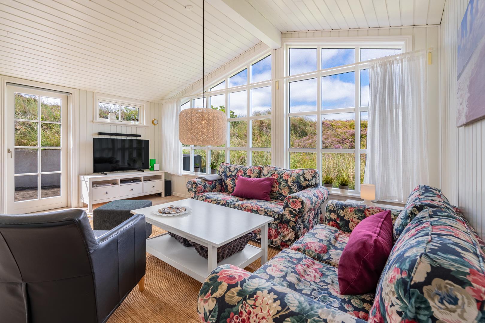 Indretningen er lys, venlig og indbydende med smagfulde materialer, træ- og klinkegulve samt moderne bekvemmeligheder. Det veludstyrede køkken ligger i åben forbindelse med stuen, som har loft til kip, brændeovn og store vinduer med udsigt over det fredede klitlandskab.