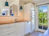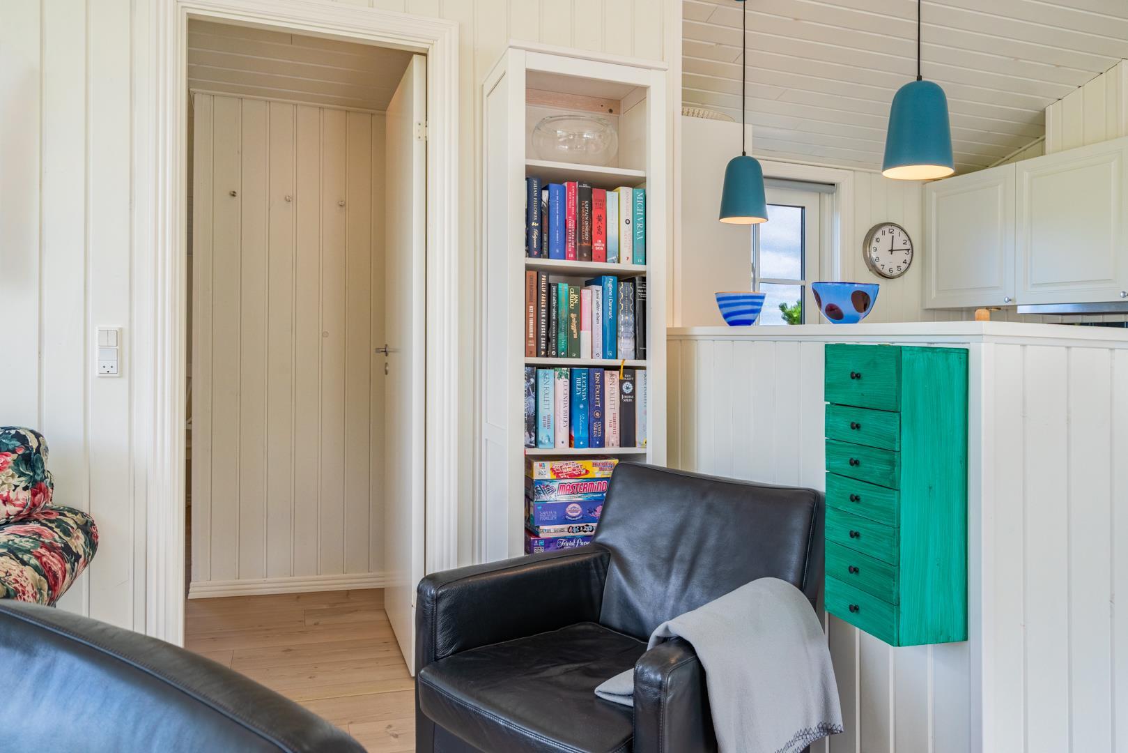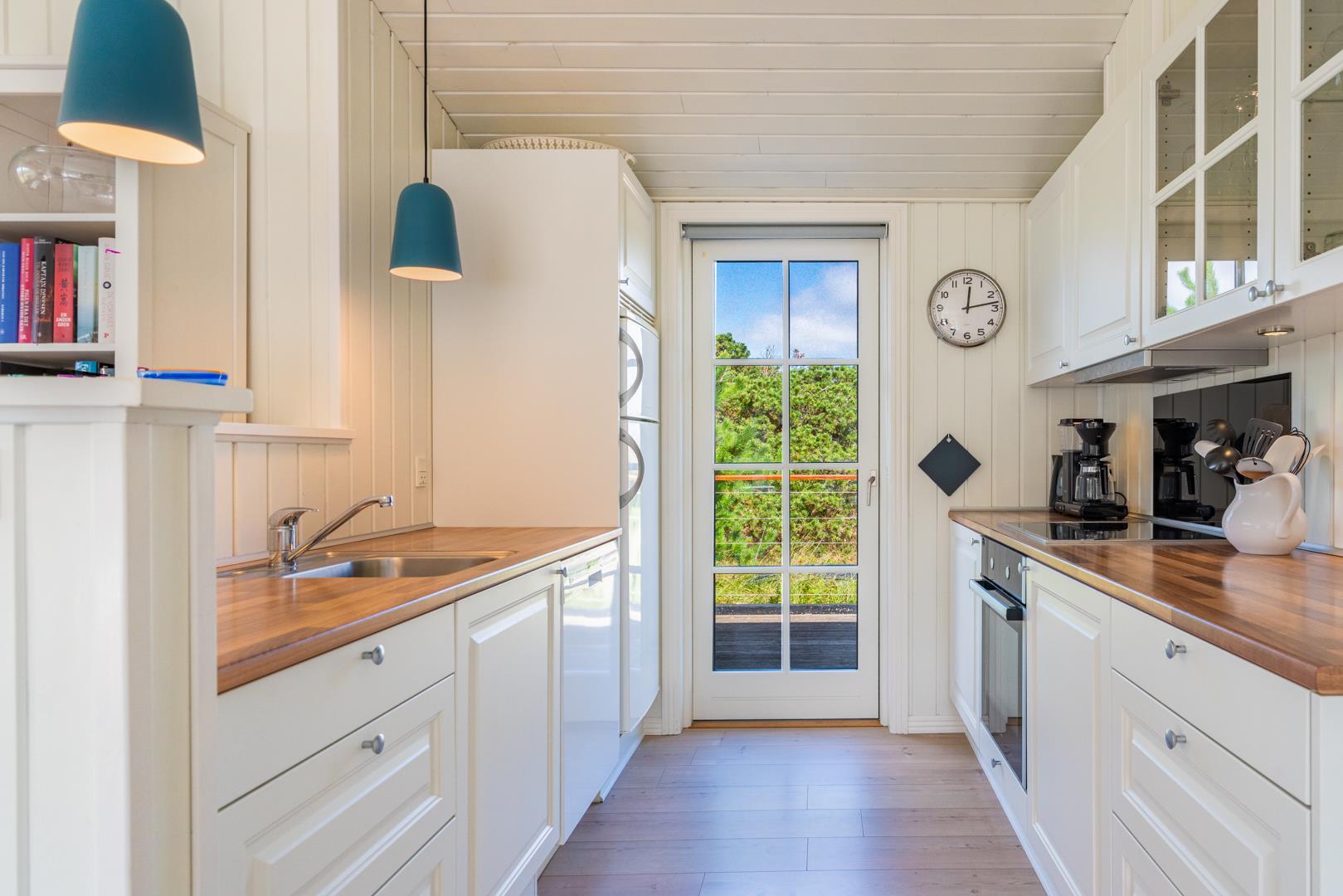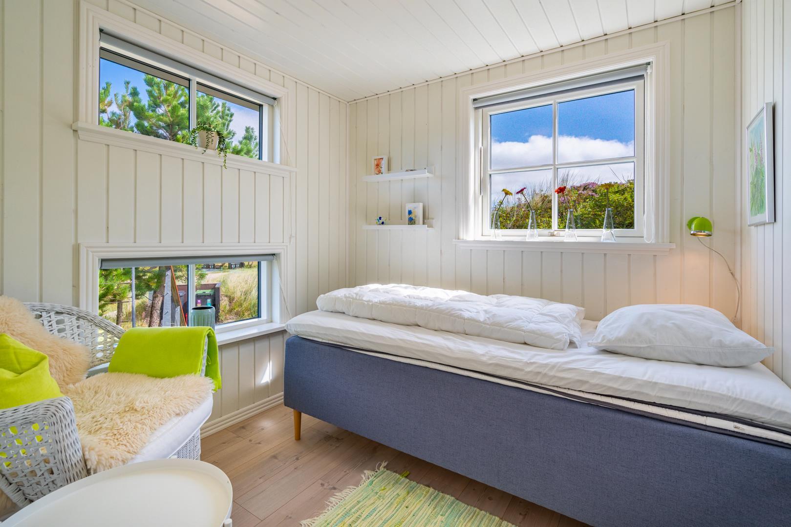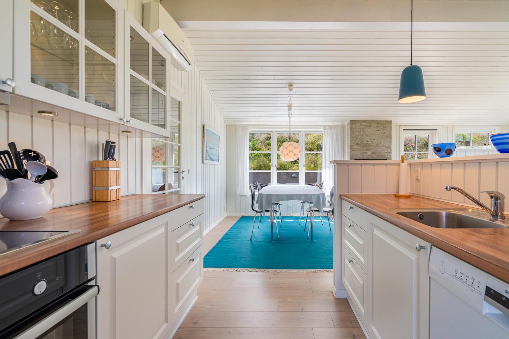 Indretningen er lys, venlig og indbydende med smagfulde materialer, træ- og klinkegulve samt moderne bekvemmeligheder. Det veludstyrede køkken ligger i åben forbindelse med stuen, som har loft til kip, brændeovn og store vinduer med udsigt over det fredede klitlandskab.