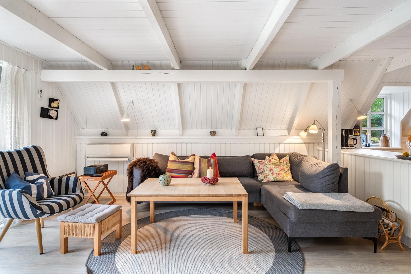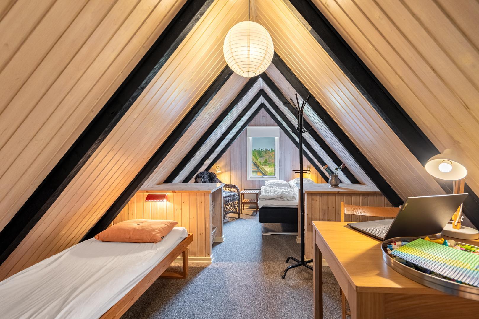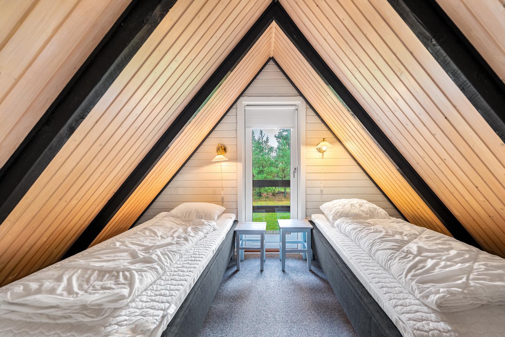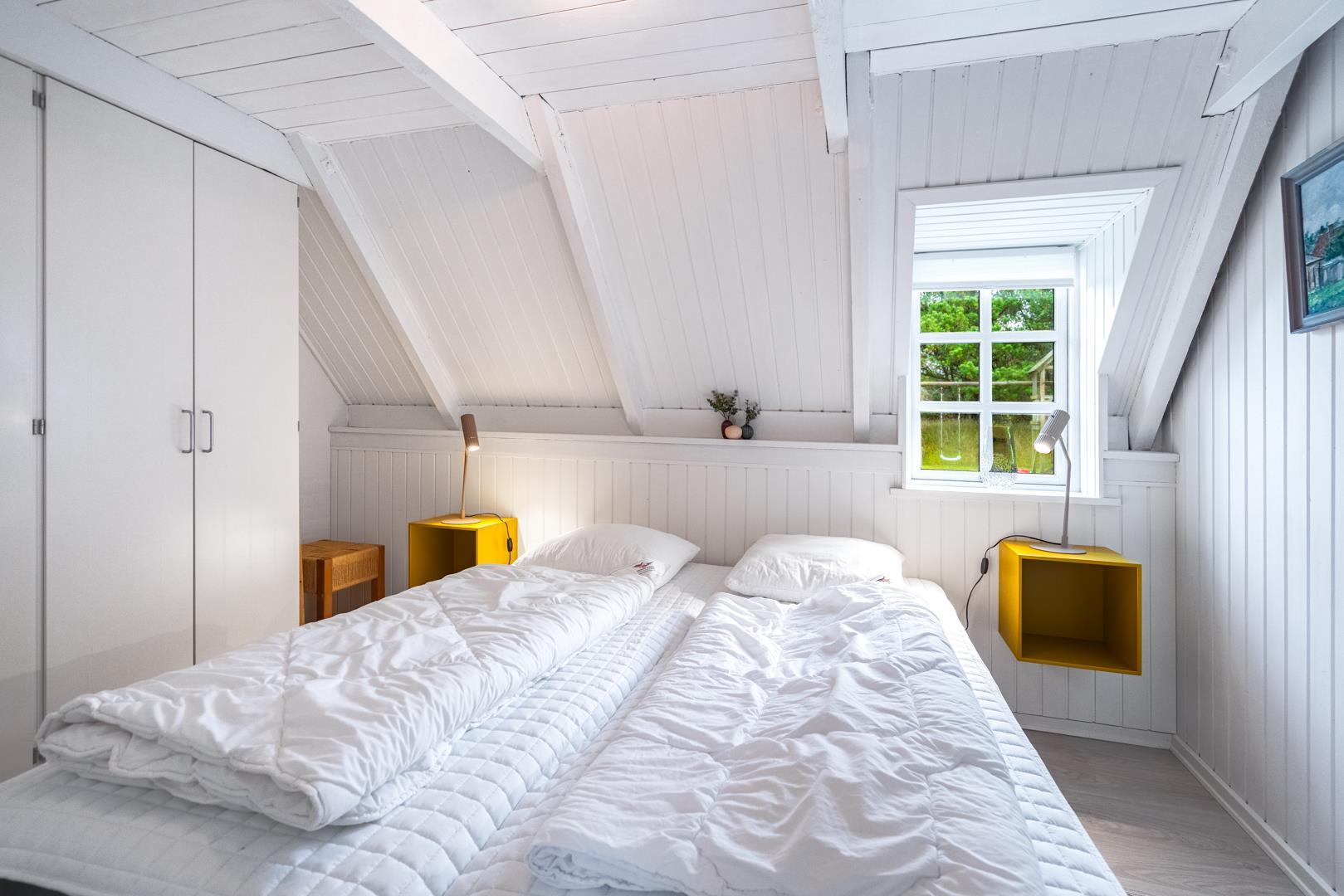 Sommerhuset har tre gode soveværelser: Ét i stueplan med dobbeltseng og to værelser på 1. sal – ét med dobbeltseng og ét med to enkeltsenge. Der er god plads til både familier og vennepar.