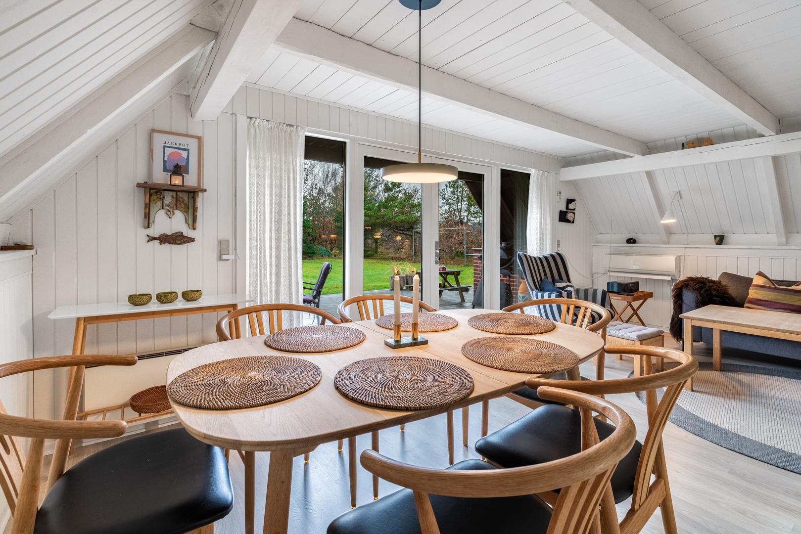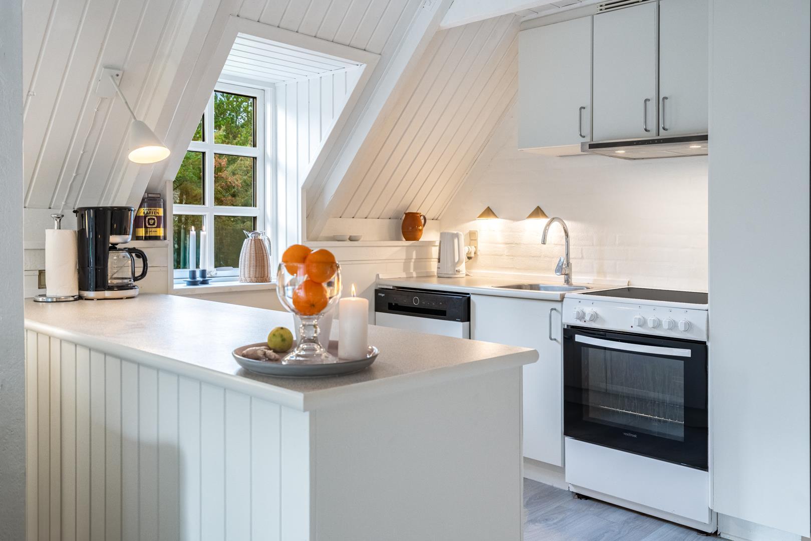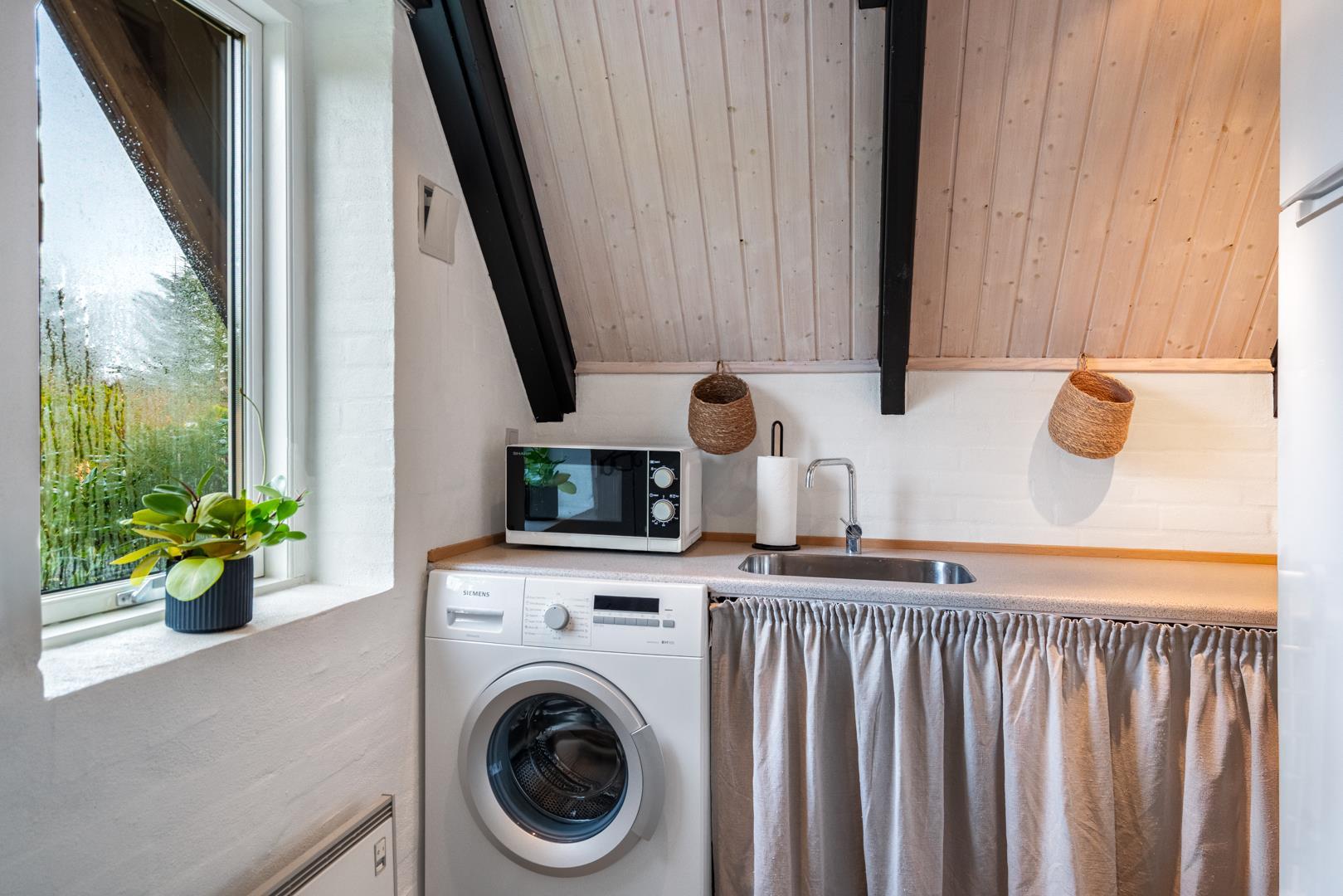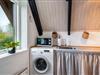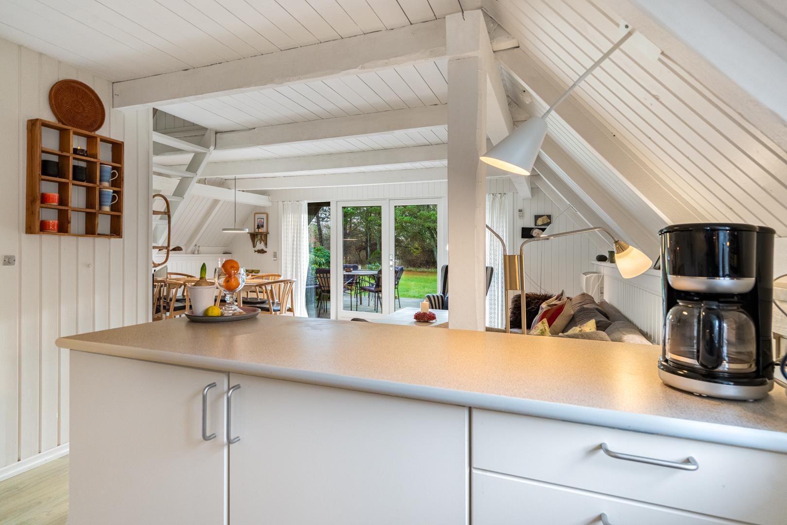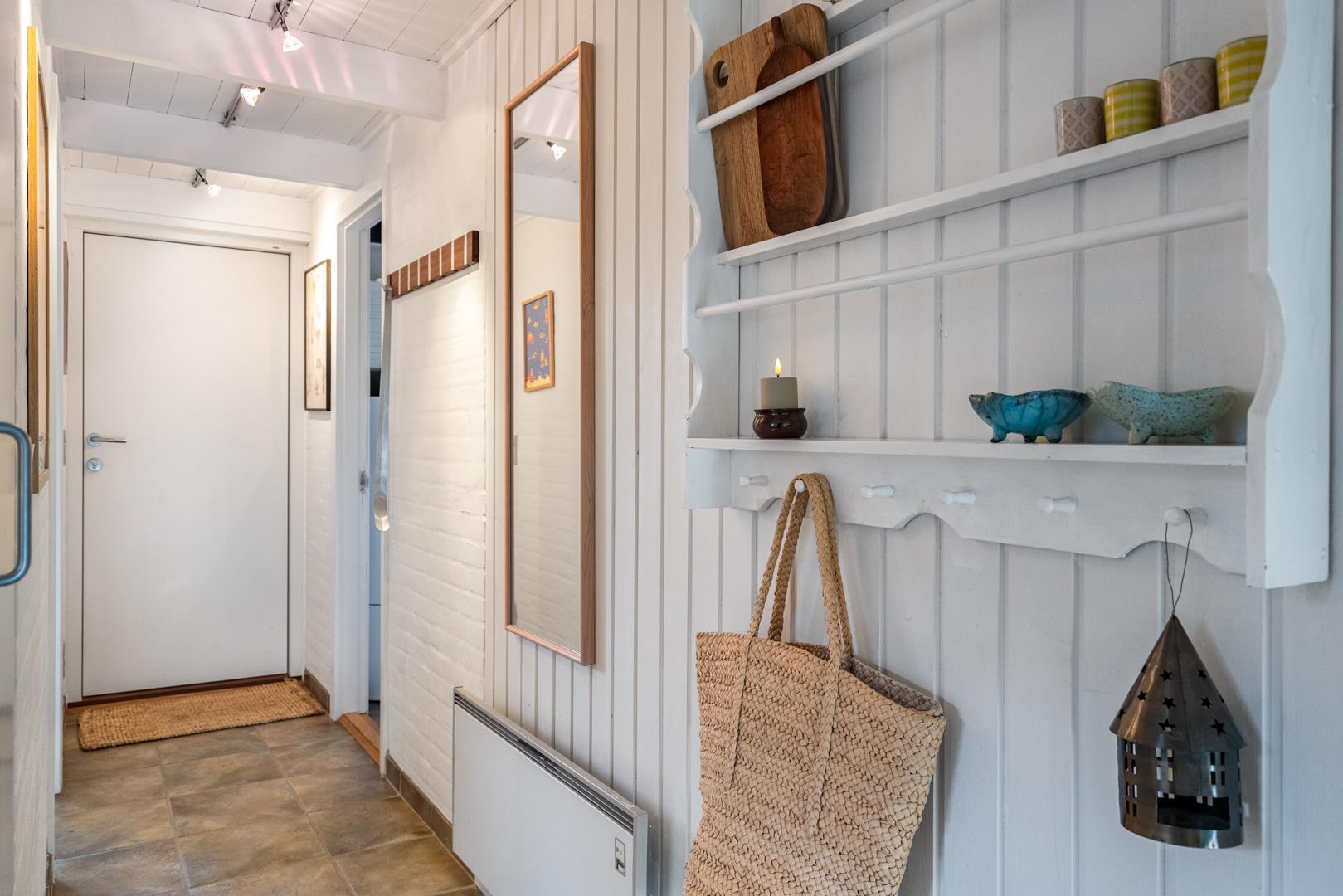 Huset er lyst og praktisk indrettet med køkken/alrum og direkte udgang til en delvist overdækket træterrasse med stor udendørs spa. Køleskabet er placeret i gangen – funktionelt og nemt tilgængeligt.