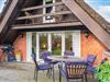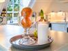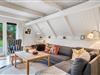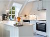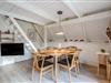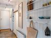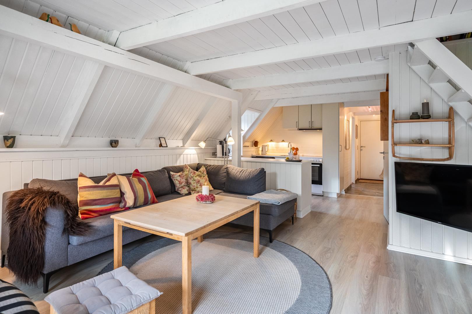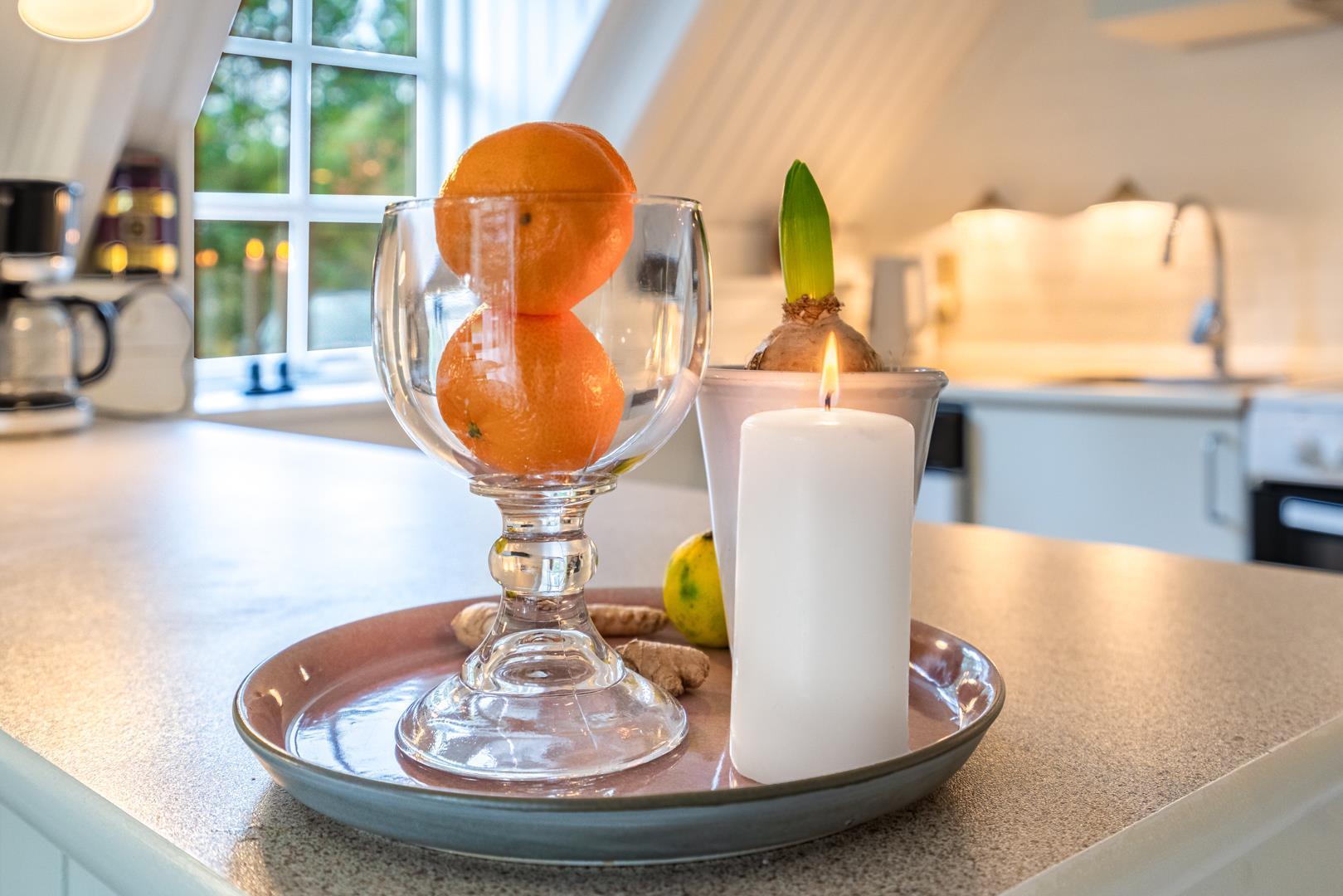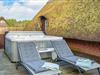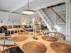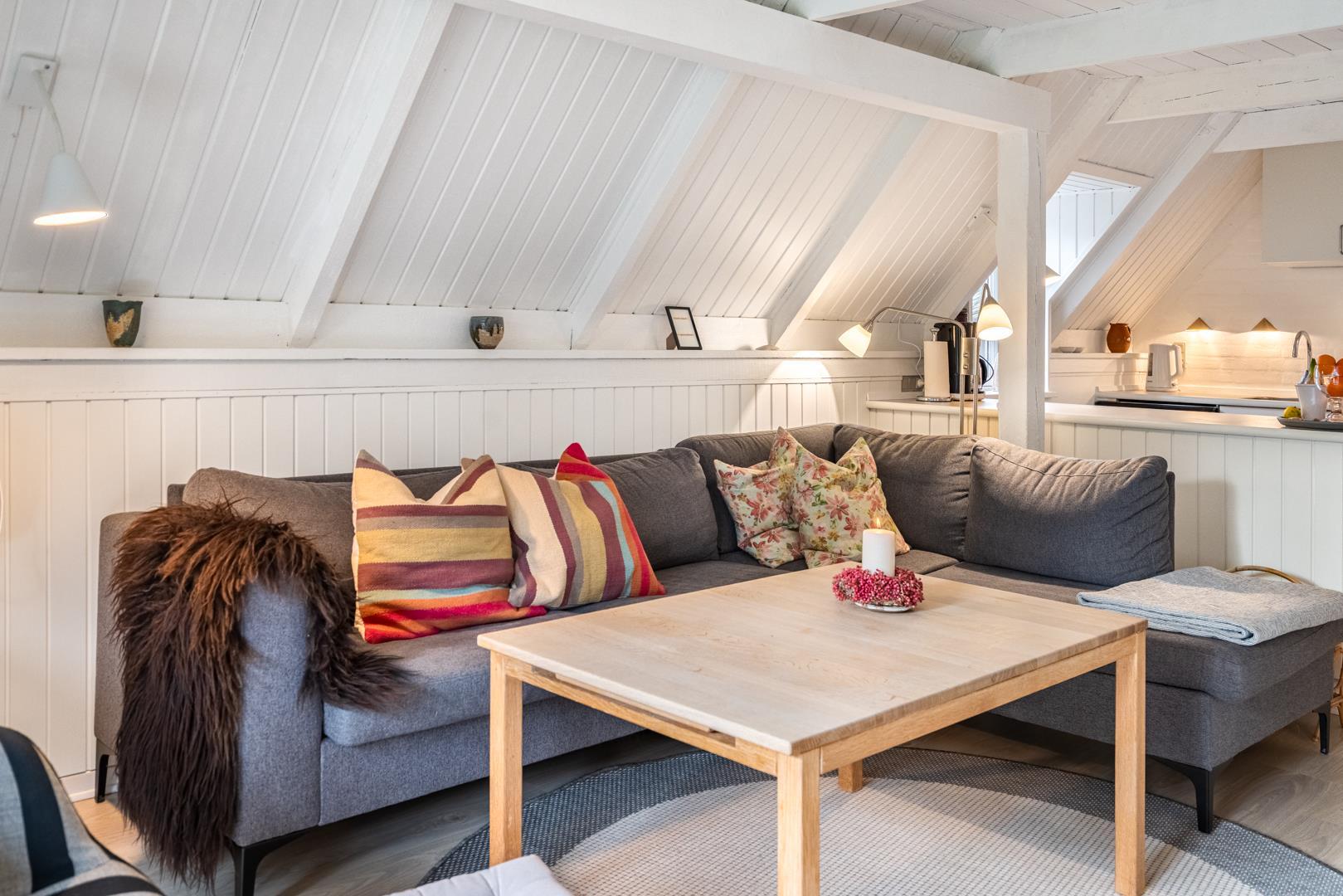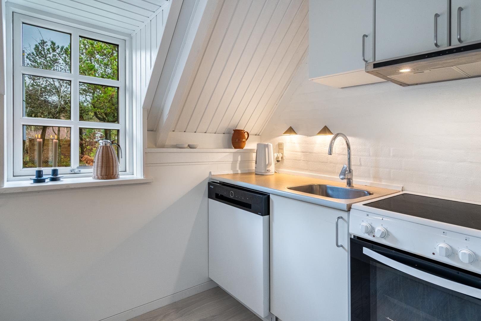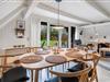 Huset er lyst og praktisk indrettet med køkken/alrum og direkte udgang til en delvist overdækket træterrasse med stor udendørs spa. Køleskabet er placeret i gangen – funktionelt og nemt tilgængeligt.