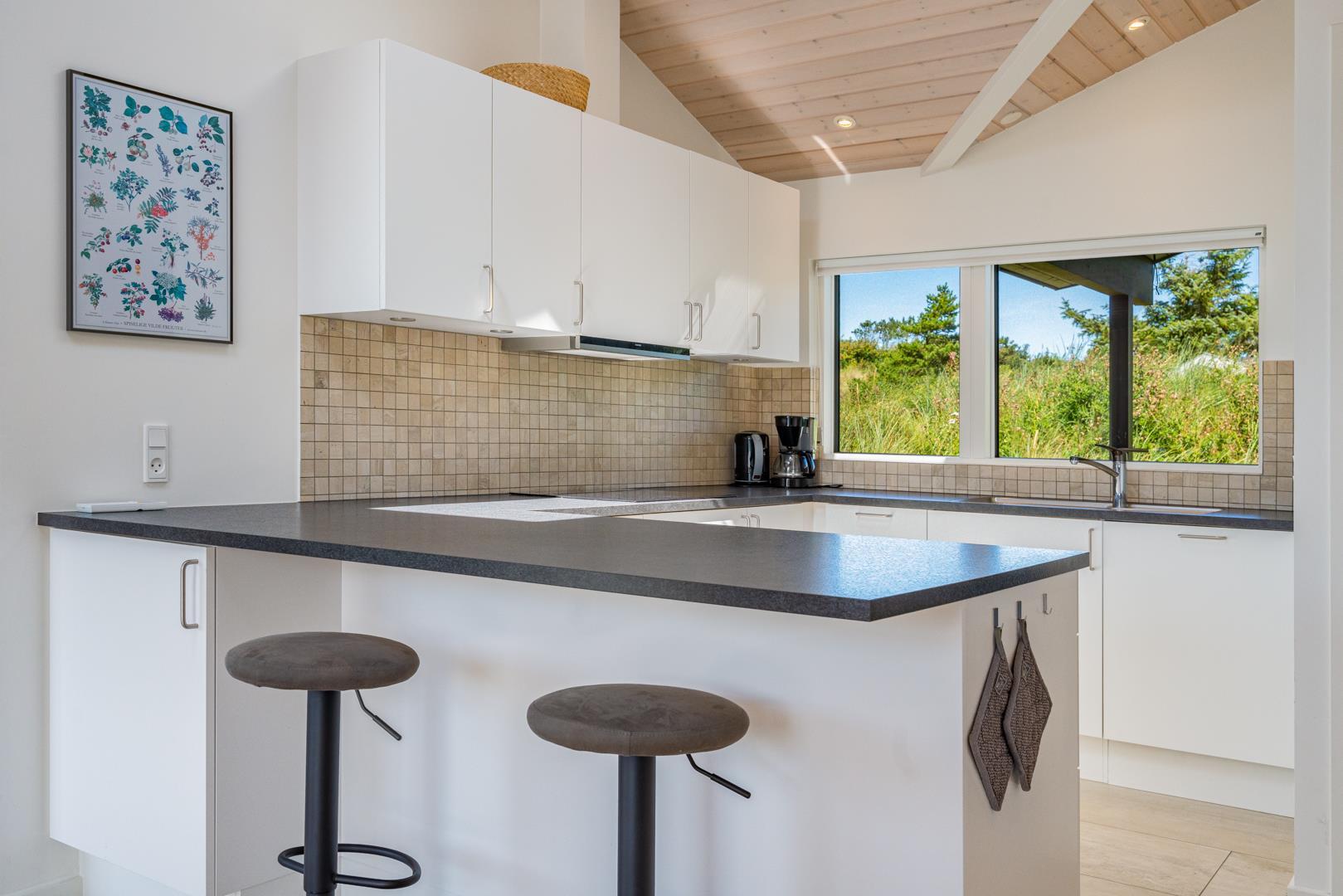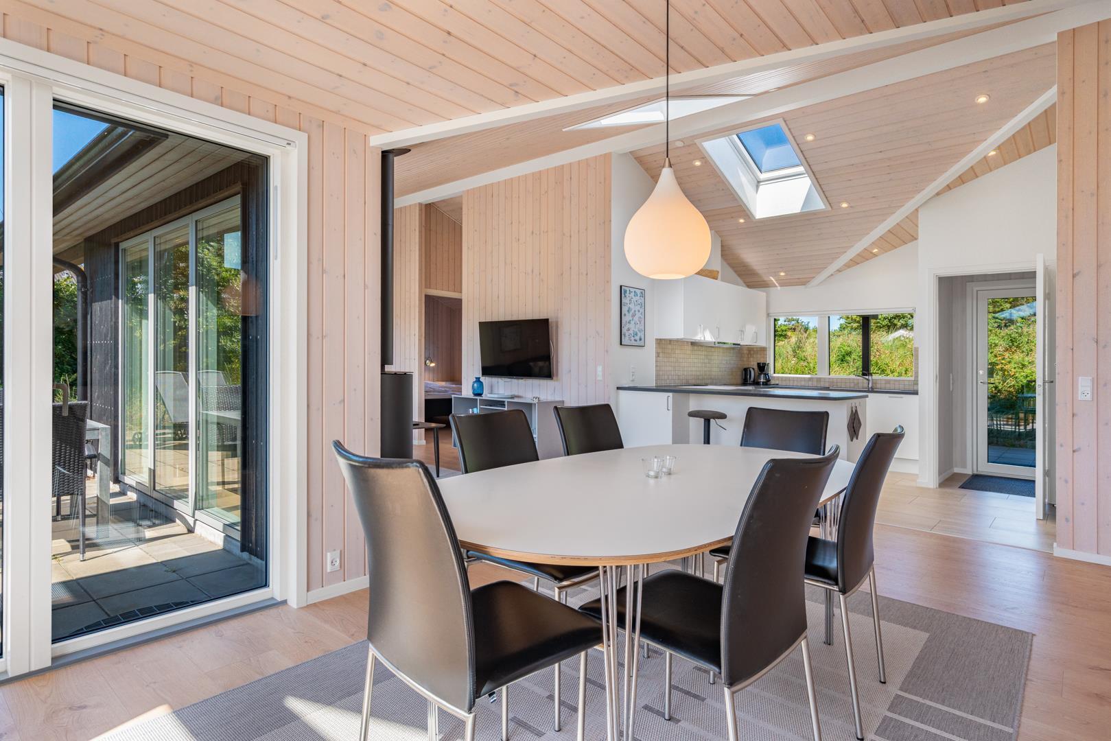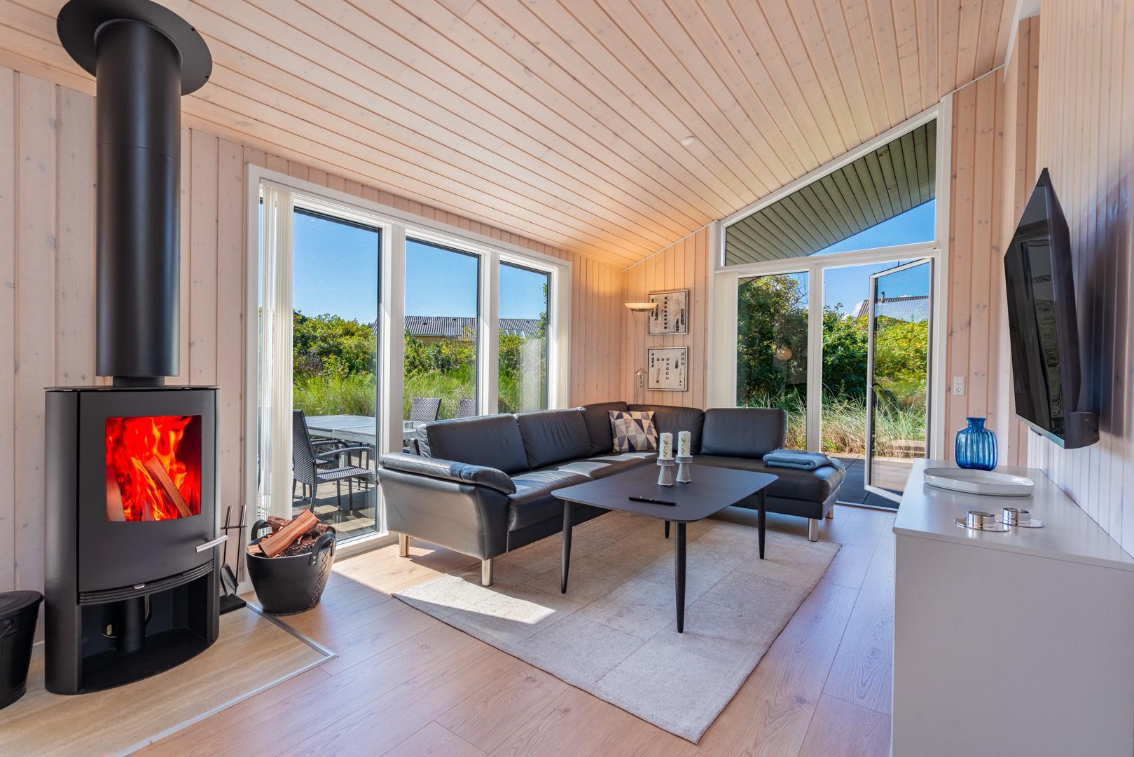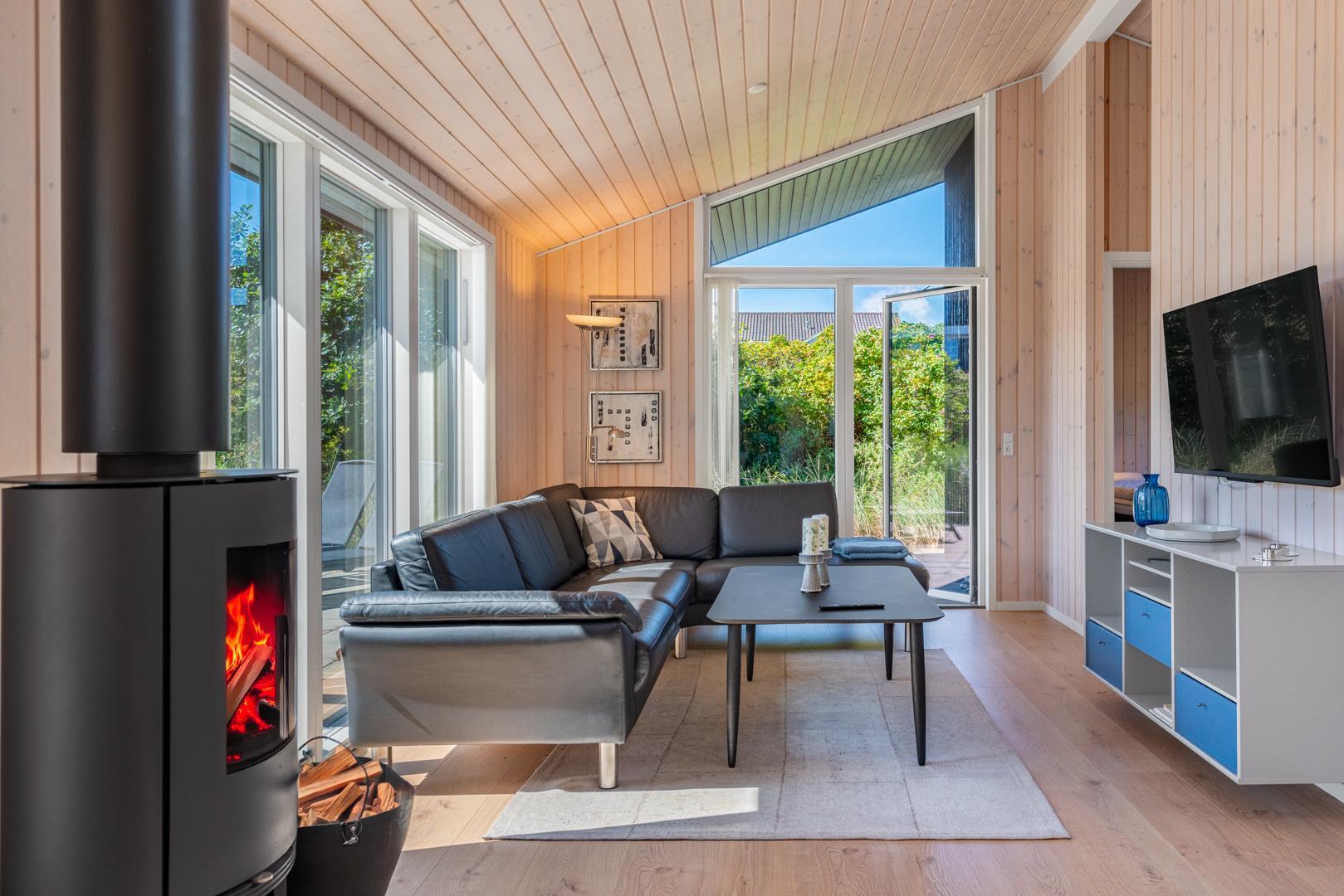 Feriehuset er opført i 2021 og byder på stort køkken som er i åben forbindelse med husets smagfuld indrettede stue/alrum. I opholdsrummet kan familien hygge sig med spil eller en god bog foran husets brændeovn. I køkkenalrummet er der ovenlysvinduer som givet et dejligt lysindfald ind i huset.