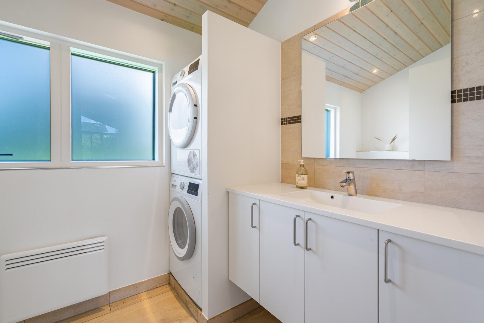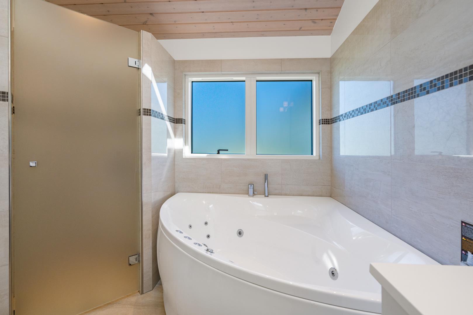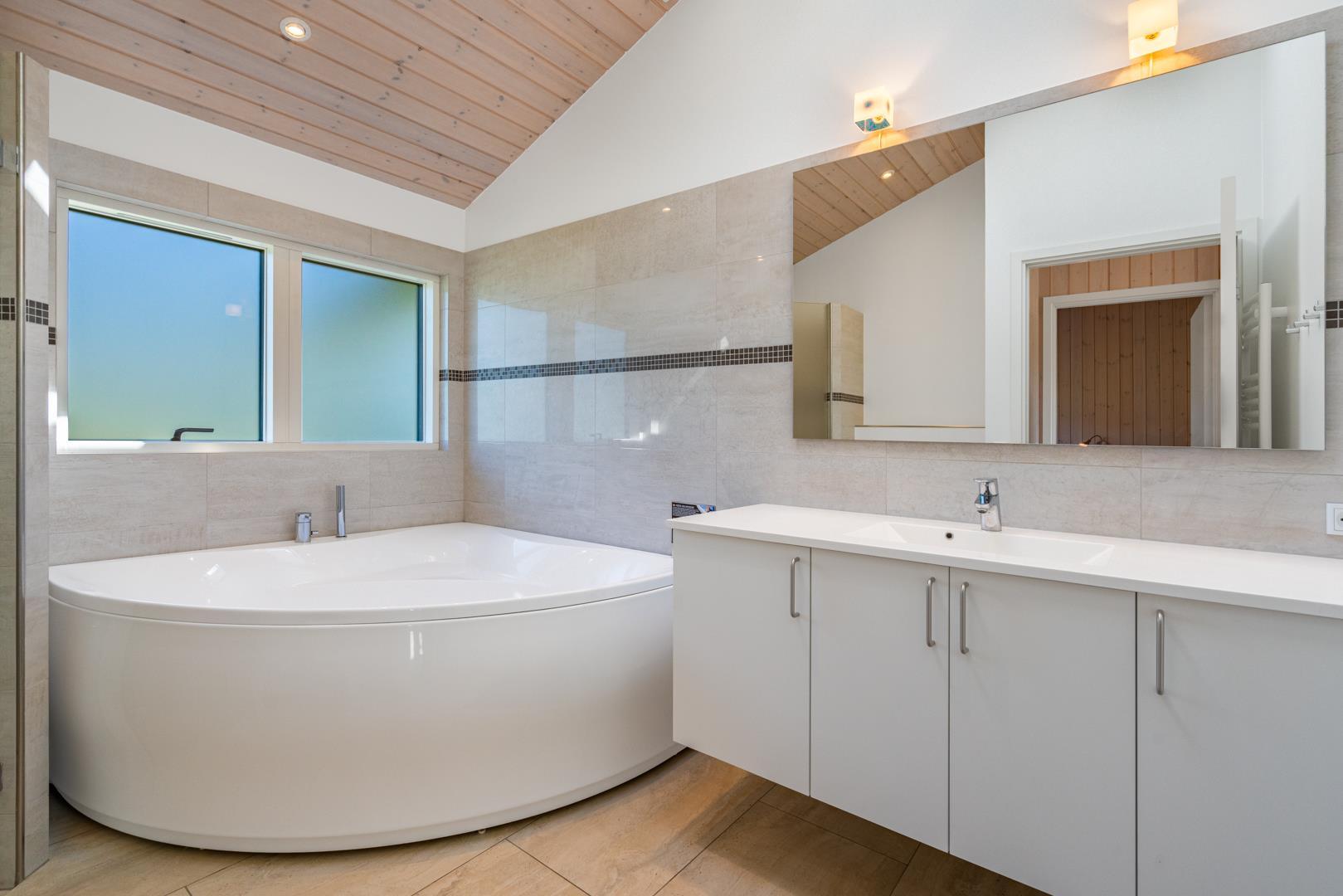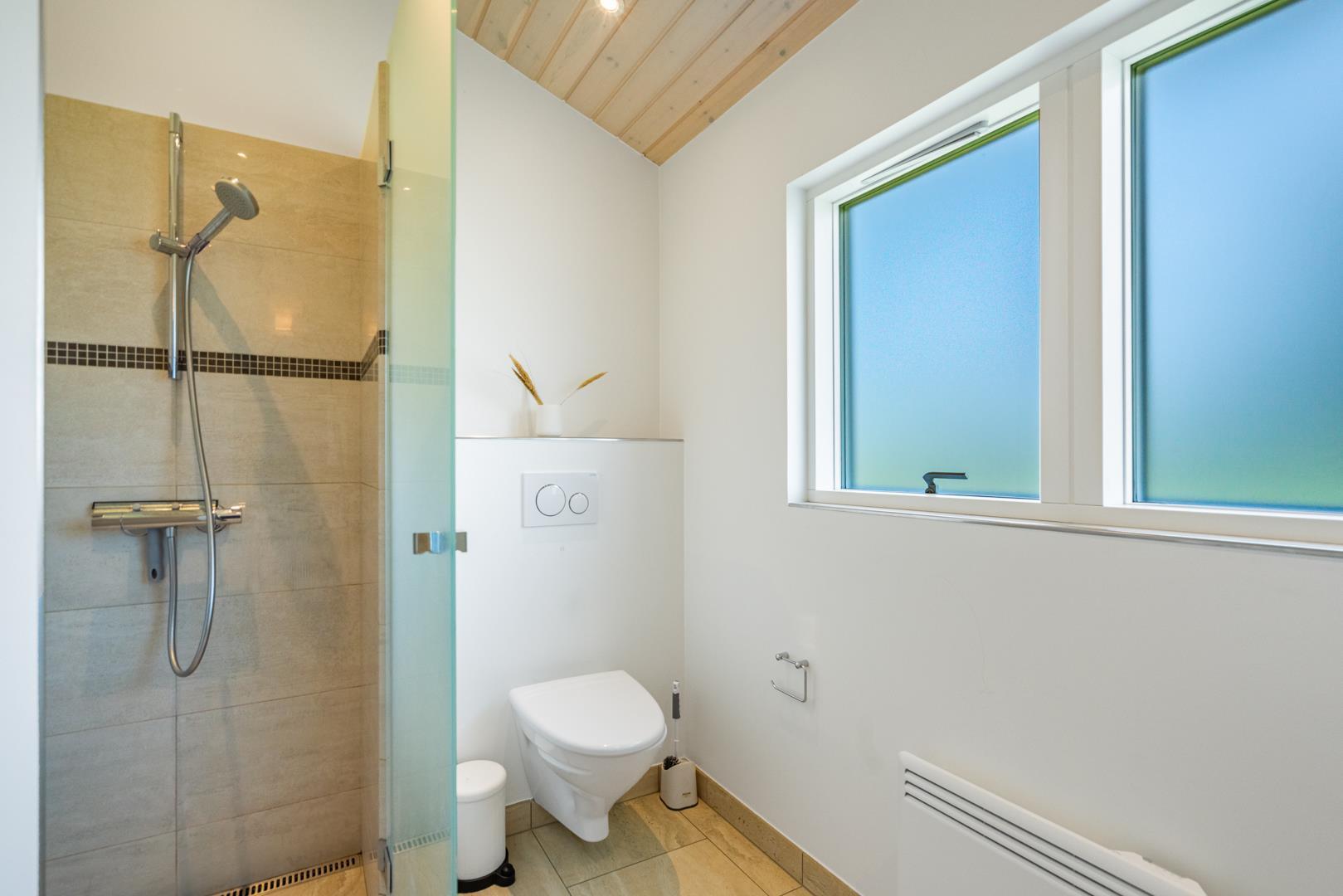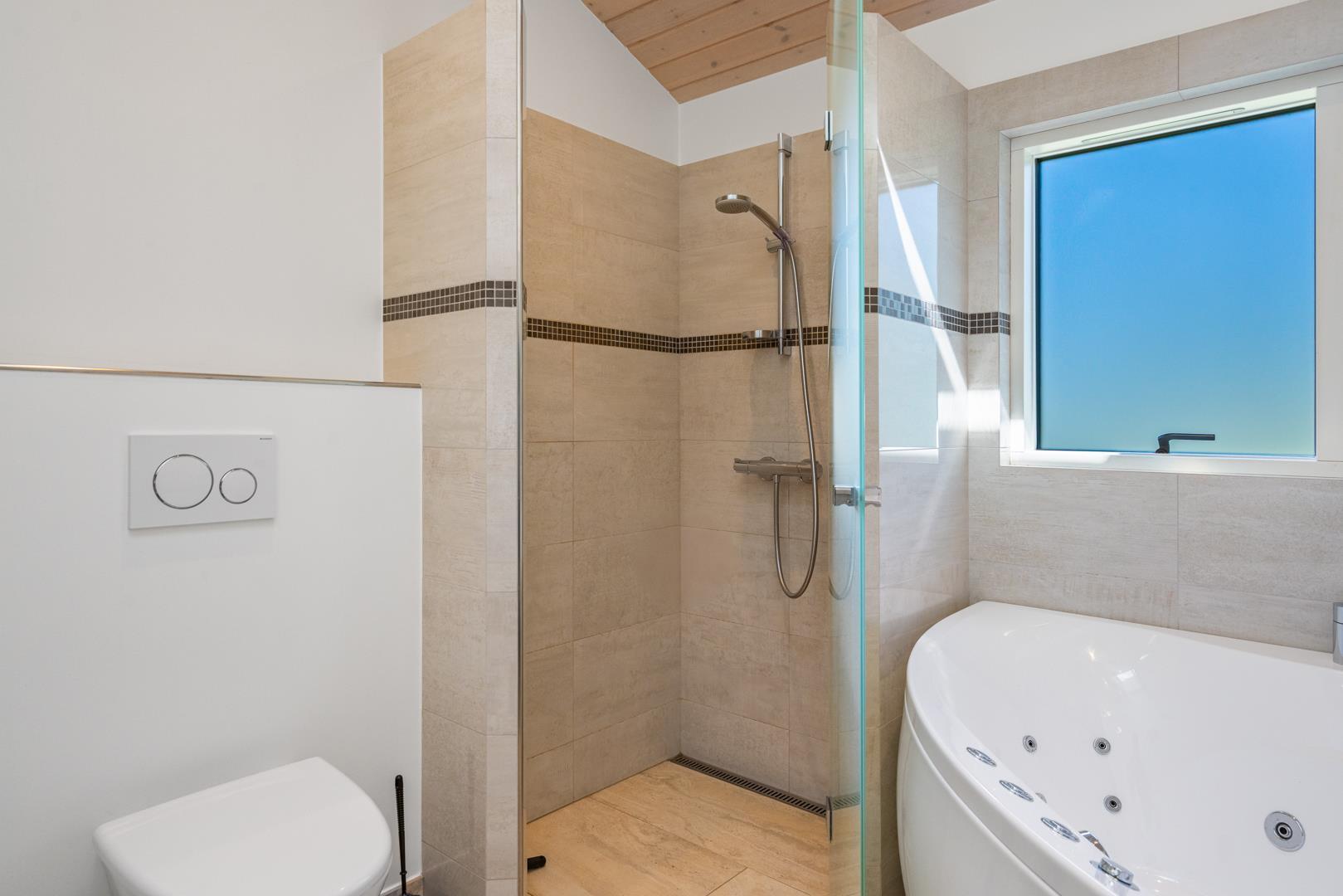 Huset har 2 flotte badeværelser med toilet og bruser, samt spabad i det store badeværelse, dertil kommer der 3 rummelige soverum med god skabsplads og TV i 2 af rummene.