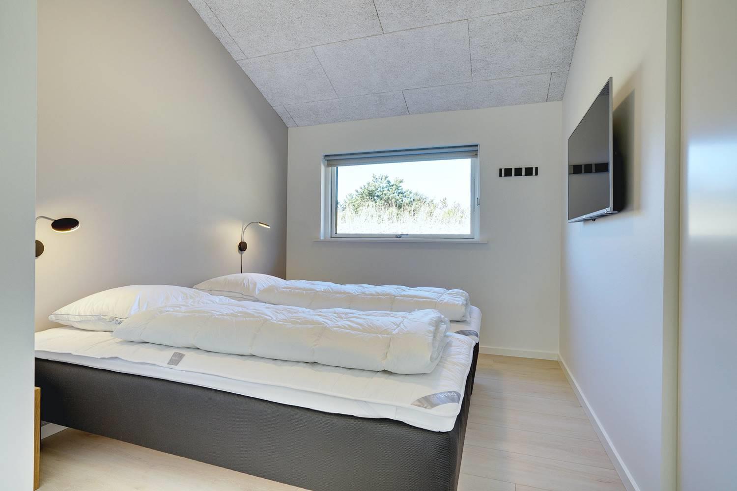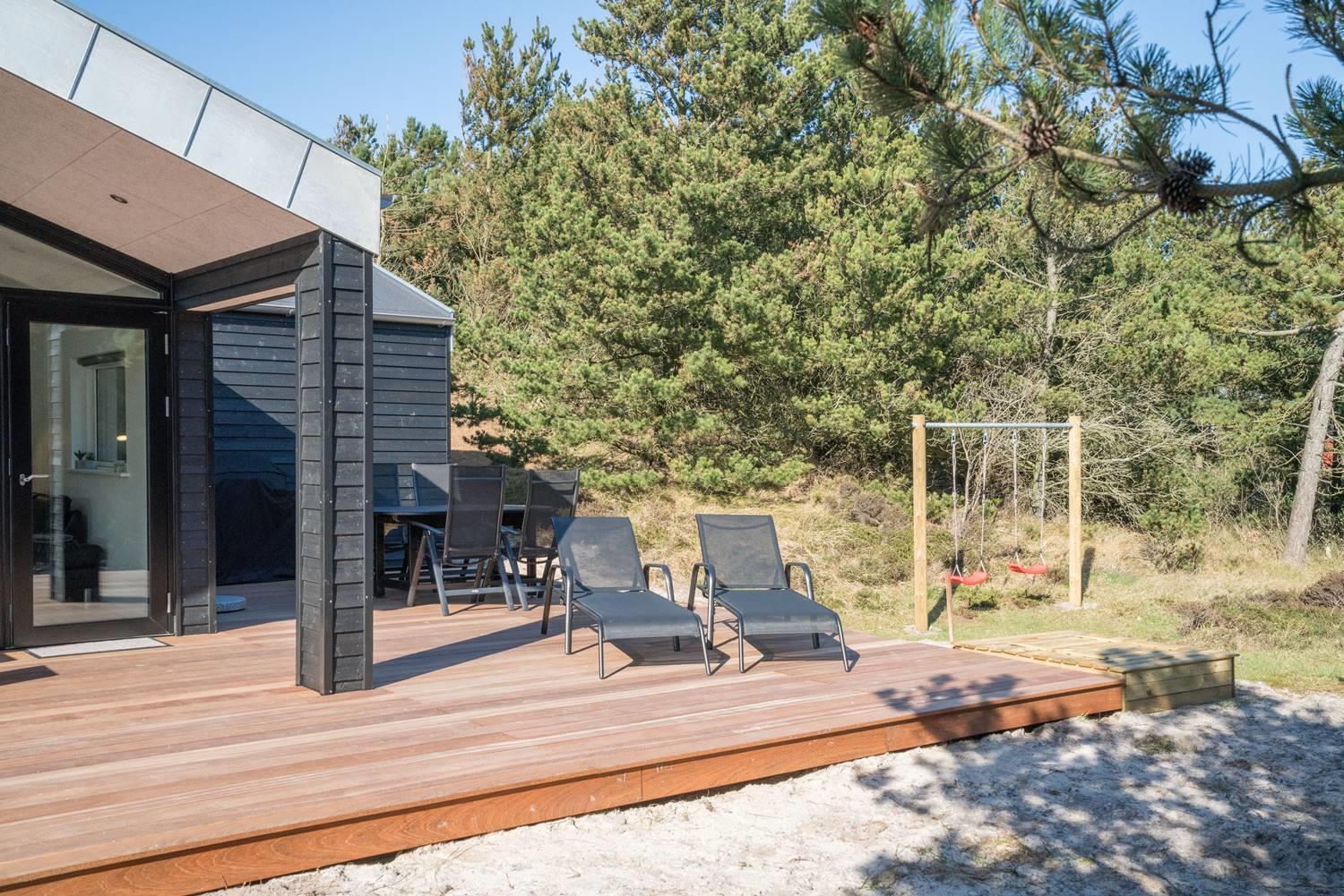 En hyggelig brændeovn, et stort fladskærms-TV og regnvandsbrusere er eksempler på nogle af de skønne indendørsfaciliteter, mens gyngestativ, sandkasse og liggestole er at finde udenfor. Sovepladser er der seks af i alt, og ingen skal sove i køjeseng, for der er dobbeltsenge i alle tre soverum.