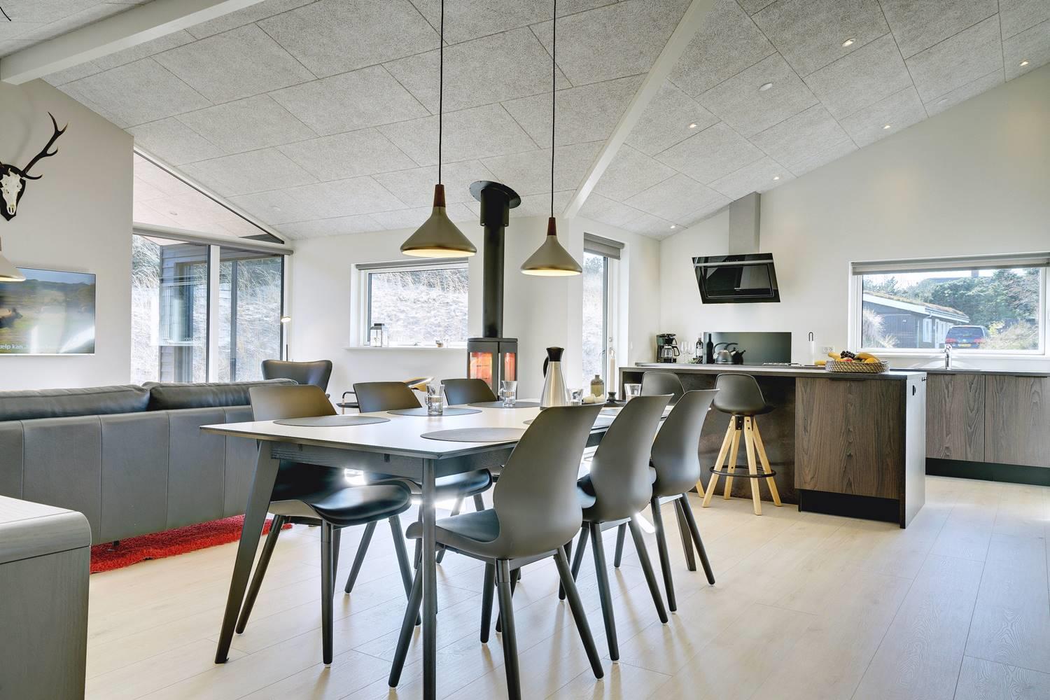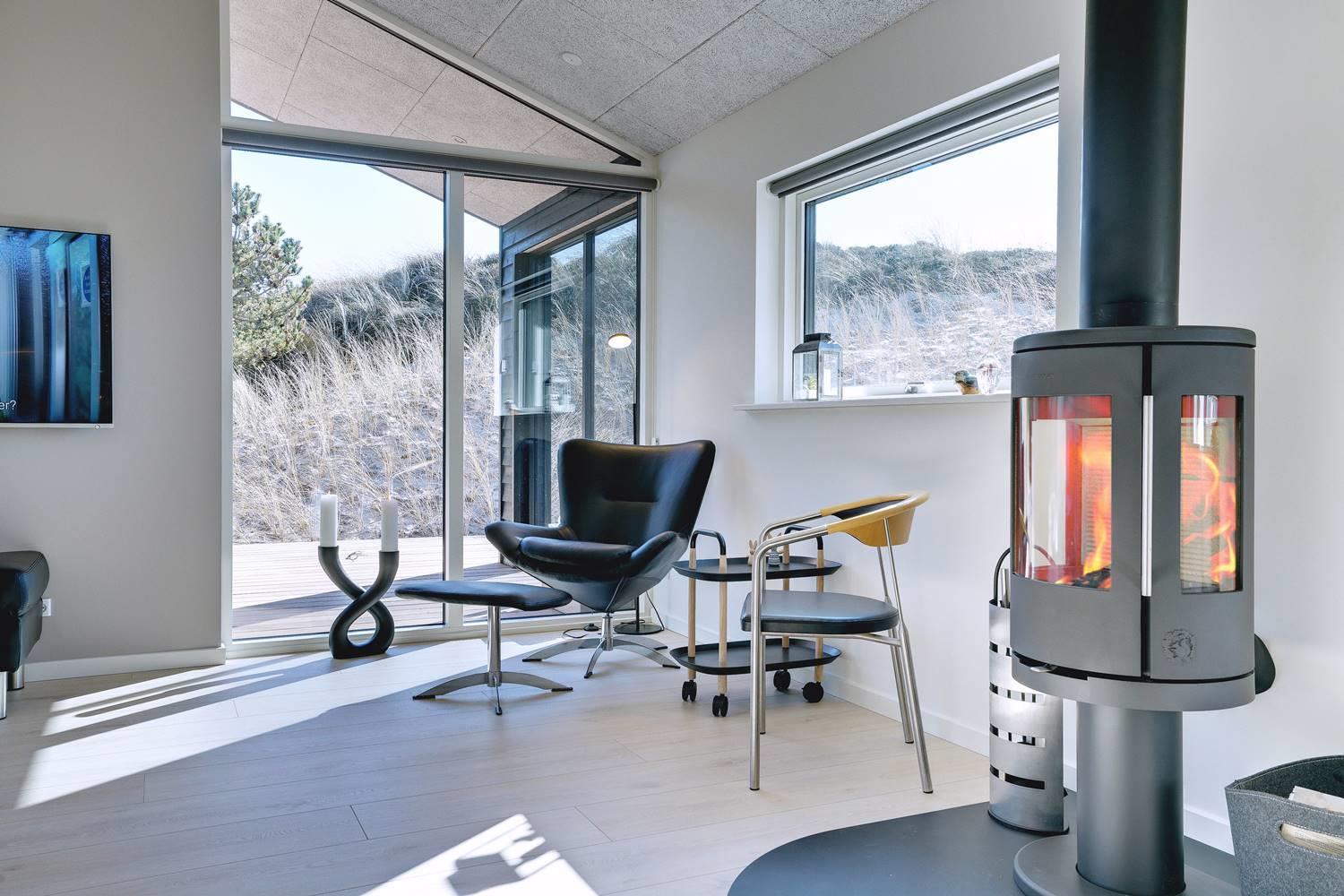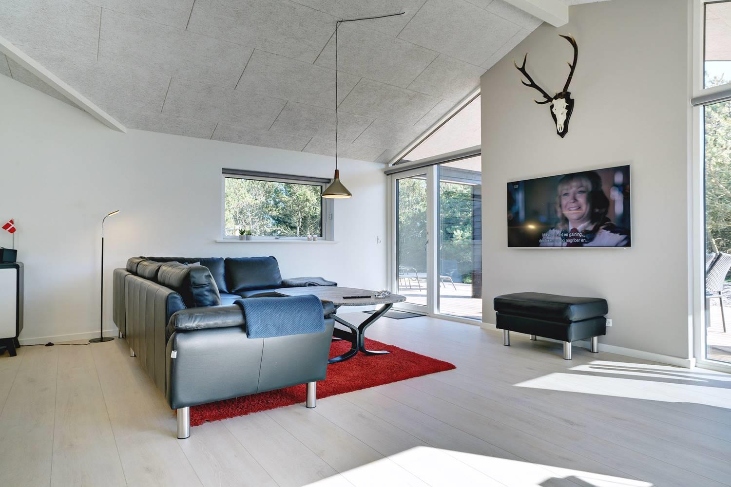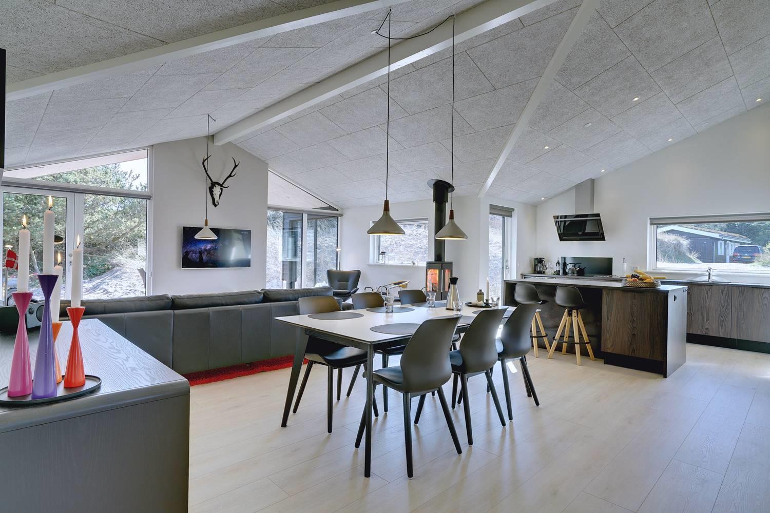 Husets store attraktion er det store opholdsrum, som giver jer de optimale rammer for feriehyggen uanset årstid. Her er både sørget for god akustik med Troldtektlofter og et helt fantastisk lysindfald gennem glaspartier mod alle fire verdenshjørner.