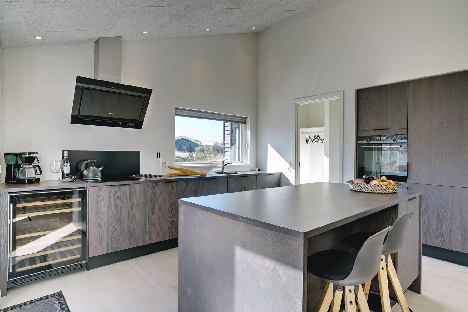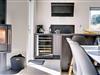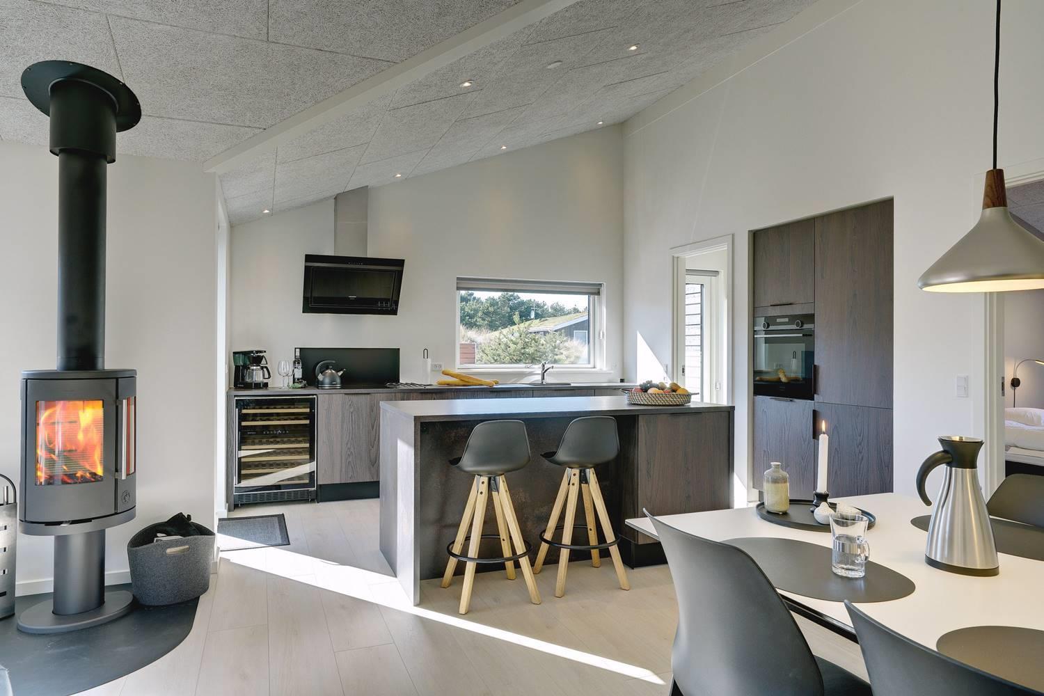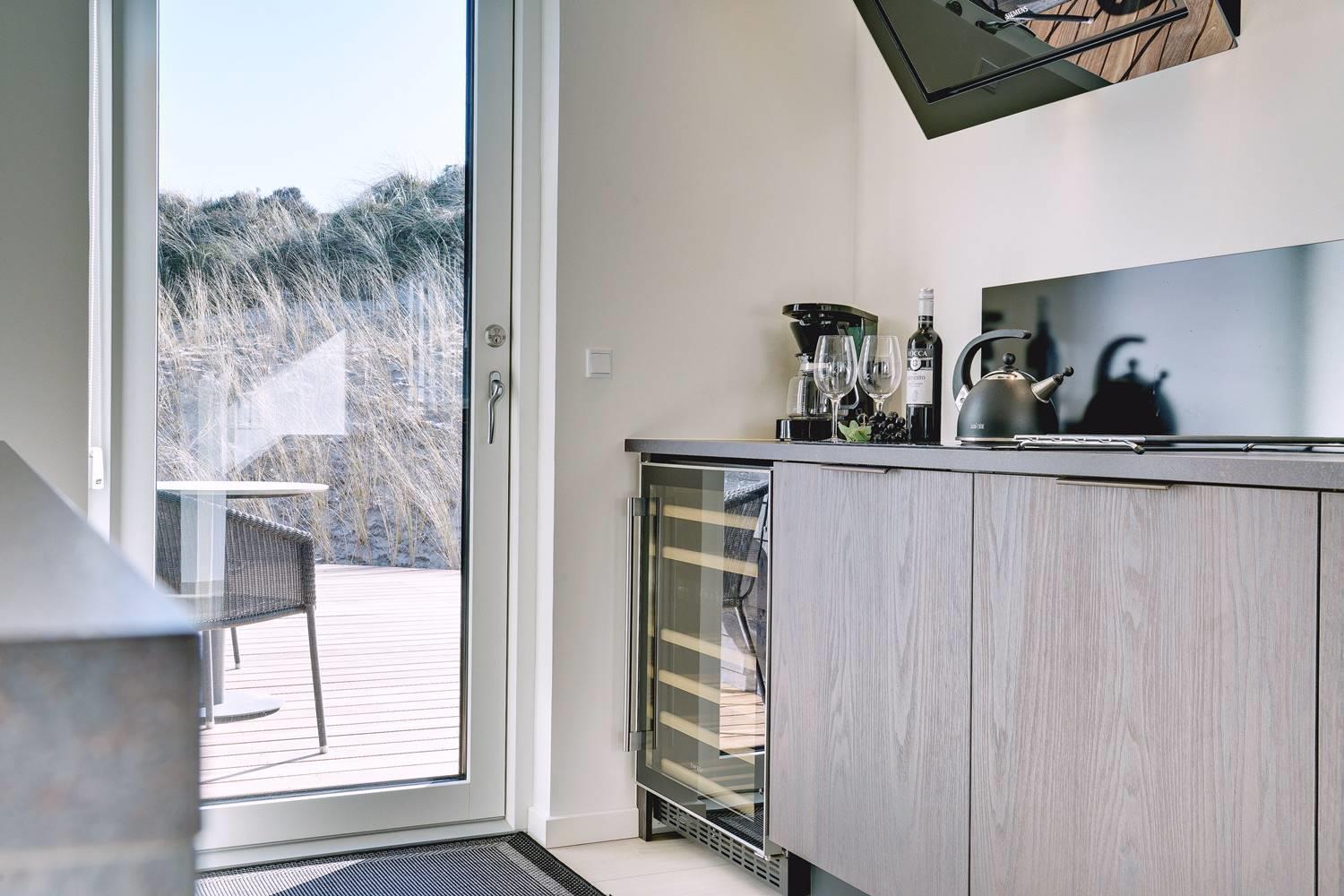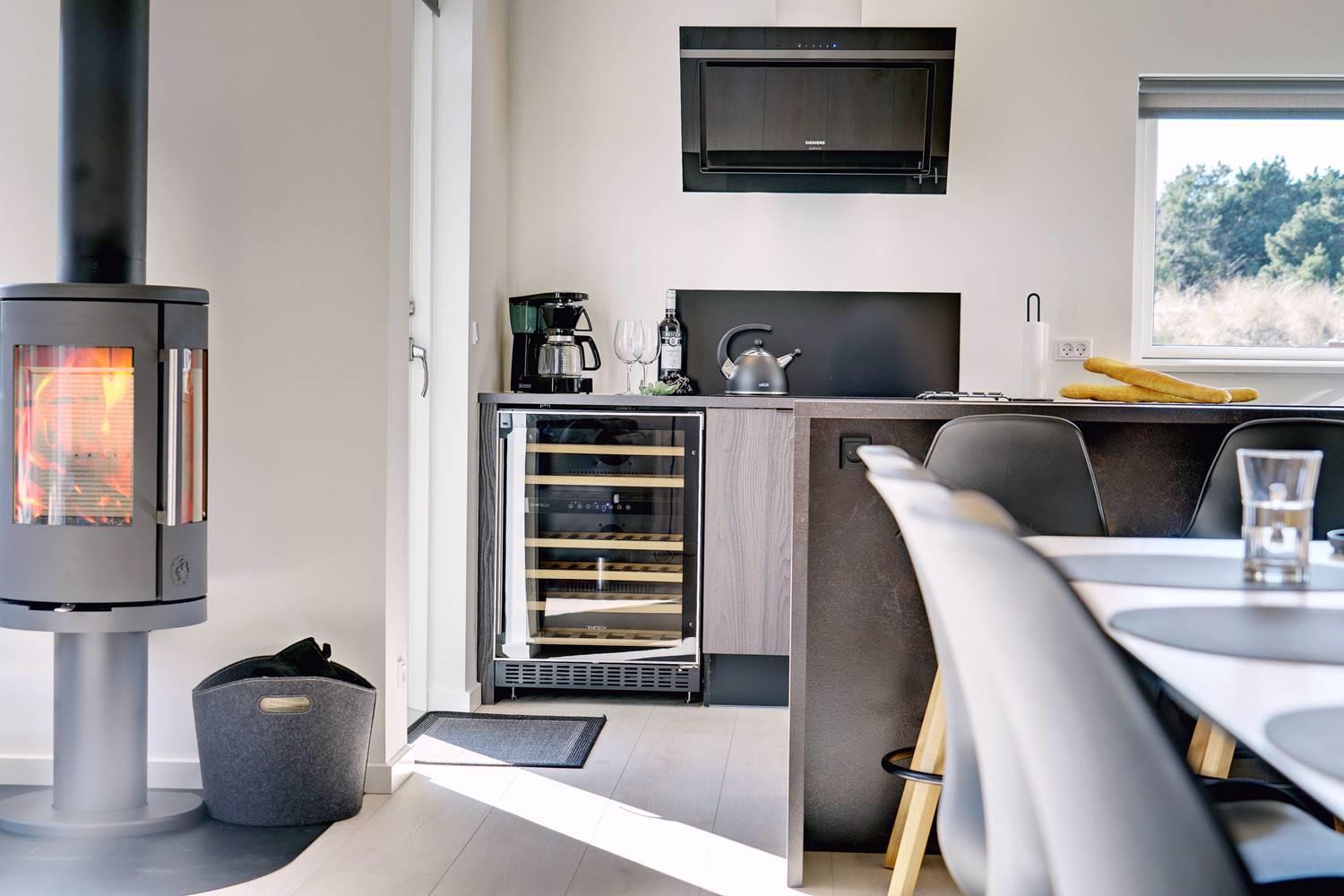 Feriens måltider tilberedes i det elegante køkken, og dem, der ikke jonglerer med potter og pander, kan slå sig ned ved køkkenøens lille spisedisk og nyde et glas perfekt tempereret vin direkte fra vinkøleskabet.