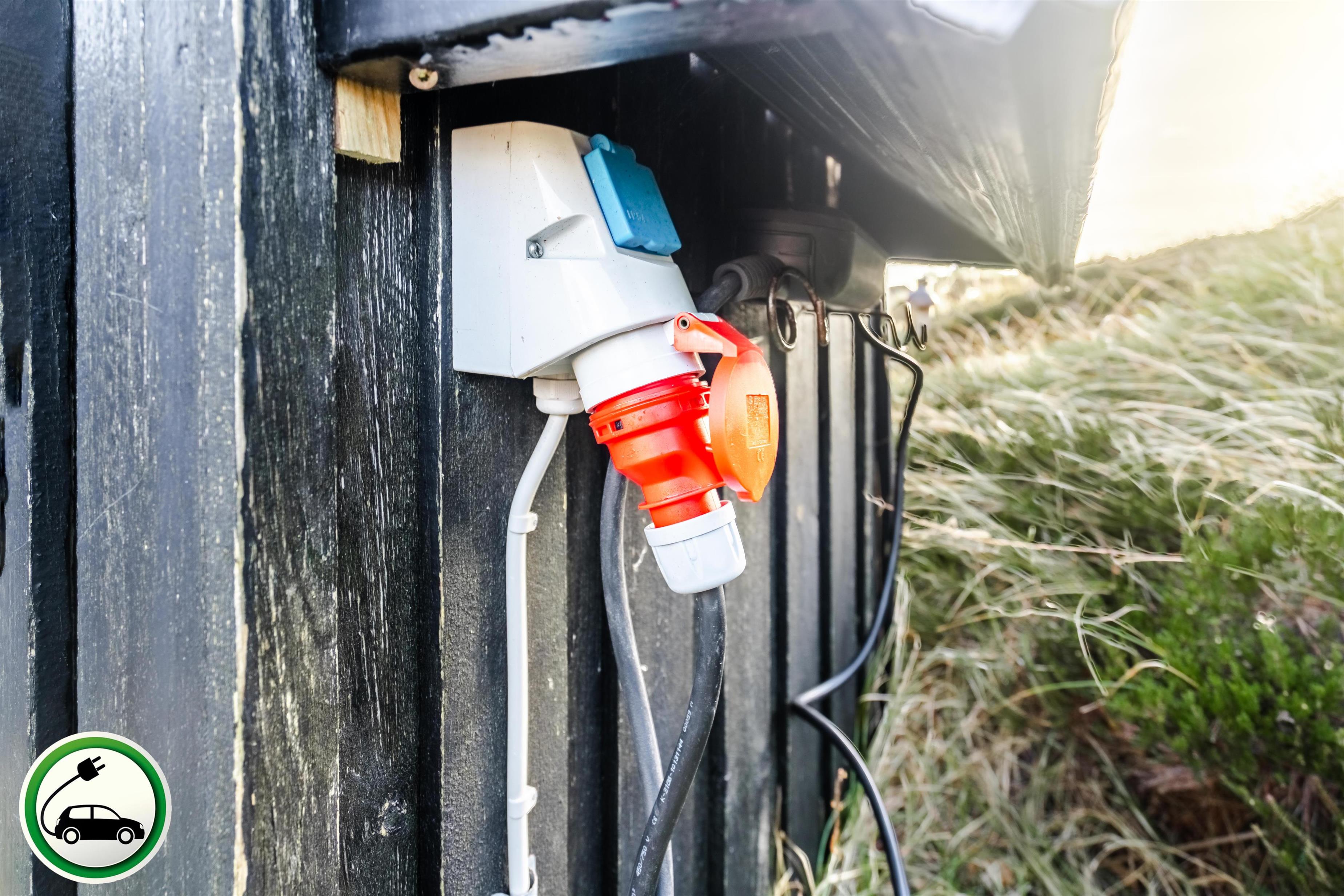 Huset har også en opladningsmulighed til elbiler med rødt CEE stikl), så du trygt kan lade bilen op under dit ophold.