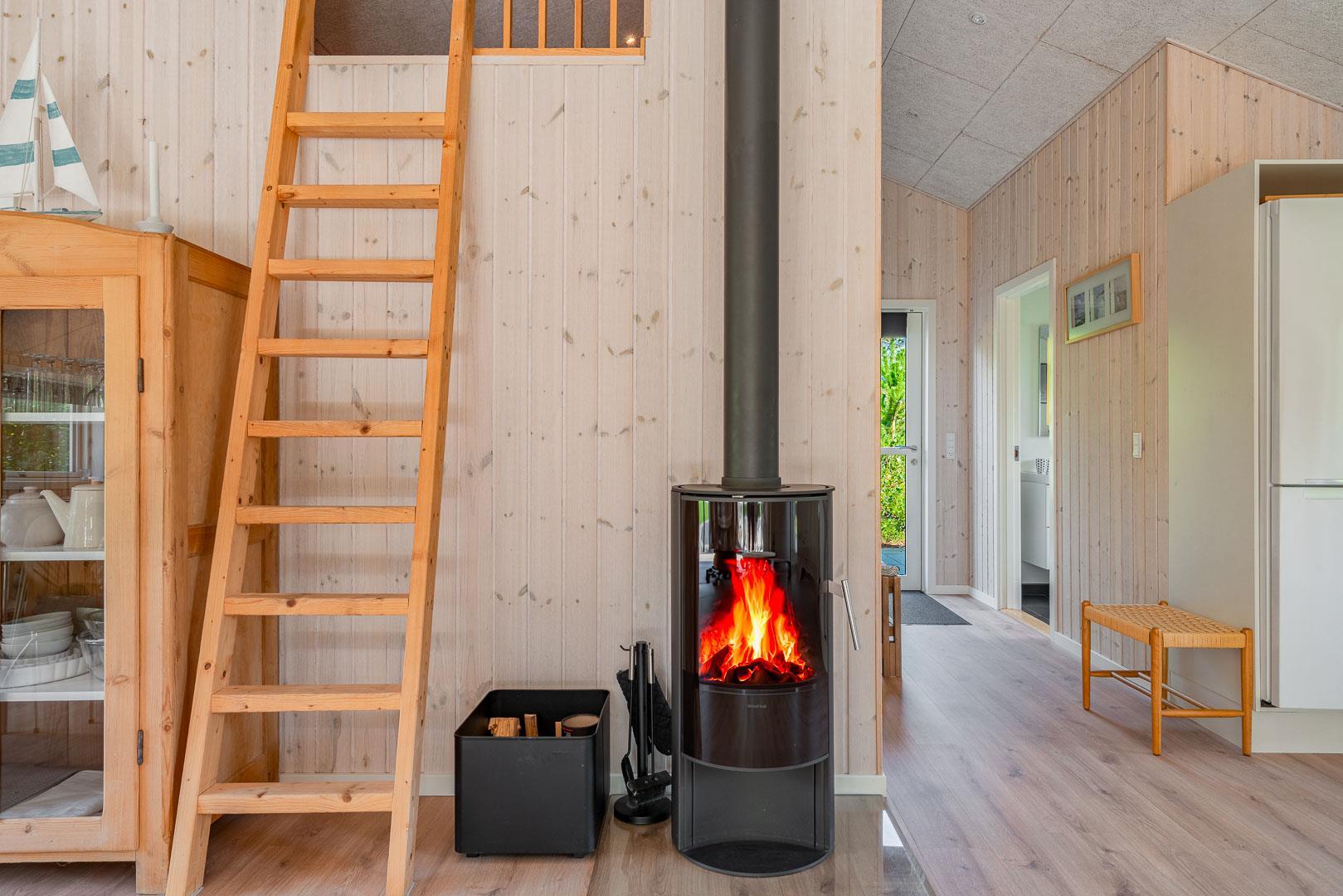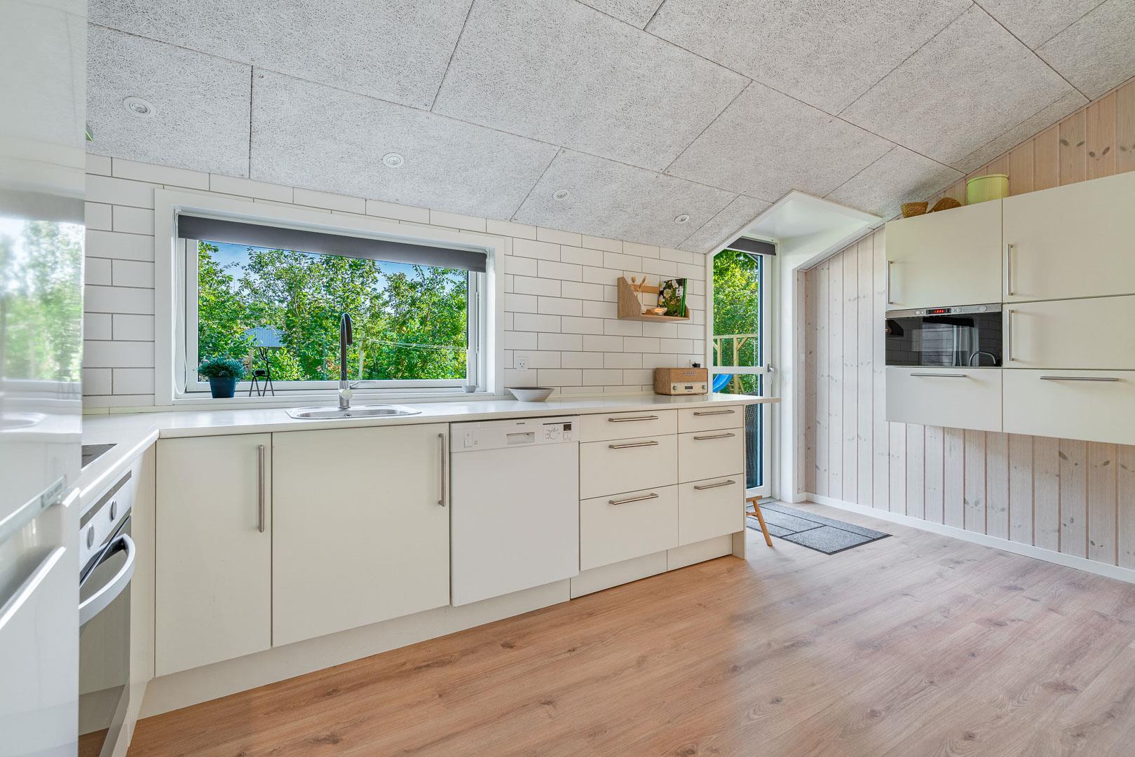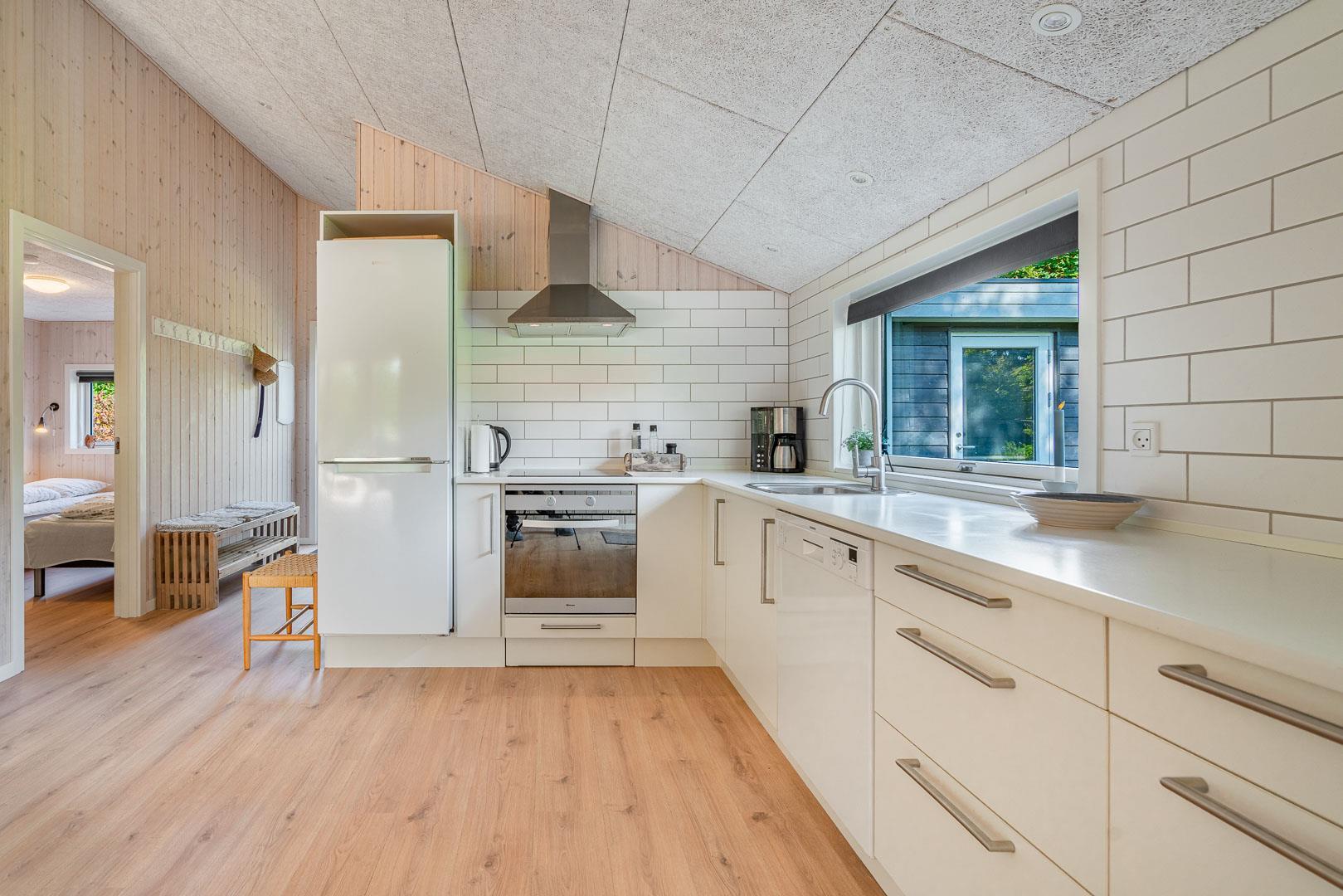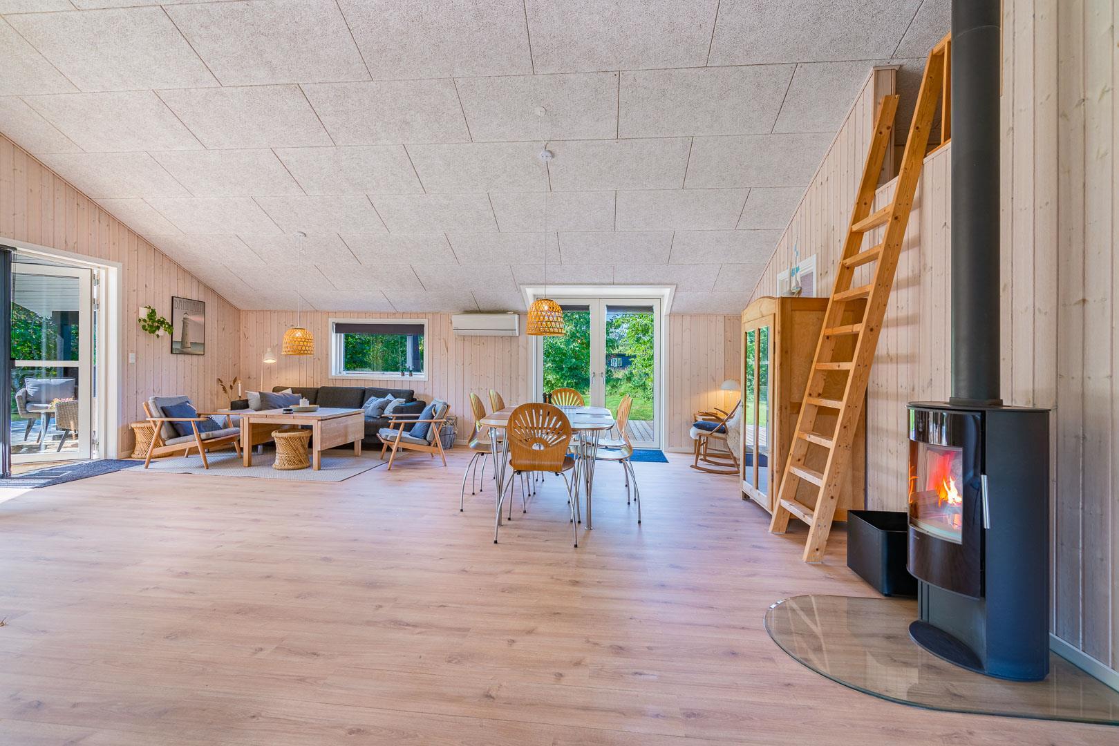 Træd ind i det lyse køkken, der ligger i forbindelse med stuen og skaber et dejligt rum for hele familien. Fra stuen er der udgang til den store lækre træterrasse, der omfavner det meste af sommerhuset og giver rig mulighed for udendørs afslapning og hygge – slap af i solen på liggestolene, nyd en god kop kaffe i loungemøblerne under den overdækkede terrasse eller spis aftensmaden under åben himmel. Nyd synet af flammerne fra den centrale brændeovn, der spreder varme og stemning både i stuen og køkkenet.