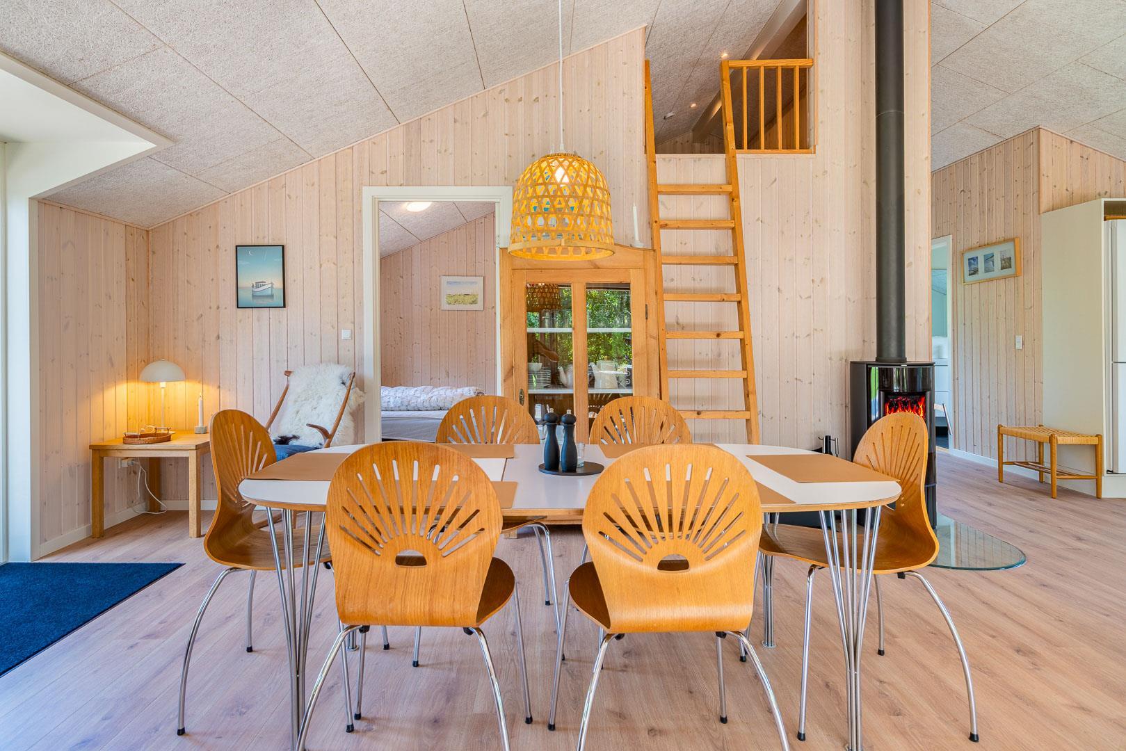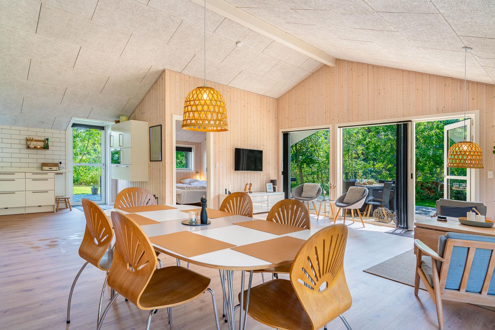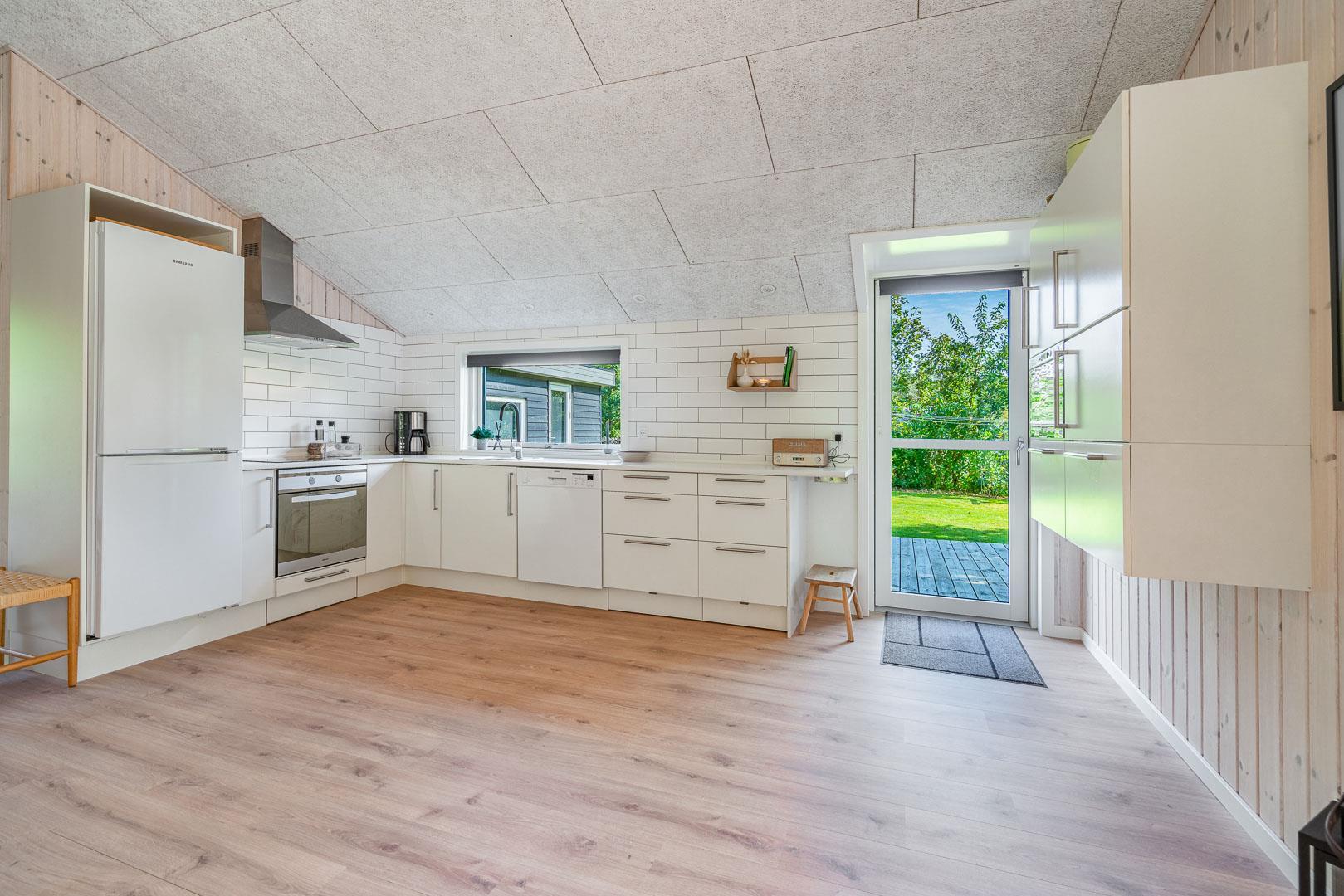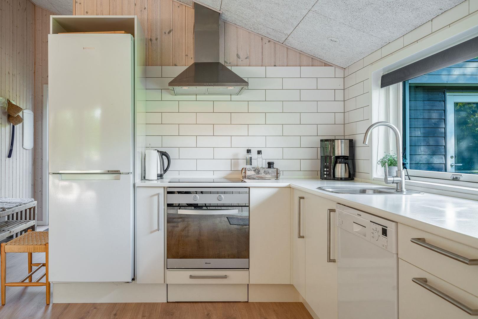 Træd ind i det lyse køkken, der ligger i forbindelse med stuen og skaber et dejligt rum for hele familien. Fra stuen er der udgang til den store lækre træterrasse, der omfavner det meste af sommerhuset og giver rig mulighed for udendørs afslapning og hygge – slap af i solen på liggestolene, nyd en god kop kaffe i loungemøblerne under den overdækkede terrasse eller spis aftensmaden under åben himmel. Nyd synet af flammerne fra den centrale brændeovn, der spreder varme og stemning både i stuen og køkkenet.